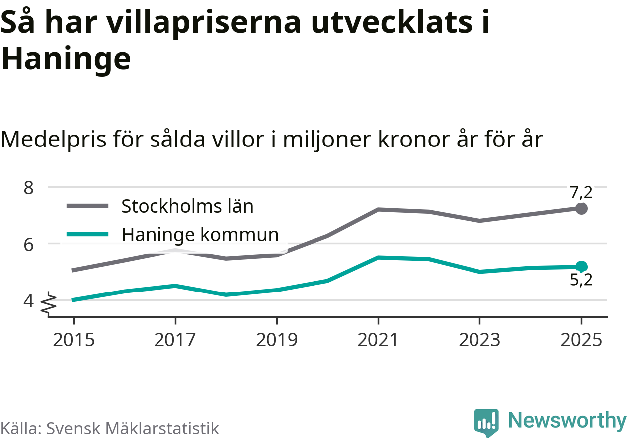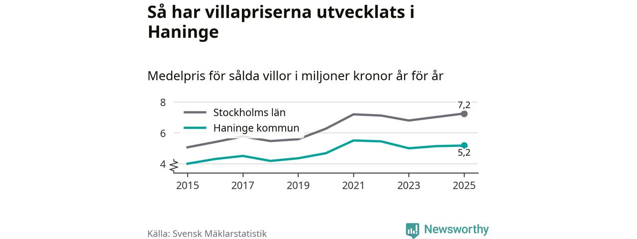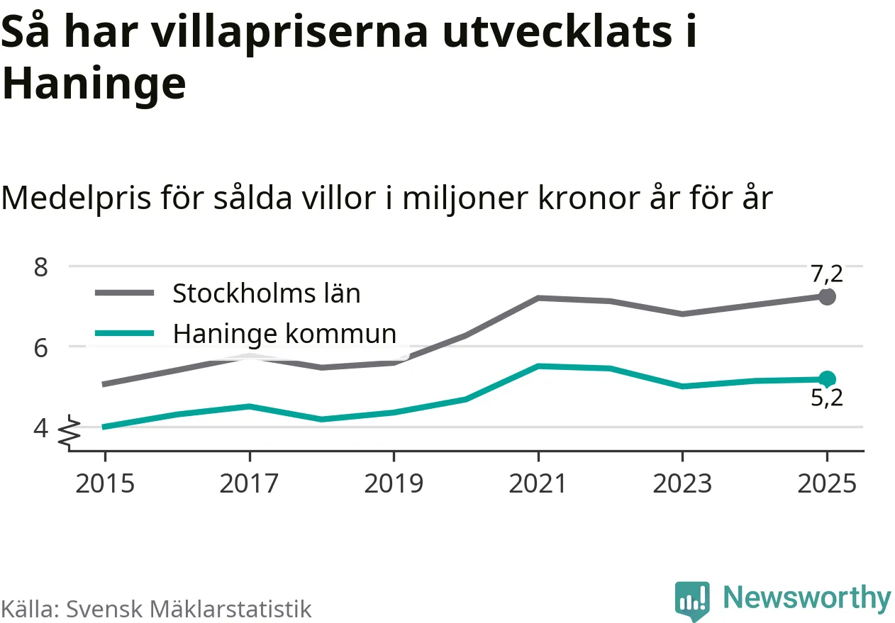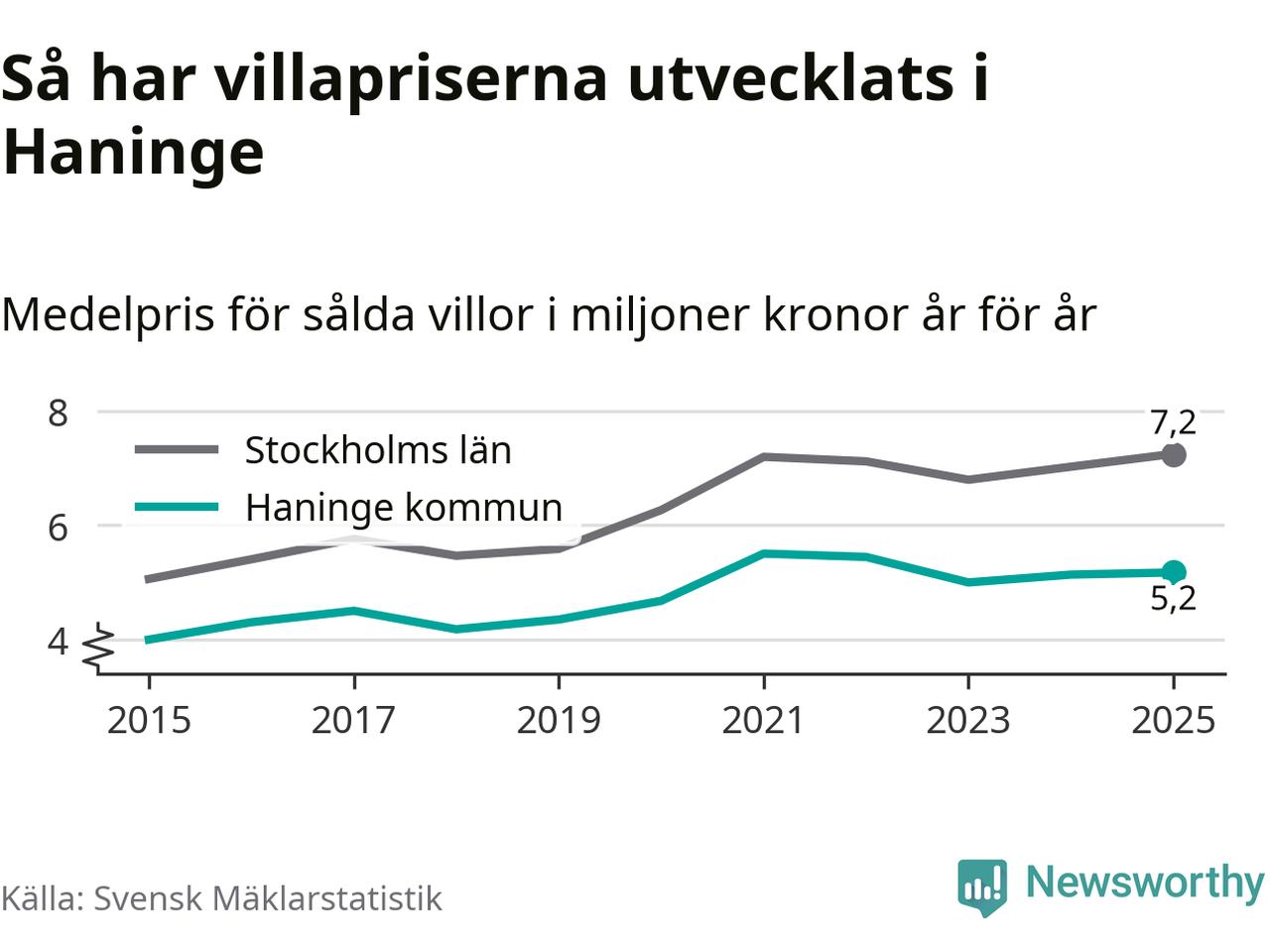 5,2 miljoner kronor är medelpriset för de villor som såldes i Haninge kommun under året, eller 44 164 kronor per kvadratmeter. Det innebär att priserna har legat i stort sett stilla sedan förra året.