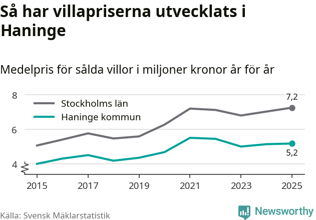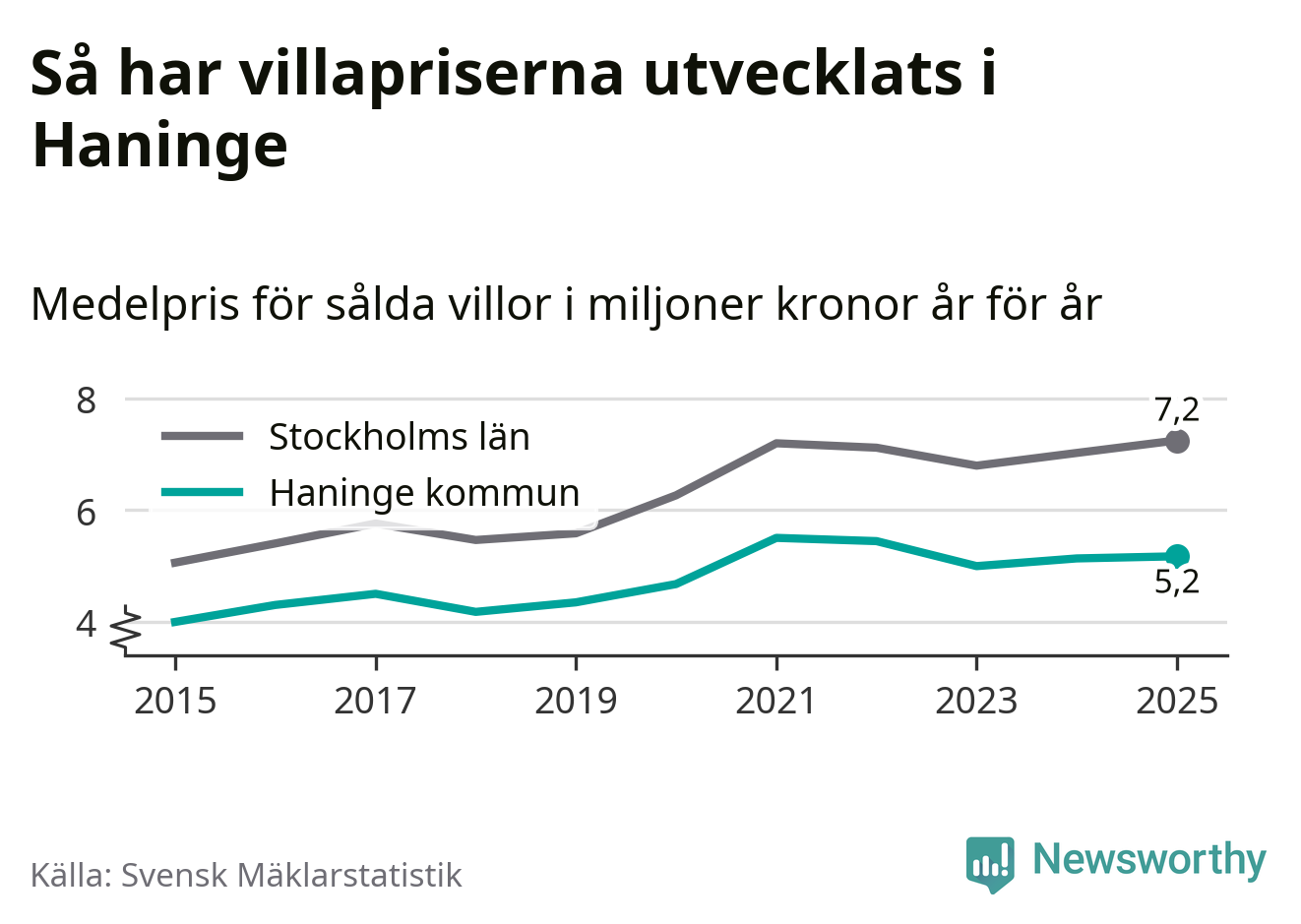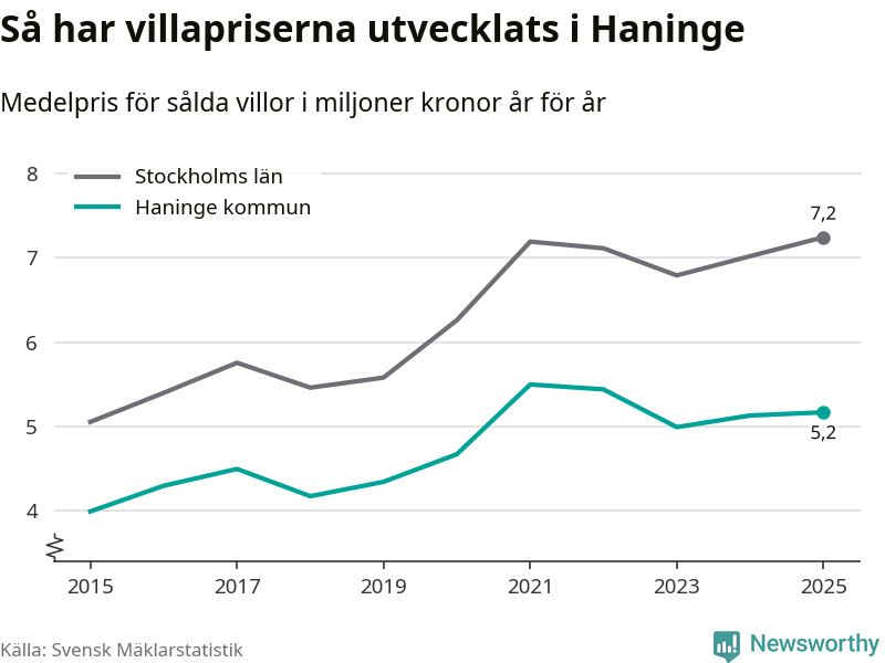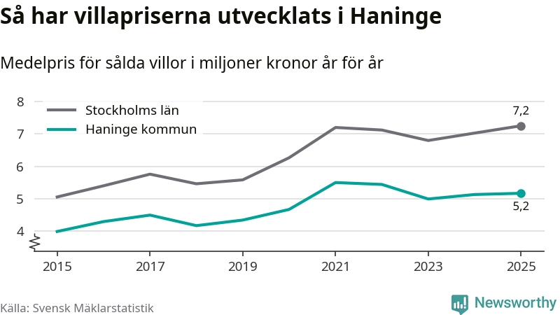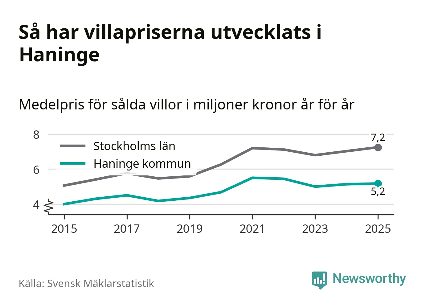 5,2 miljoner kronor är medelpriset för de villor som såldes i Haninge kommun under året, eller 44 164 kronor per kvadratmeter. Det innebär att priserna har legat i stort sett stilla sedan förra året.