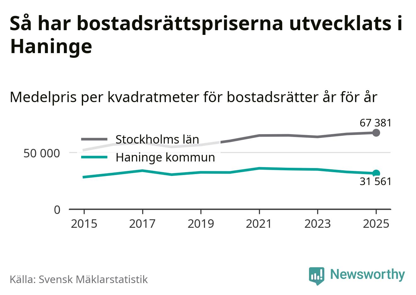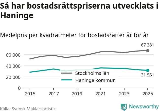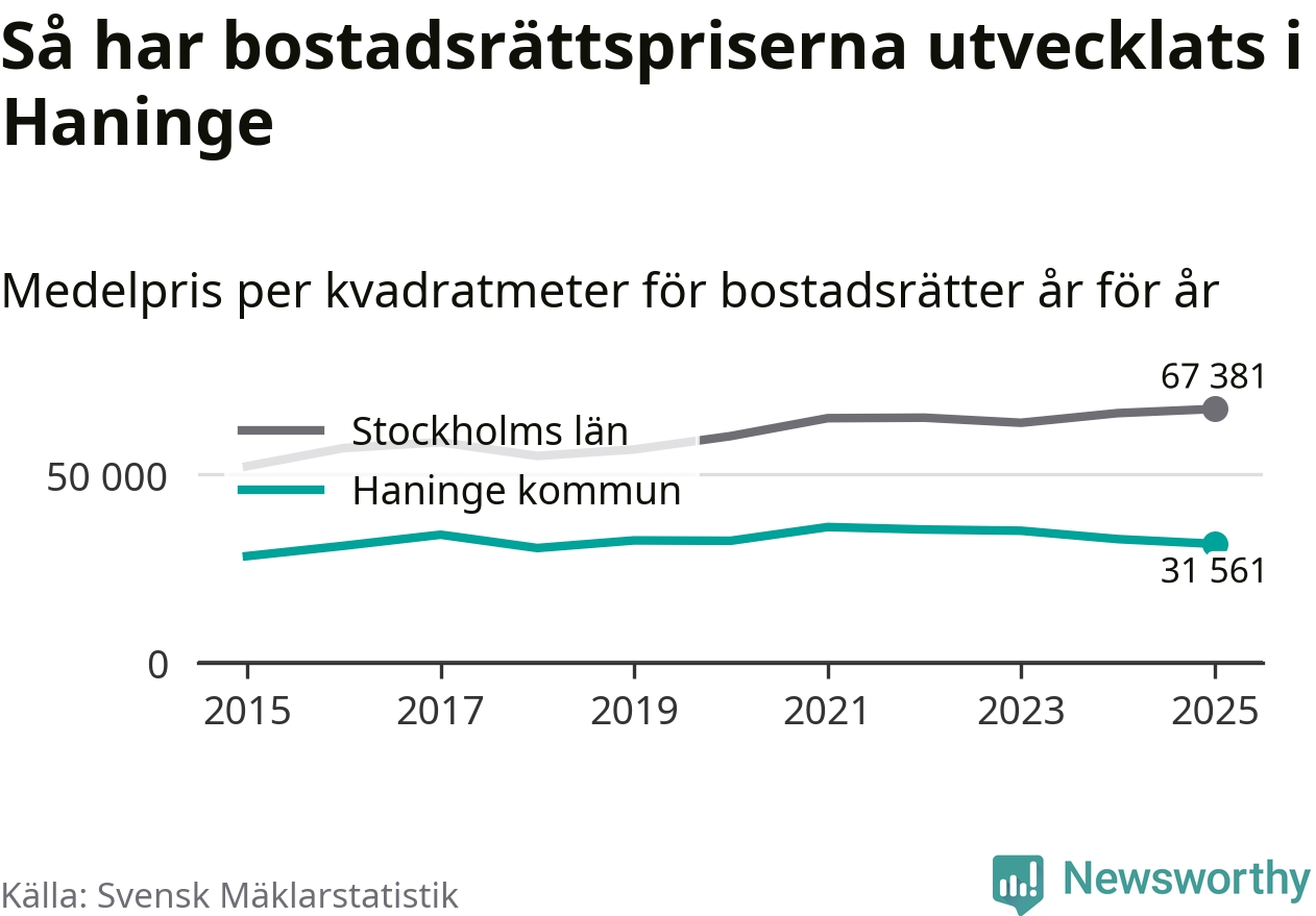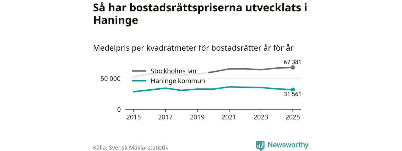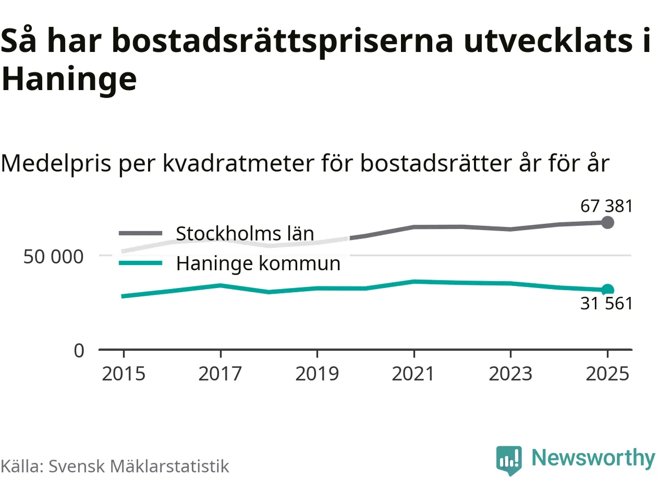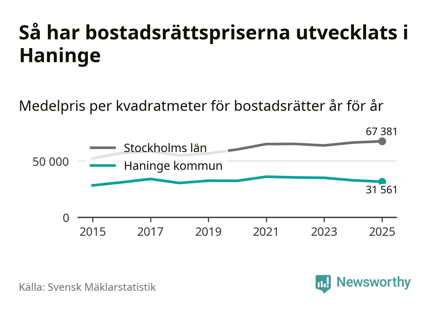 Det såldes totalt 1 235 bostadsrätter i Haninge kommun under året. Genomsnittspriset per kvadratmeter landade på 31 561 kronor. Det är en minskning med fyra procent i kommunen på ett år.