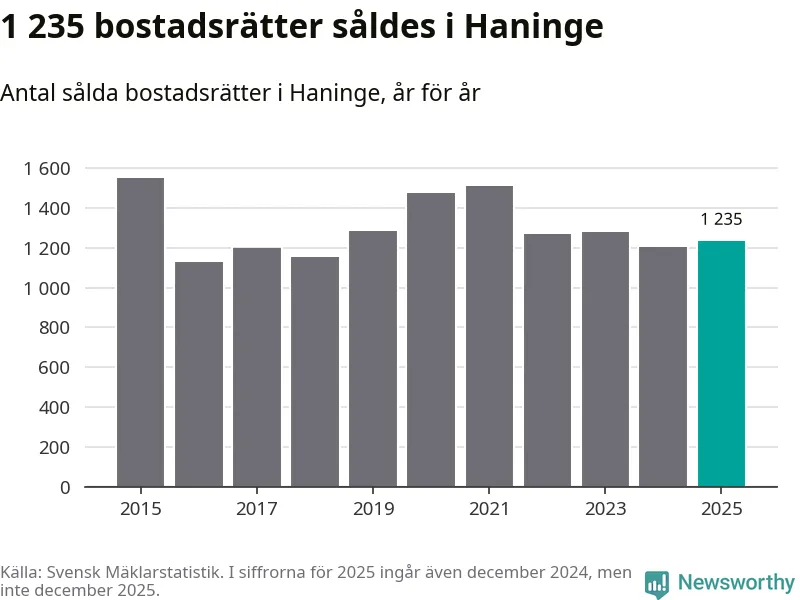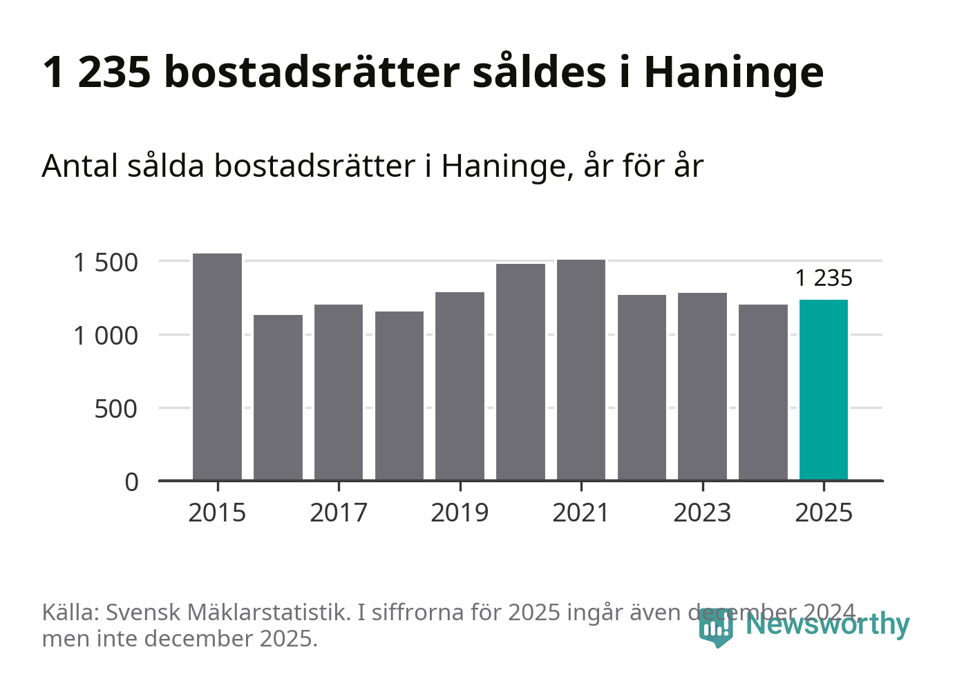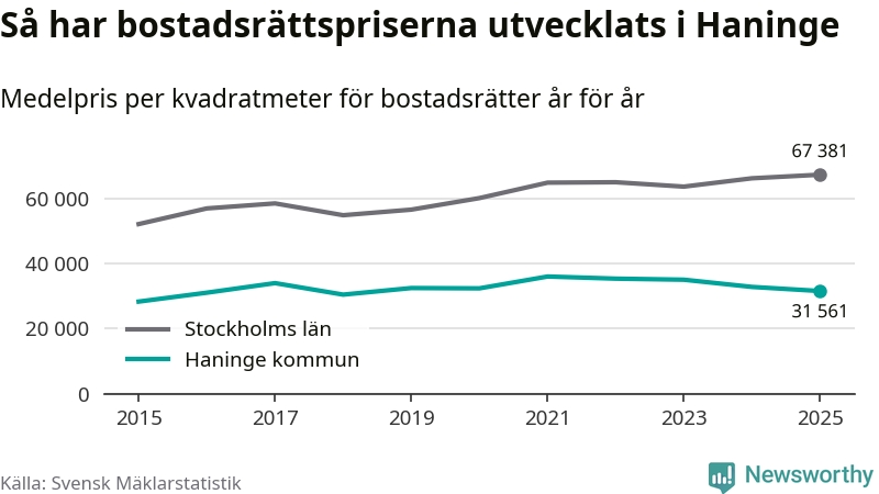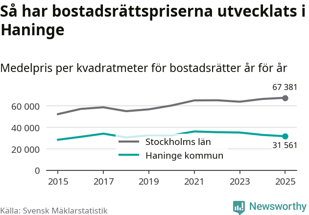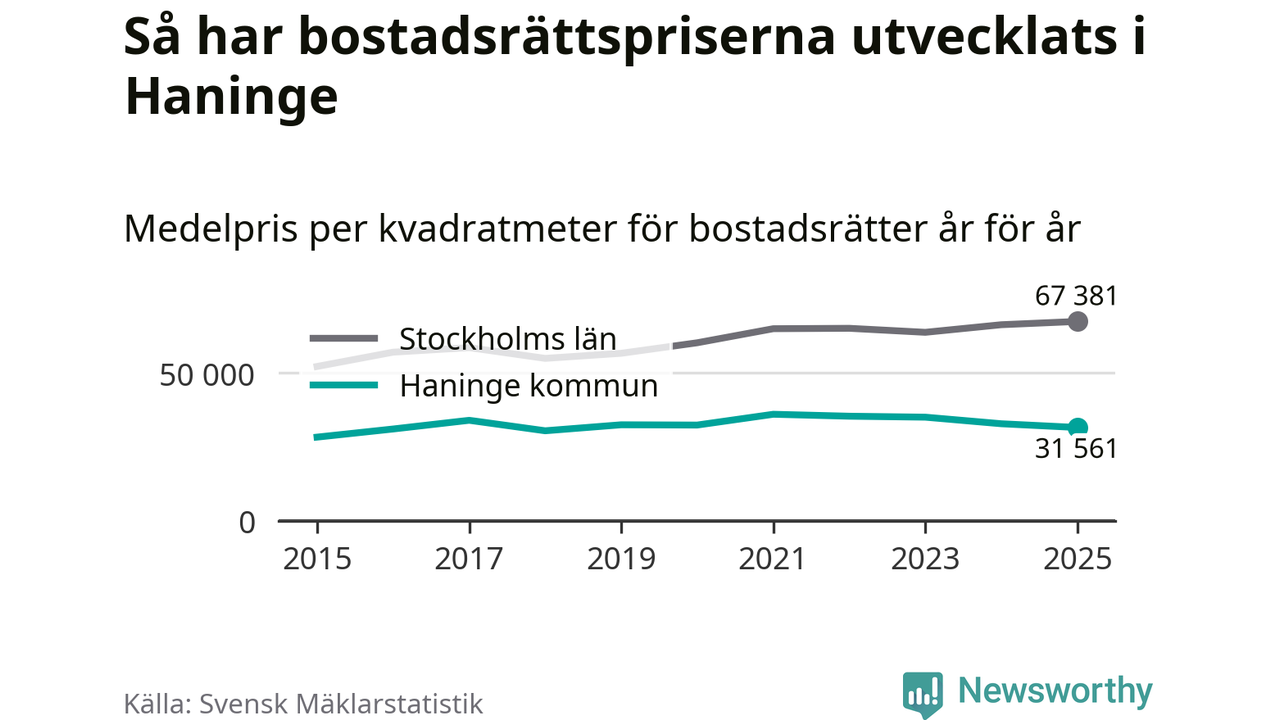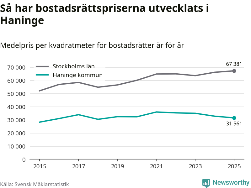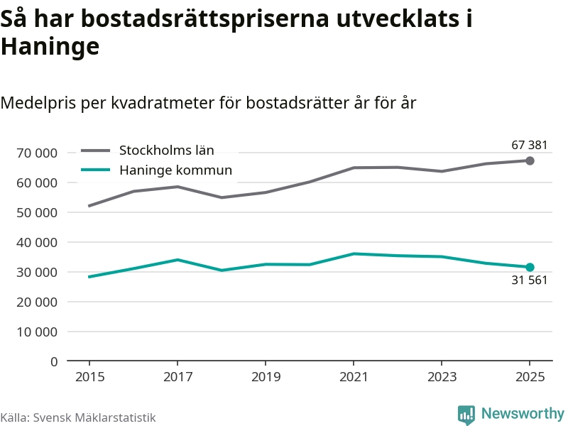 Det såldes totalt 1 235 bostadsrätter i Haninge kommun under året. Genomsnittspriset per kvadratmeter landade på 31 561 kronor. Det är en minskning med fyra procent i kommunen på ett år.