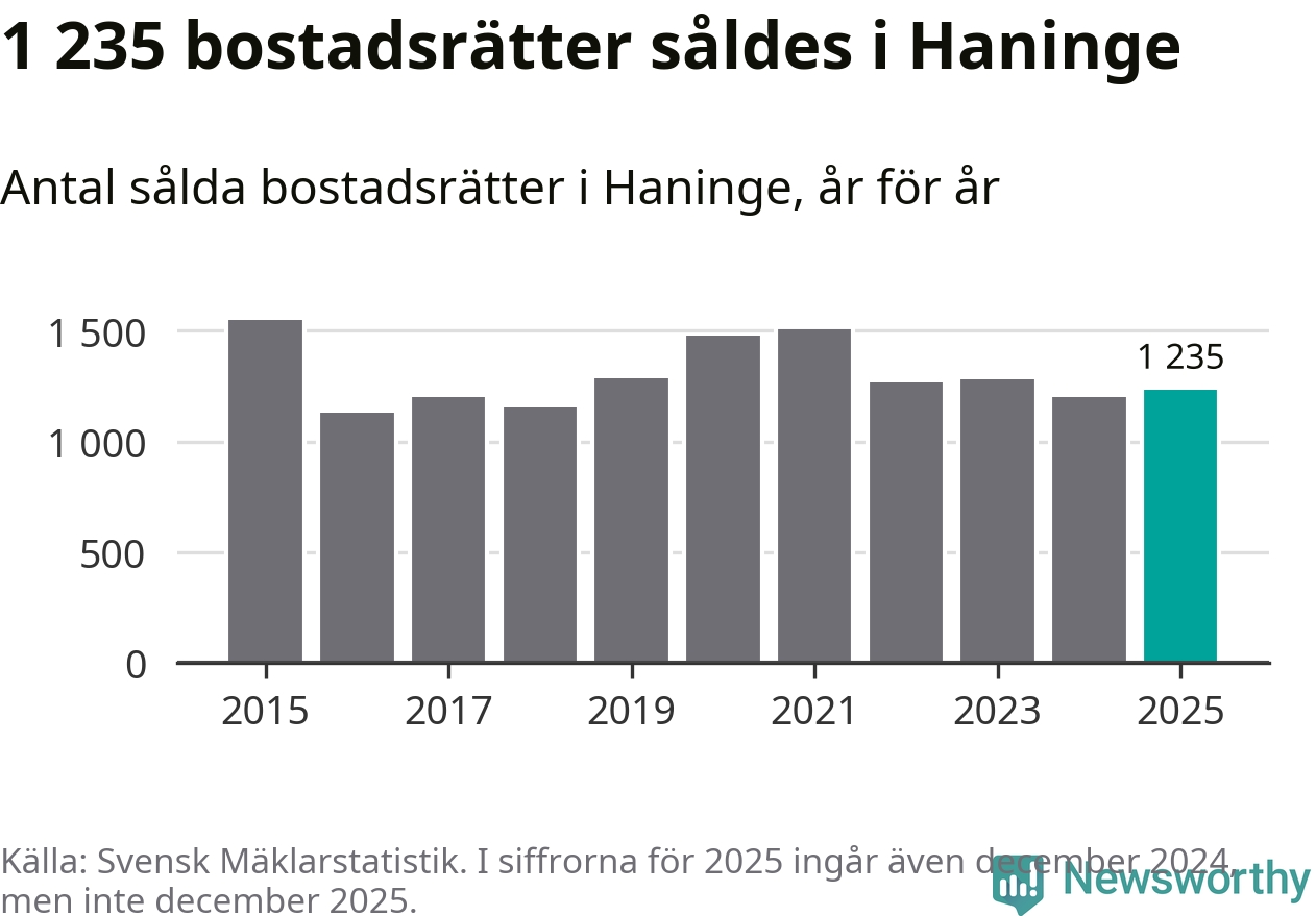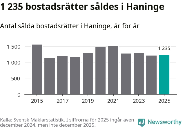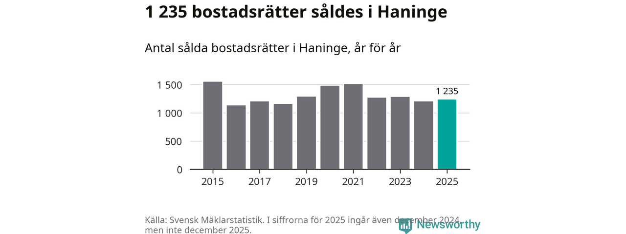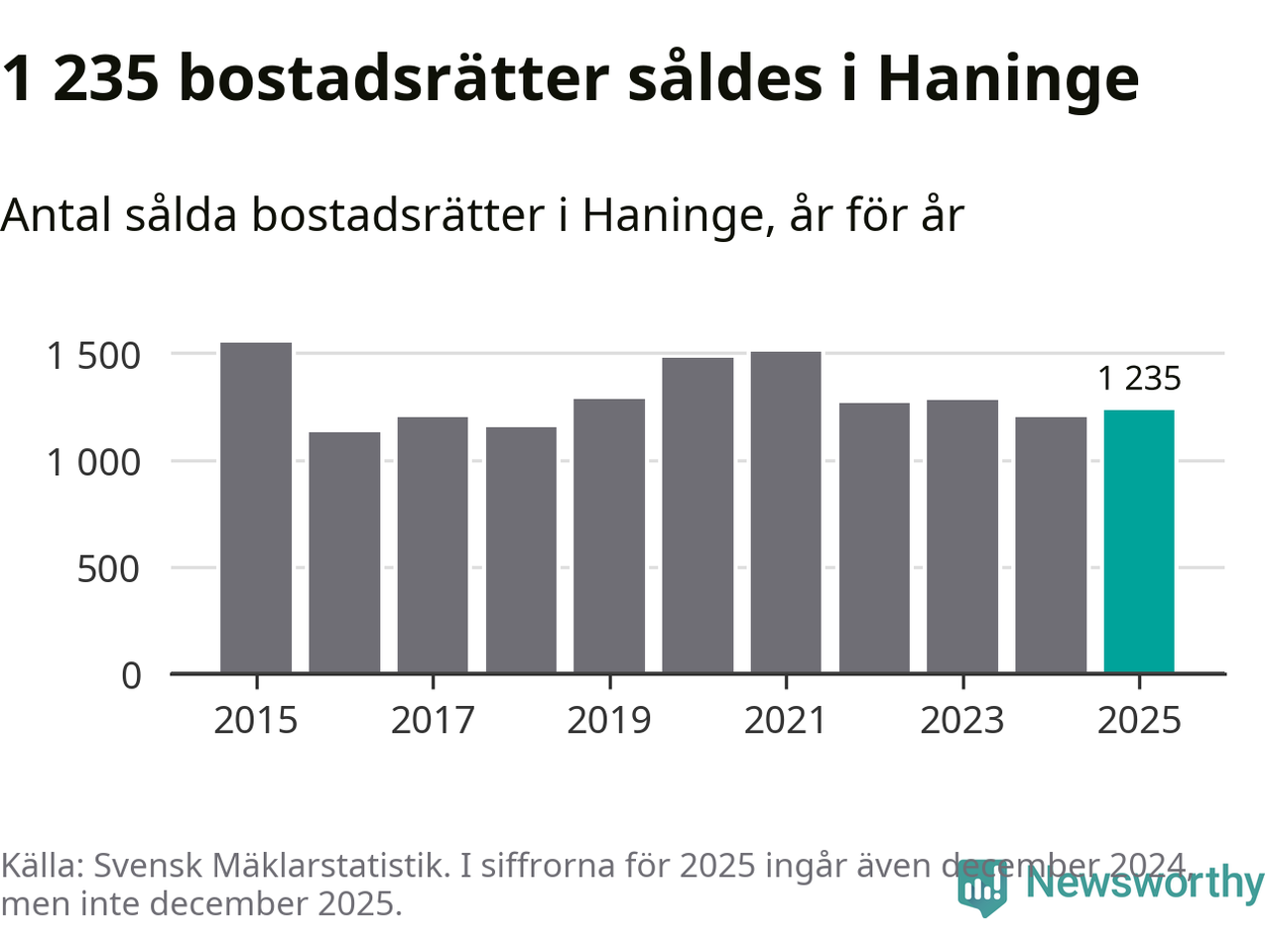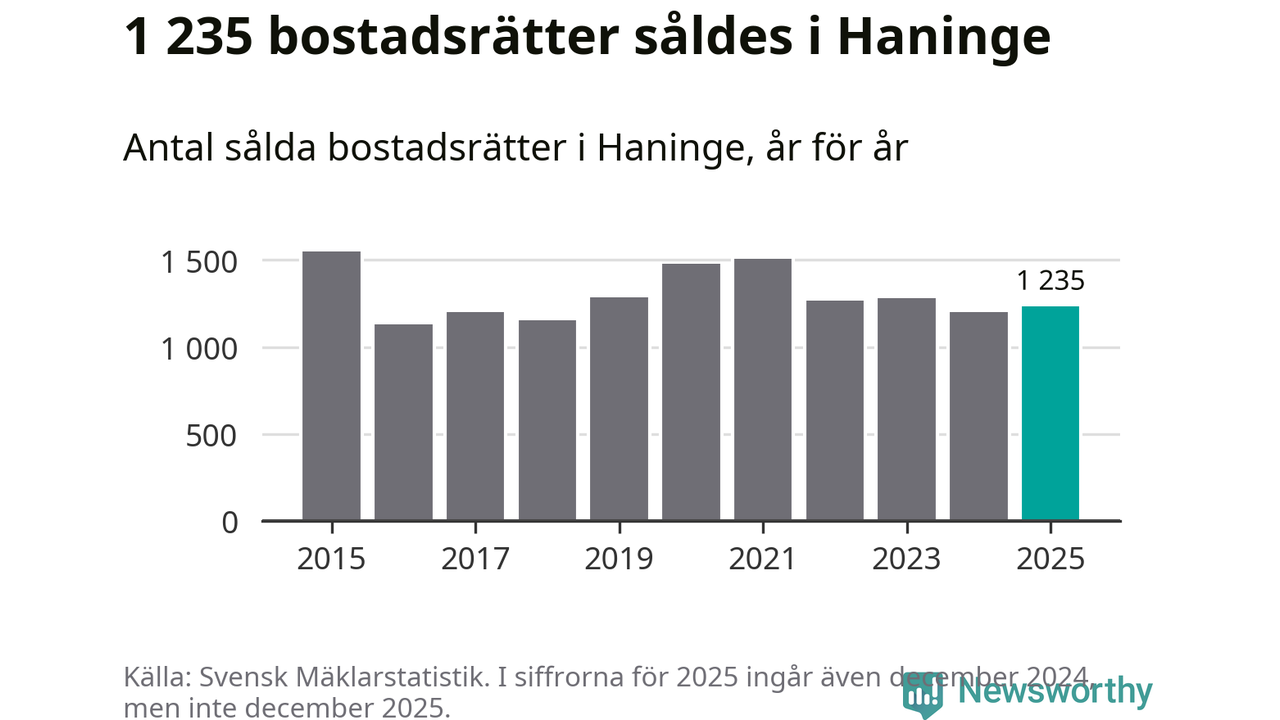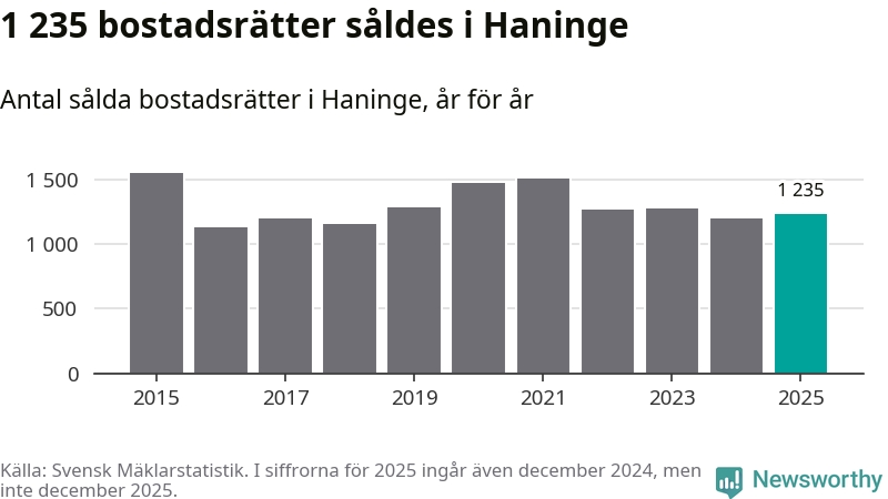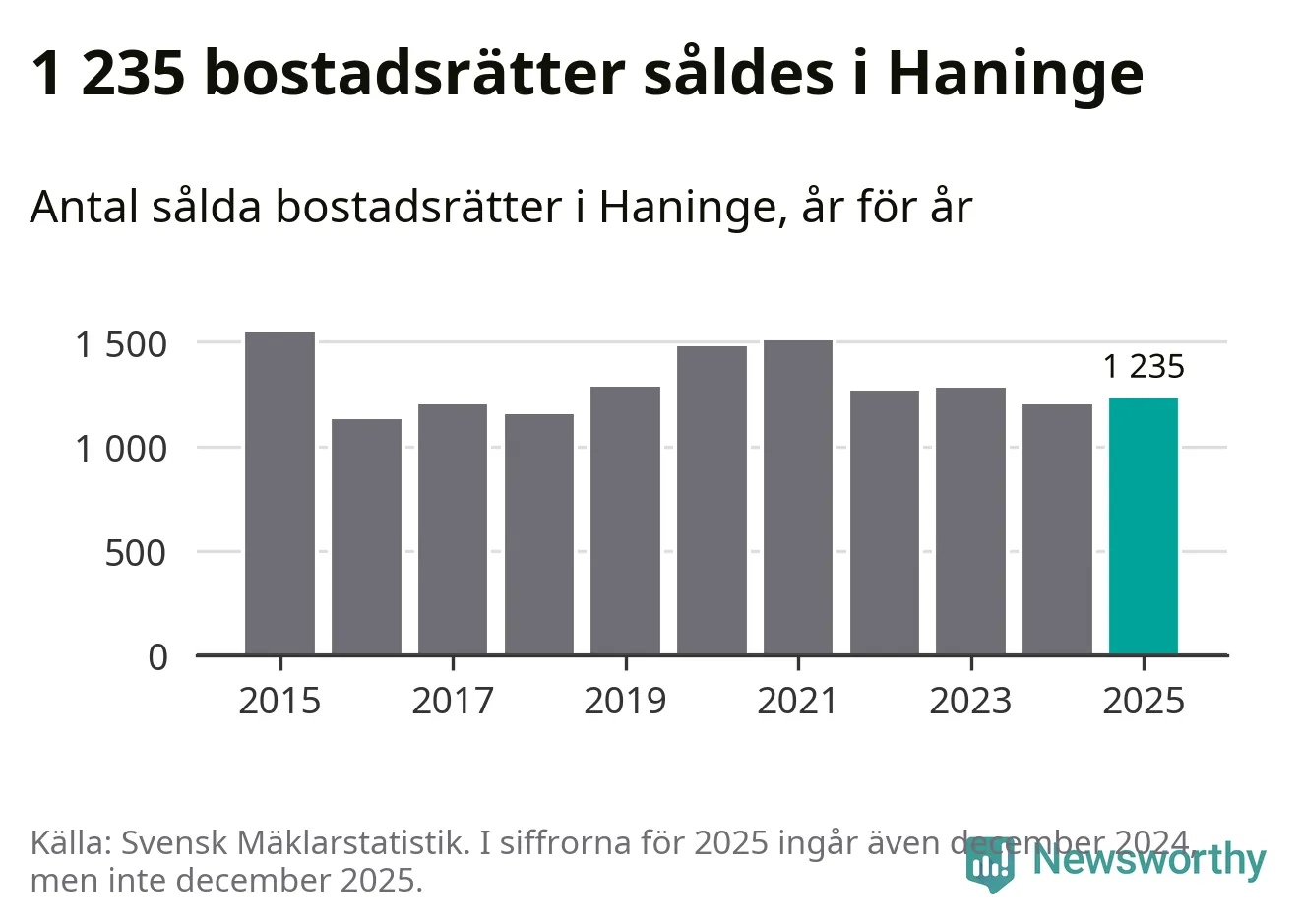 Det såldes totalt 1 235 bostadsrätter i Haninge kommun under året. Genomsnittspriset per kvadratmeter landade på 31 561 kronor. Det är en minskning med fyra procent i kommunen på ett år.