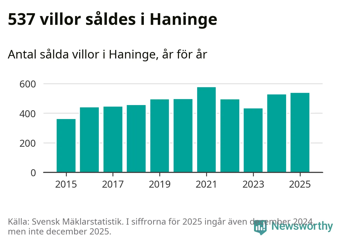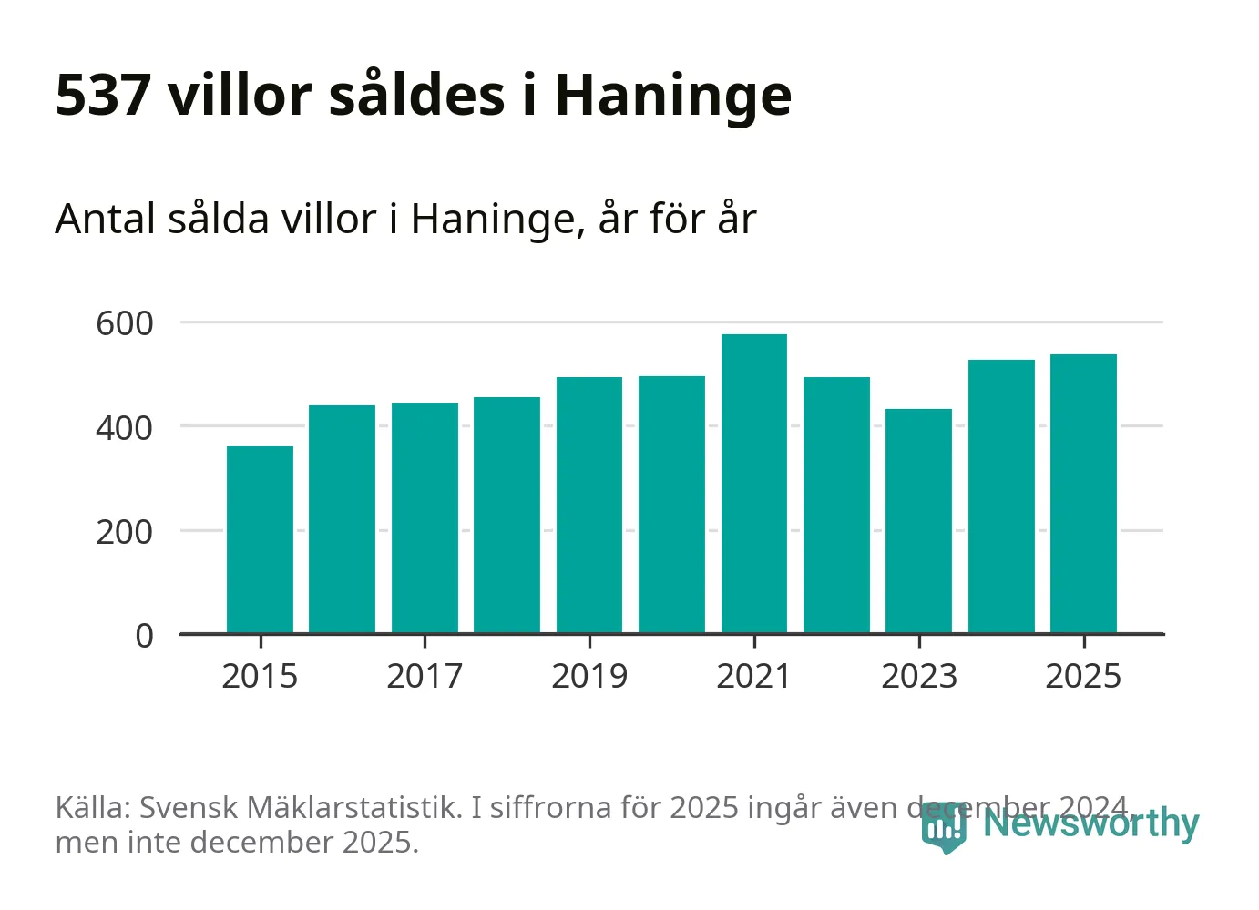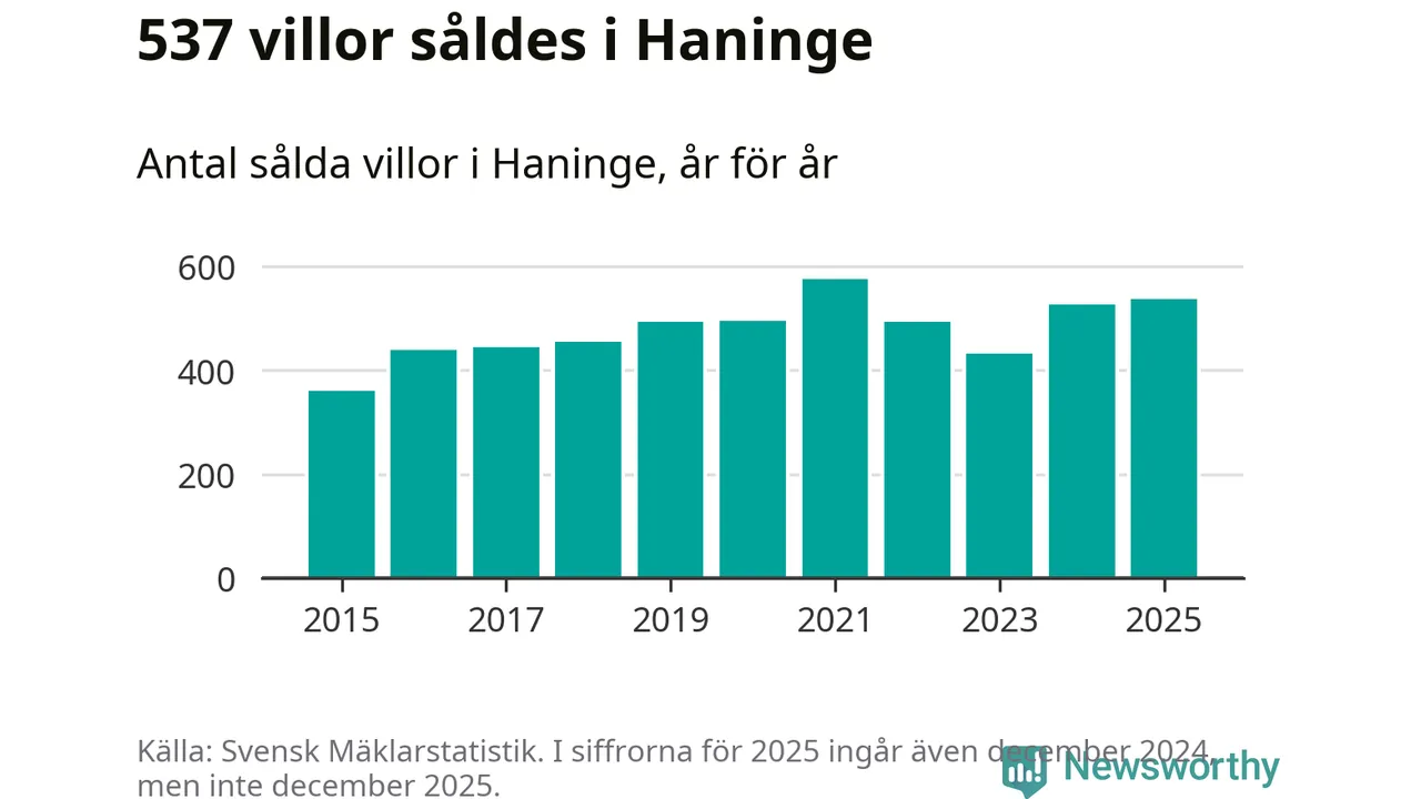 Däremot ökade antalet sålda villor. Totalt såldes 537 villor, att jämföra med 525 under 2024. Det är andra året i rad som antalet sålda villor ökar i kommunen.