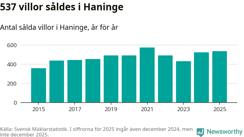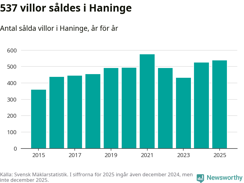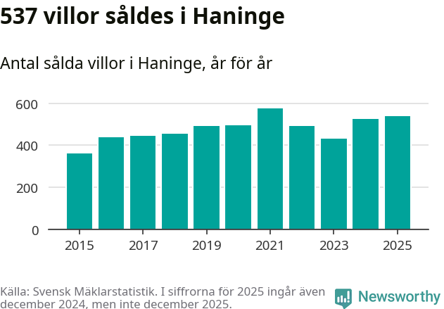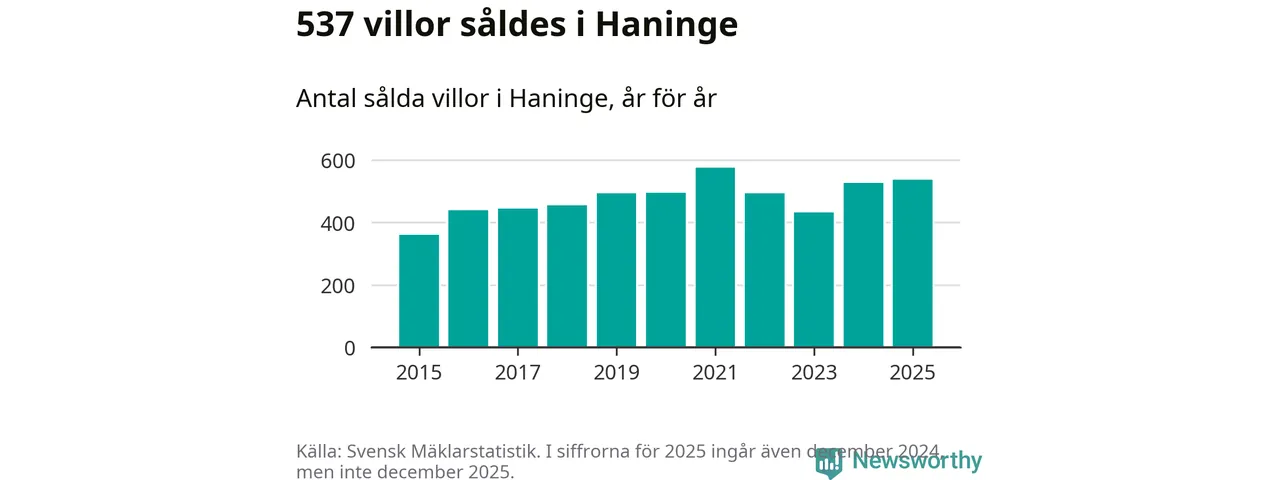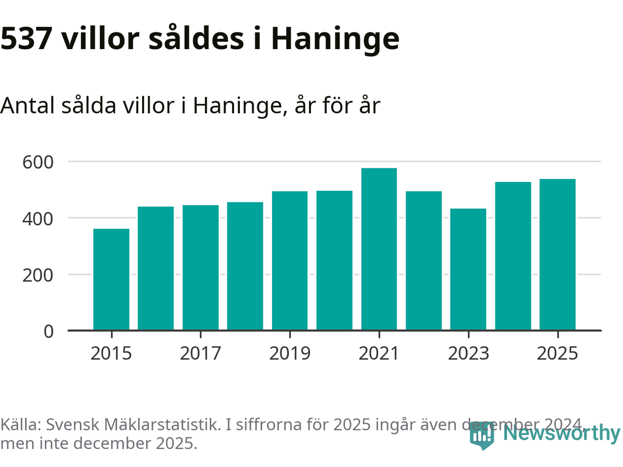 Däremot ökade antalet sålda villor. Totalt såldes 537 villor, att jämföra med 525 under 2024. Det är andra året i rad som antalet sålda villor ökar i kommunen.