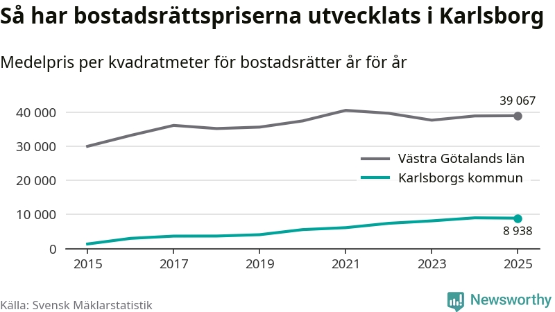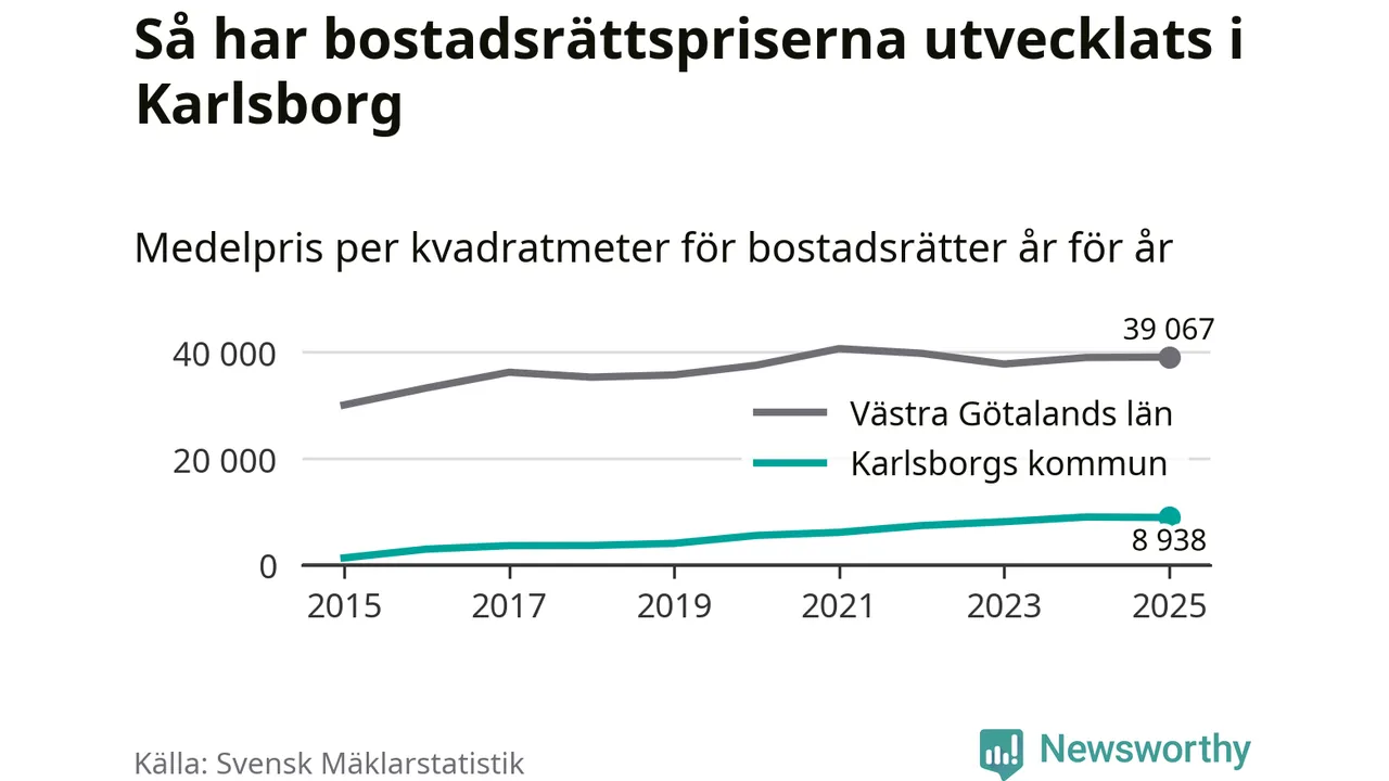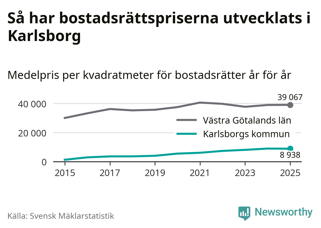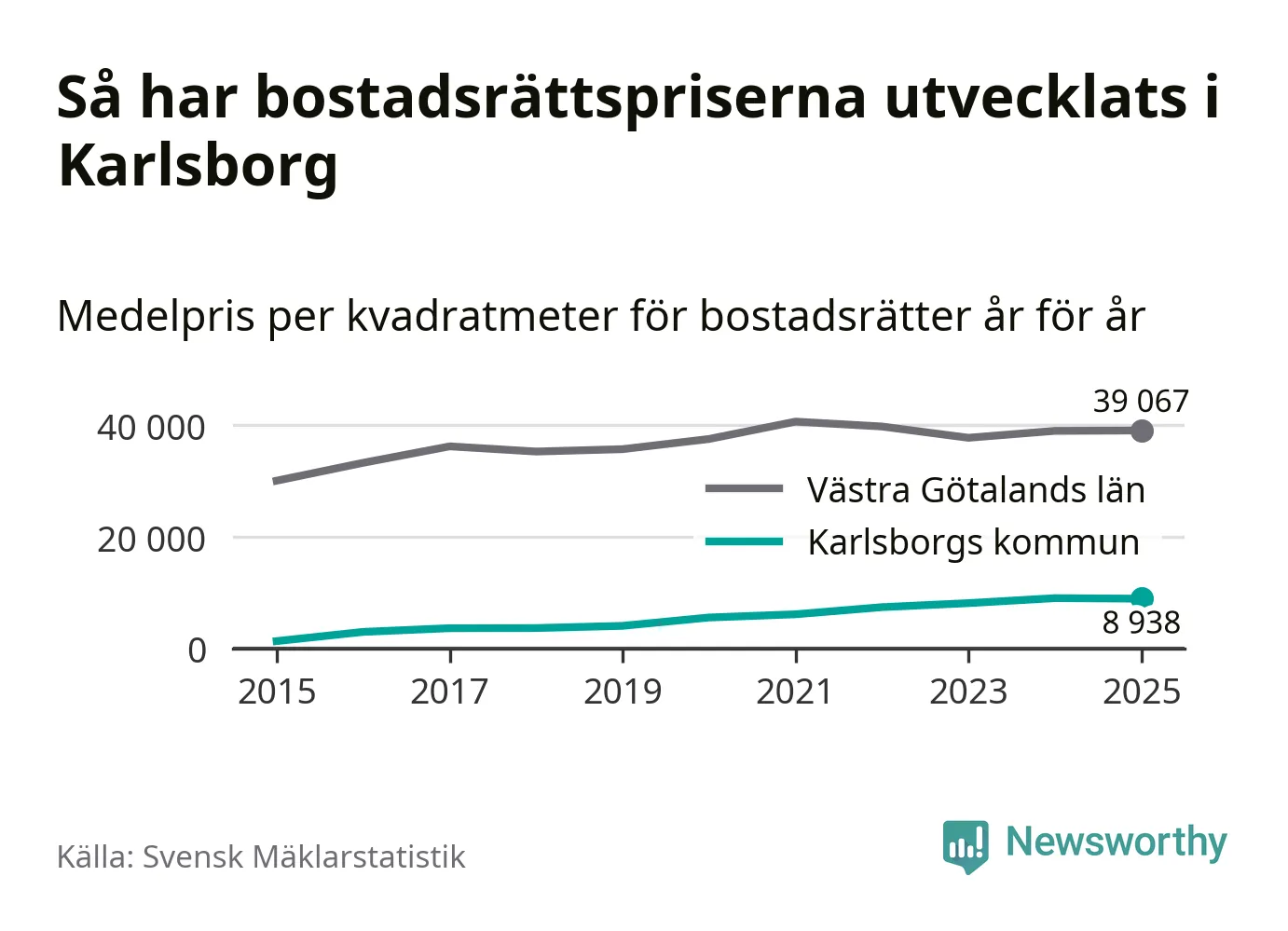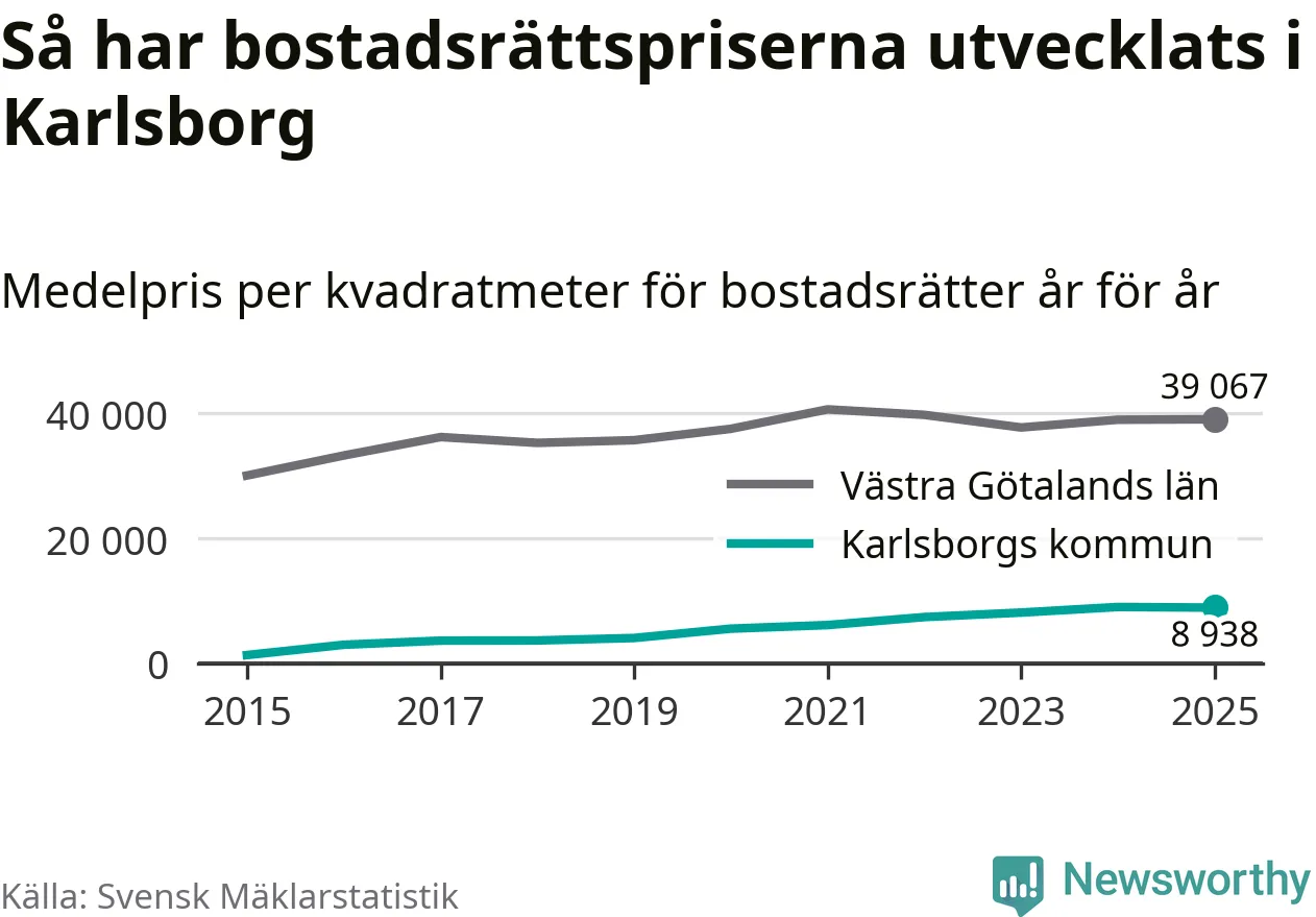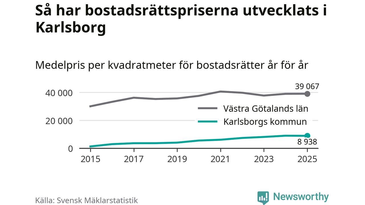 Det såldes totalt 50 bostadsrätter i Karlsborgs kommun under året. Genomsnittspriset per kvadratmeter landade på 8 938 kronor. Det är en minskning med en procent i kommunen på ett år.