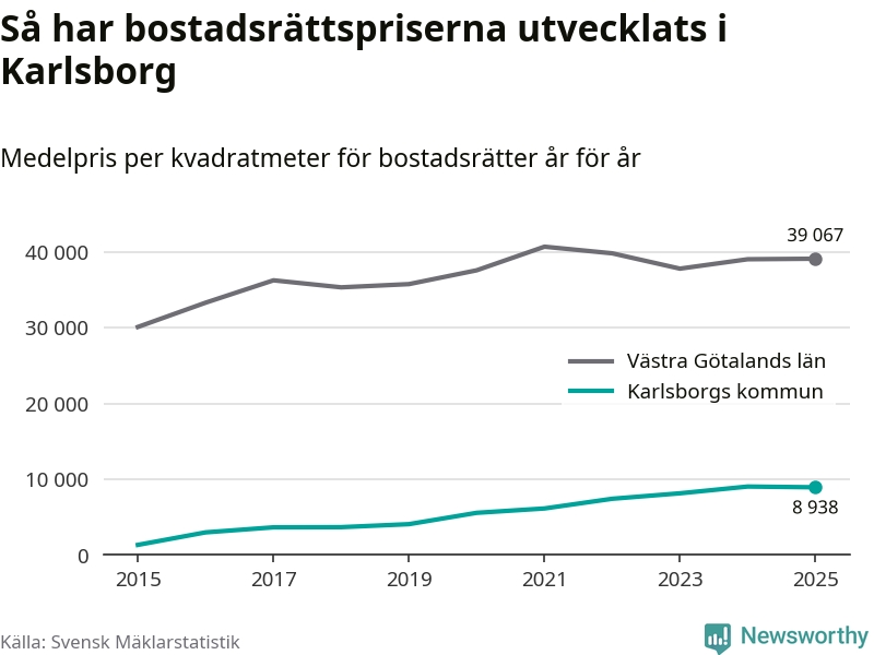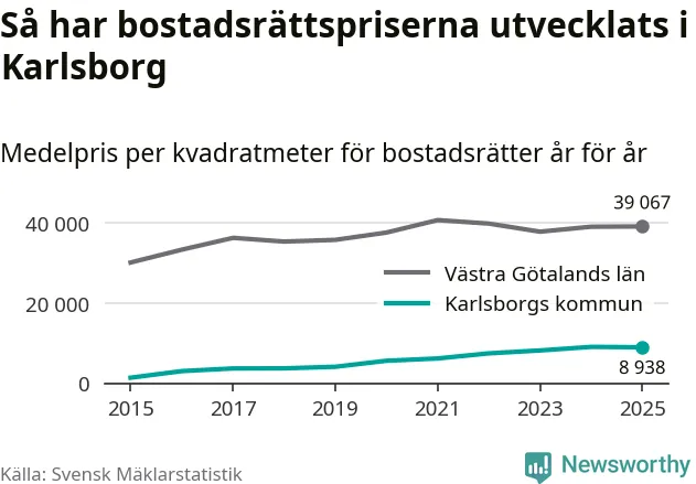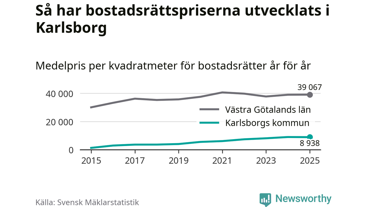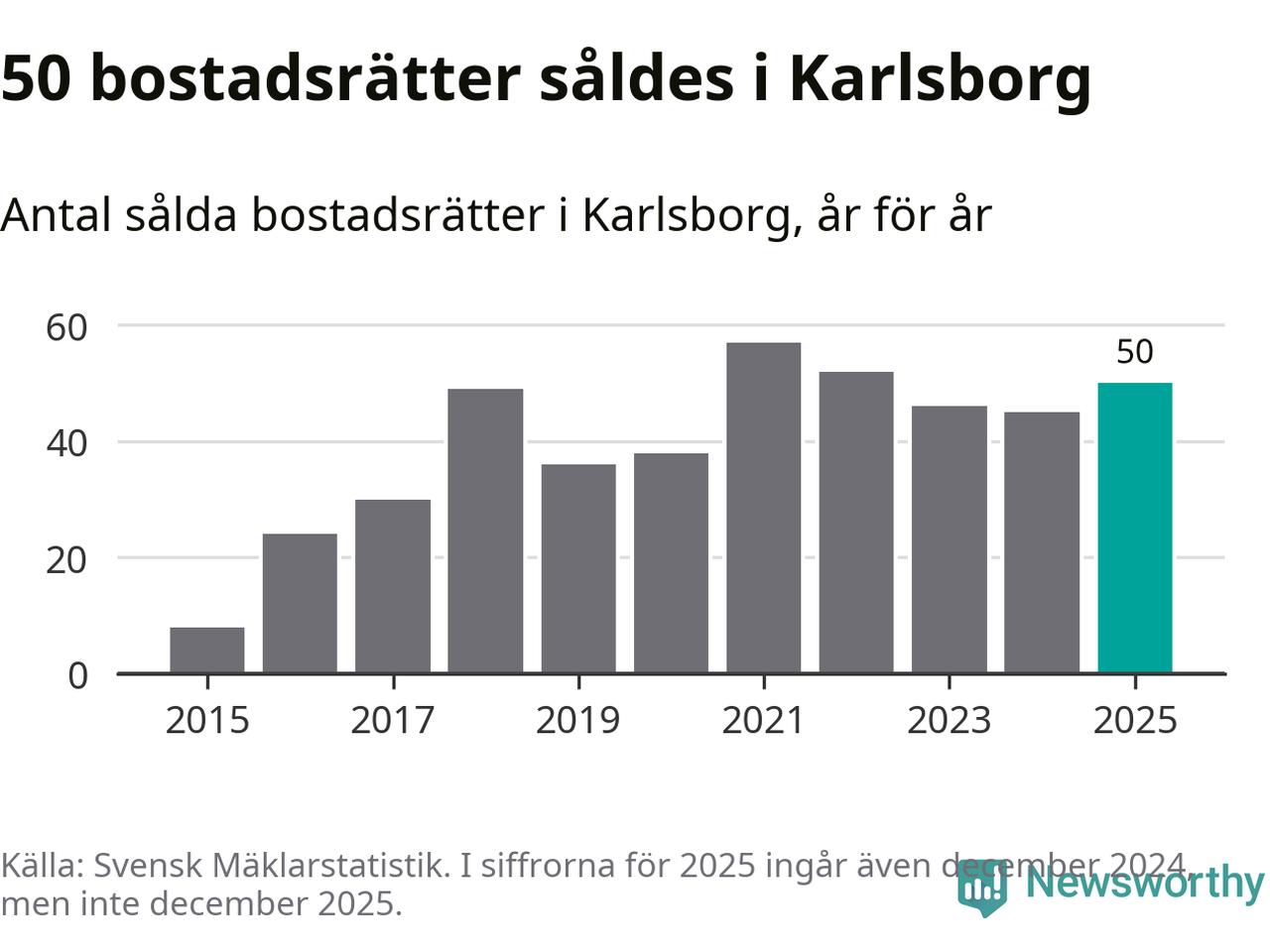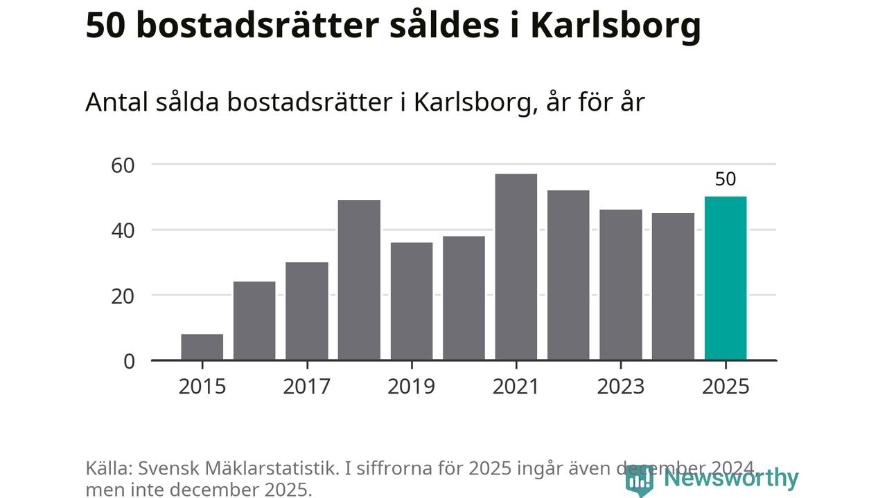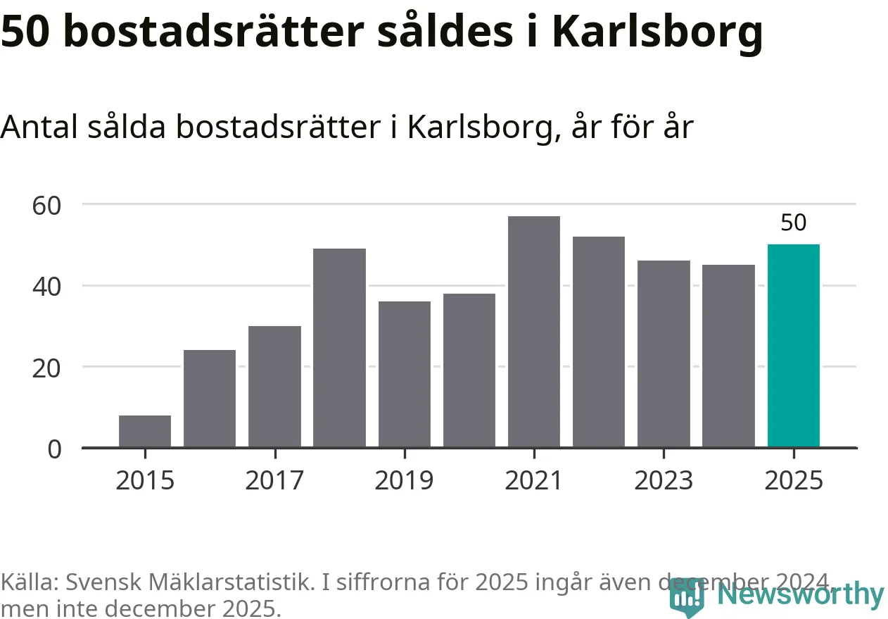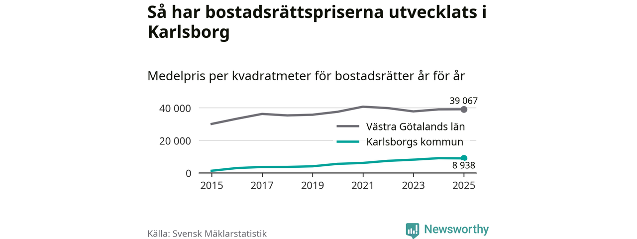 Det såldes totalt 50 bostadsrätter i Karlsborgs kommun under året. Genomsnittspriset per kvadratmeter landade på 8 938 kronor. Det är en minskning med en procent i kommunen på ett år.