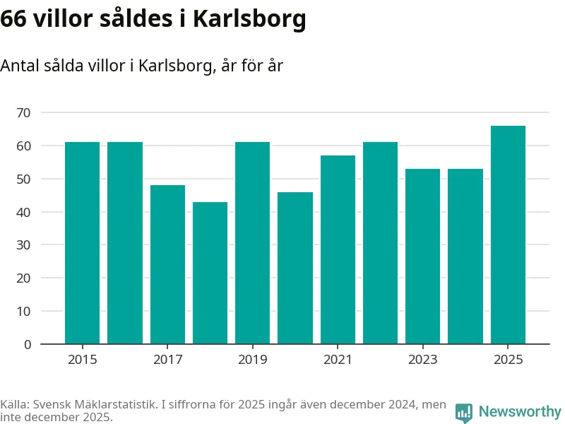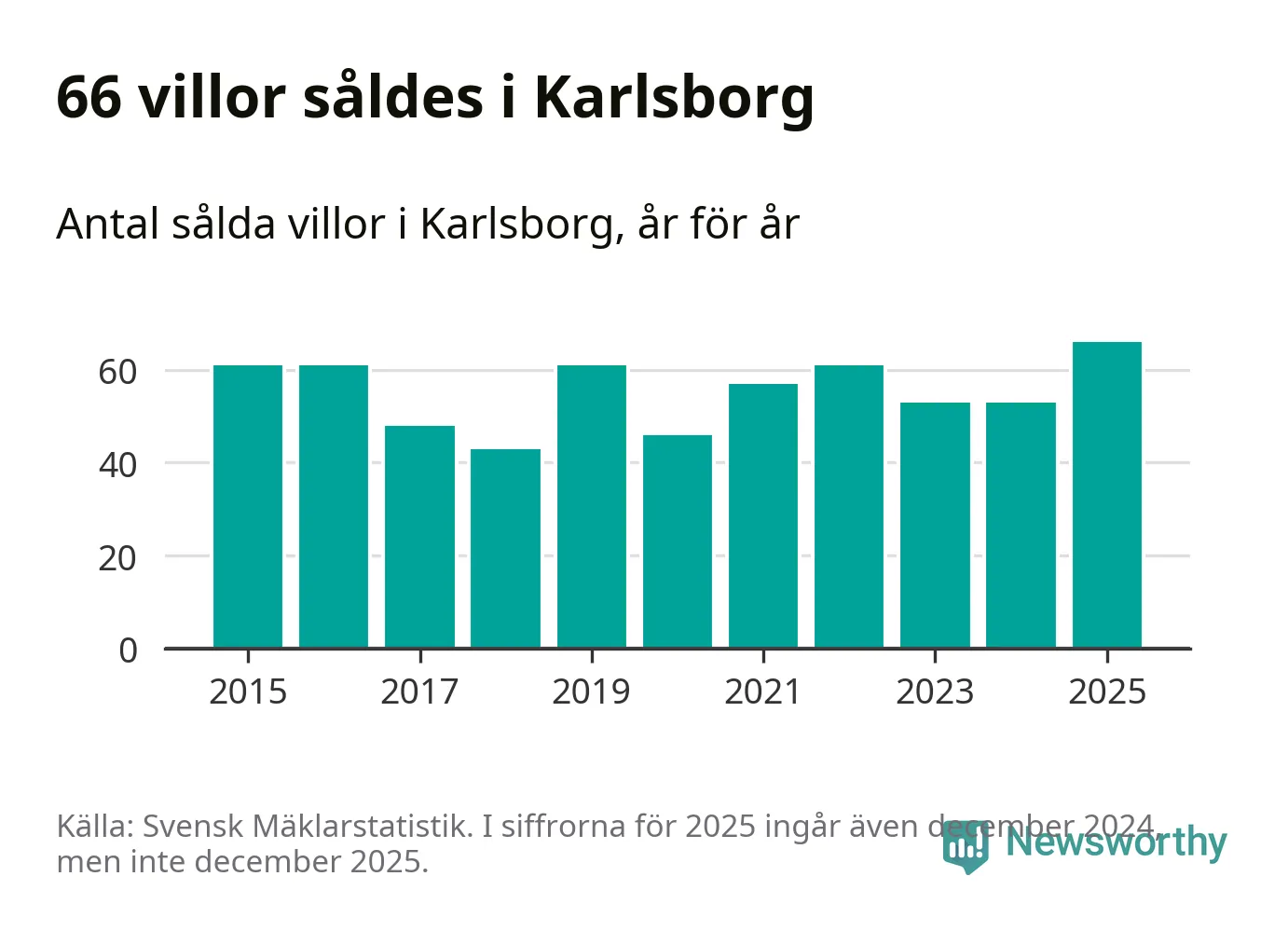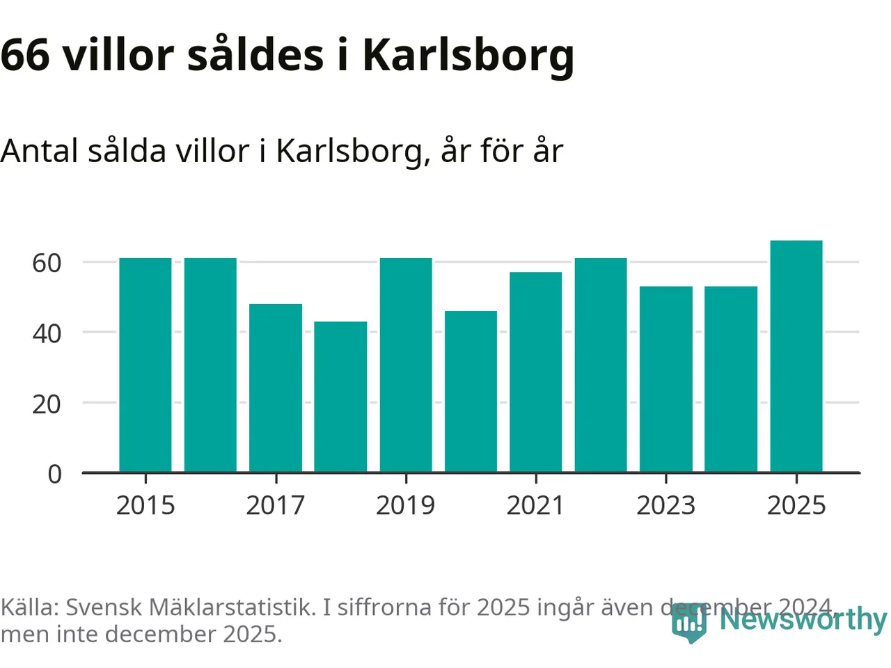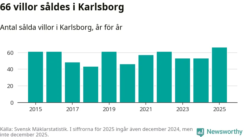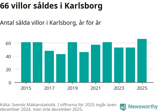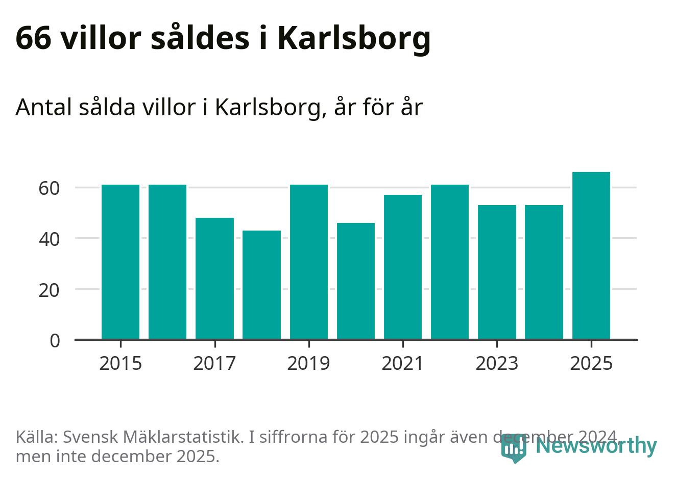 Däremot ökade antalet sålda villor. Totalt såldes 66 villor, att jämföra med 53 under 2024. Det är fler än något annat år sedan 2015.