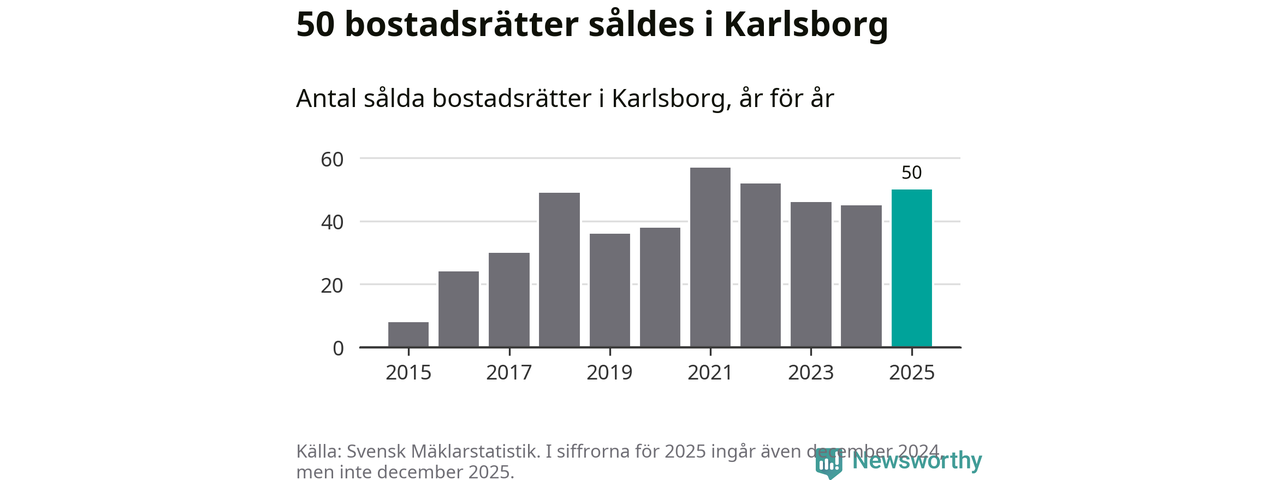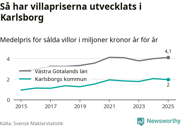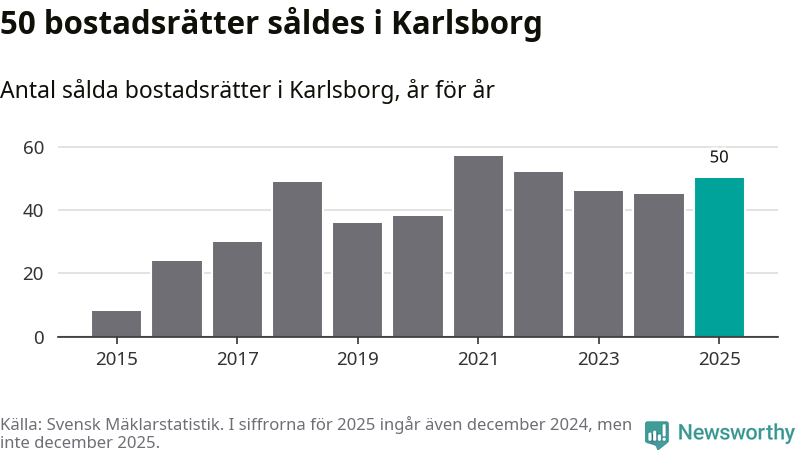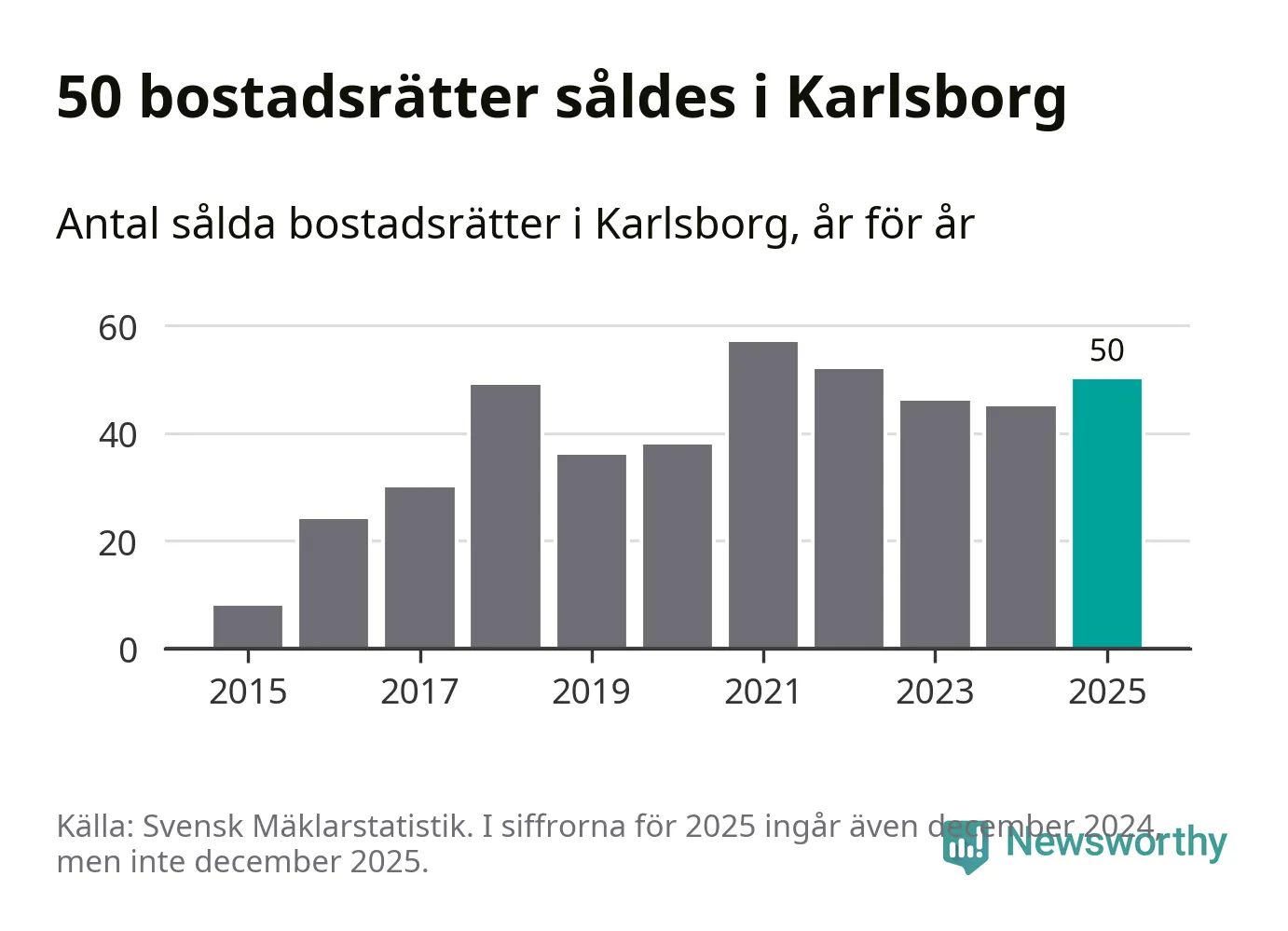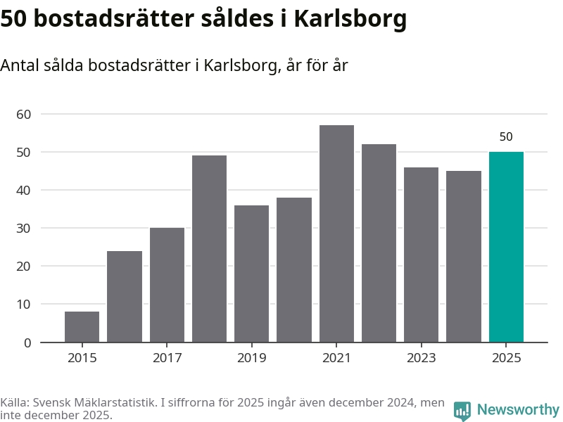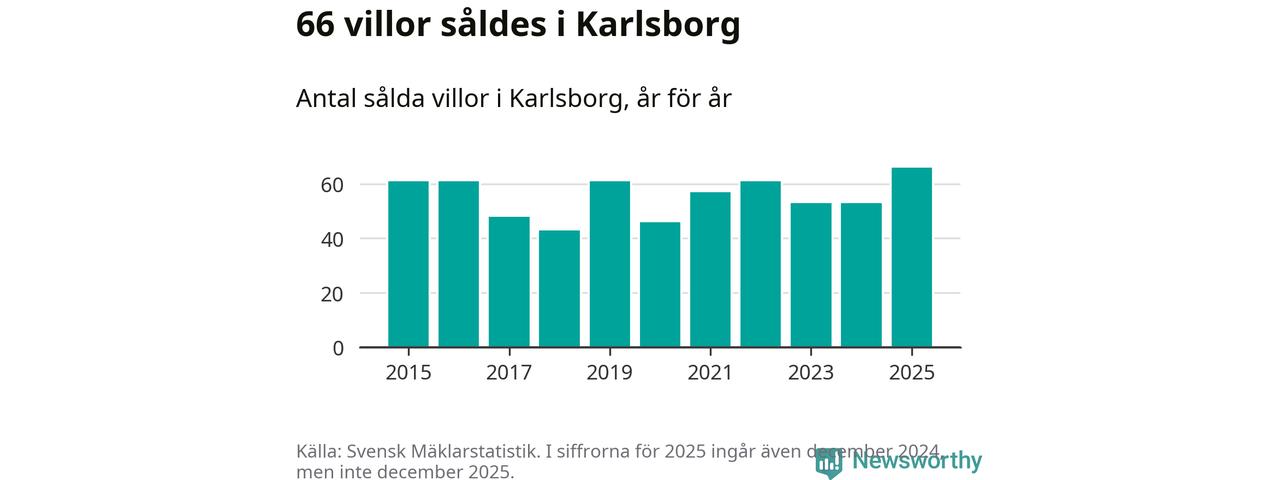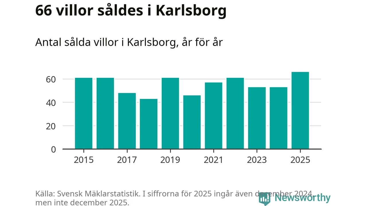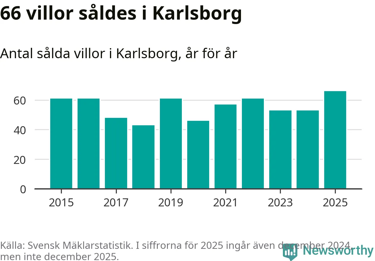 Däremot ökade antalet sålda villor. Totalt såldes 66 villor, att jämföra med 53 under 2024. Det är fler än något annat år sedan 2015.