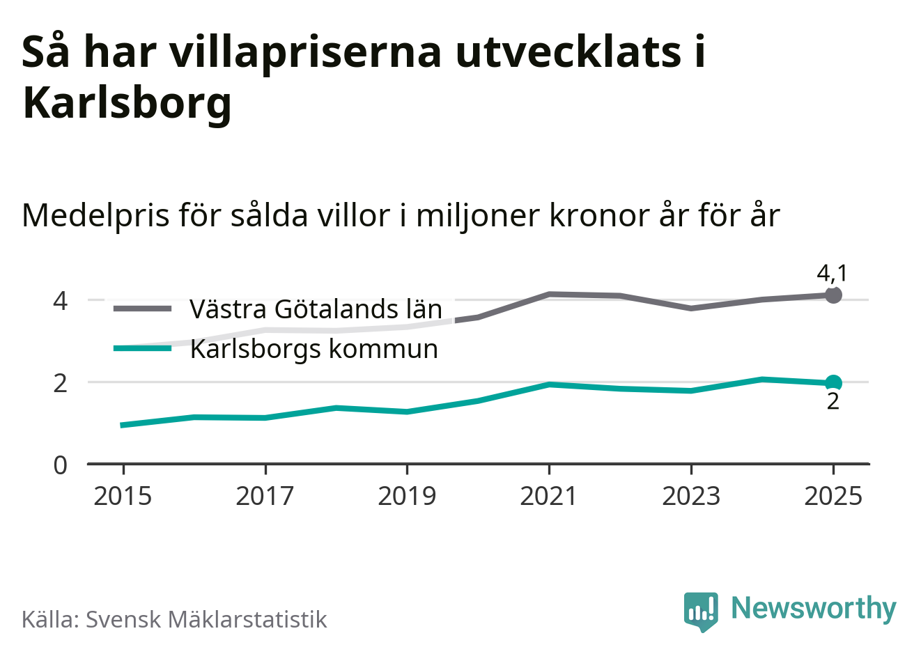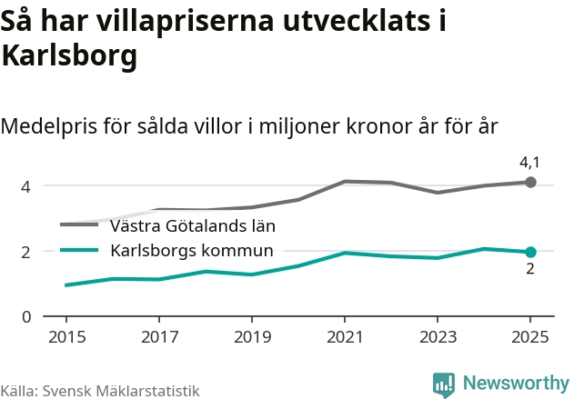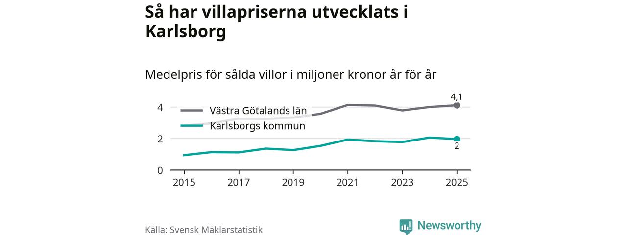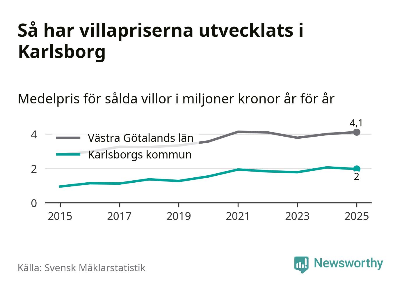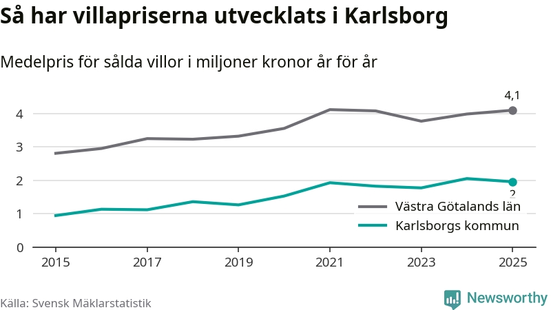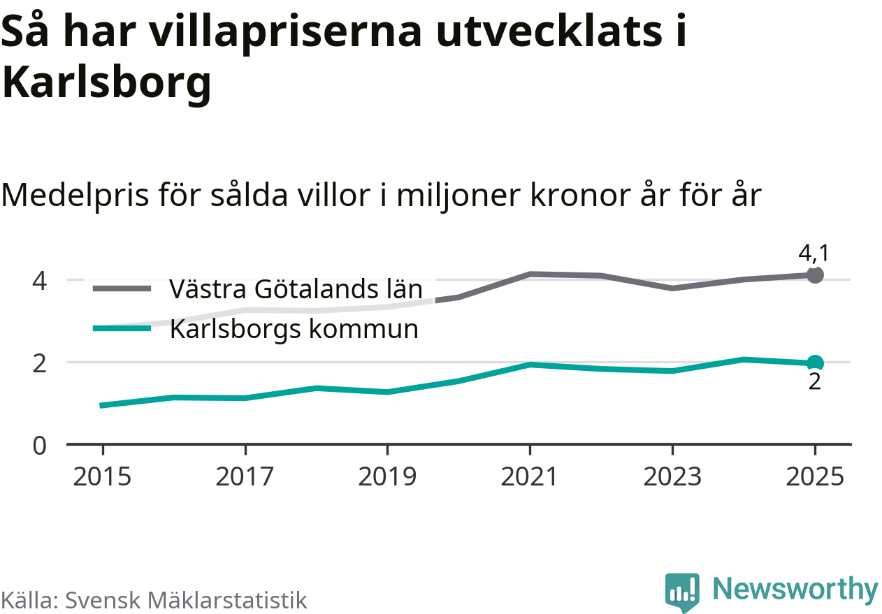 Två miljoner kronor är medelpriset för de villor som såldes i Karlsborgs kommun under året, eller 18 218 kronor per kvadratmeter. Det innebär en prisminskning med fem procent på ett år.