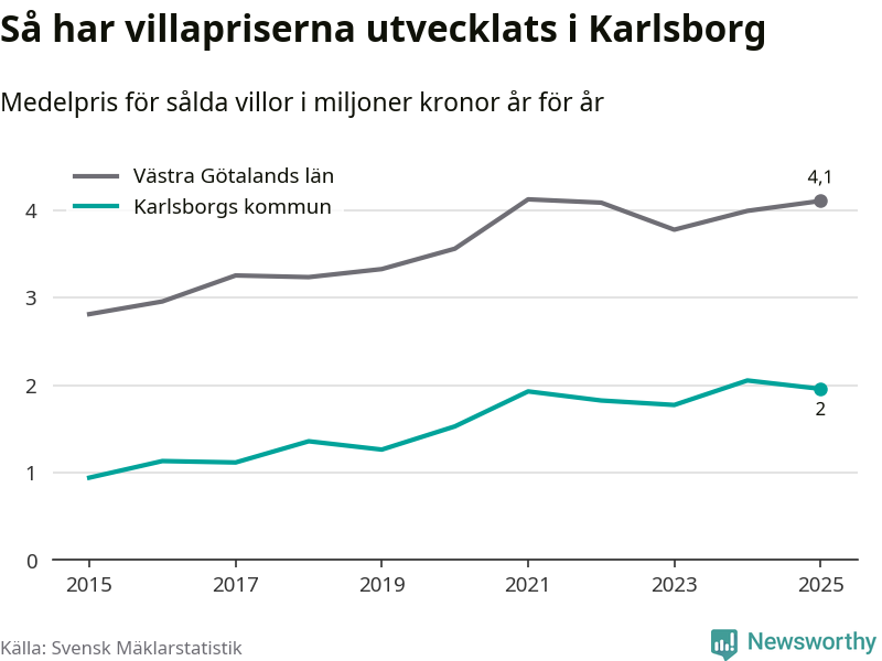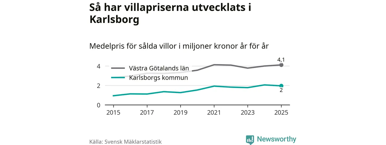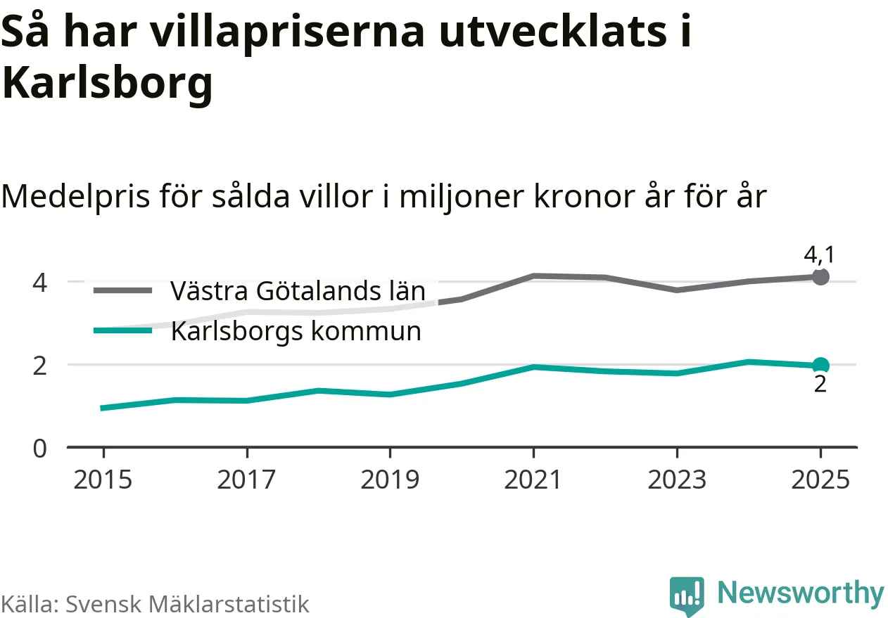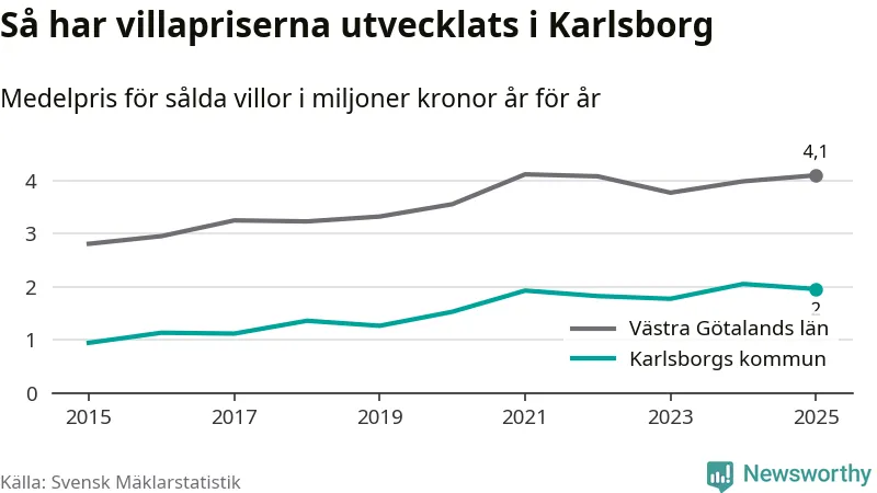Priserna på villor i Västra Götalands län som helhet har ökat med tre procent sedan förra året. Dock har de inte nått samma nivåer som toppåret i länet 2021.