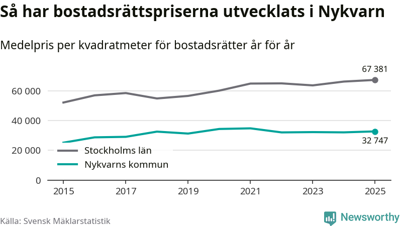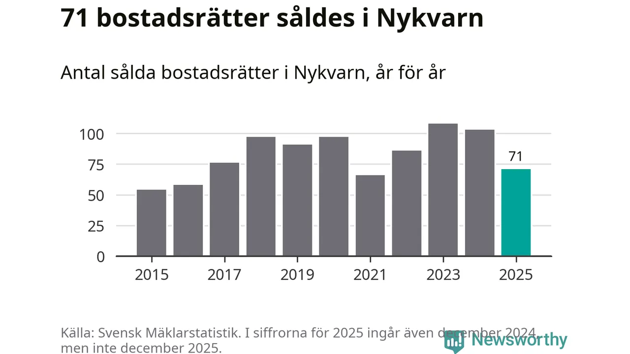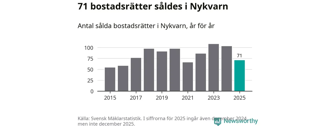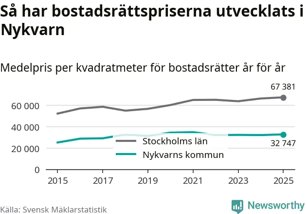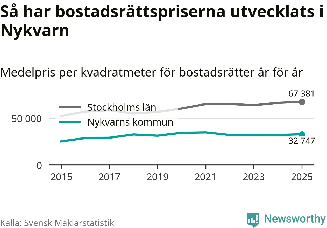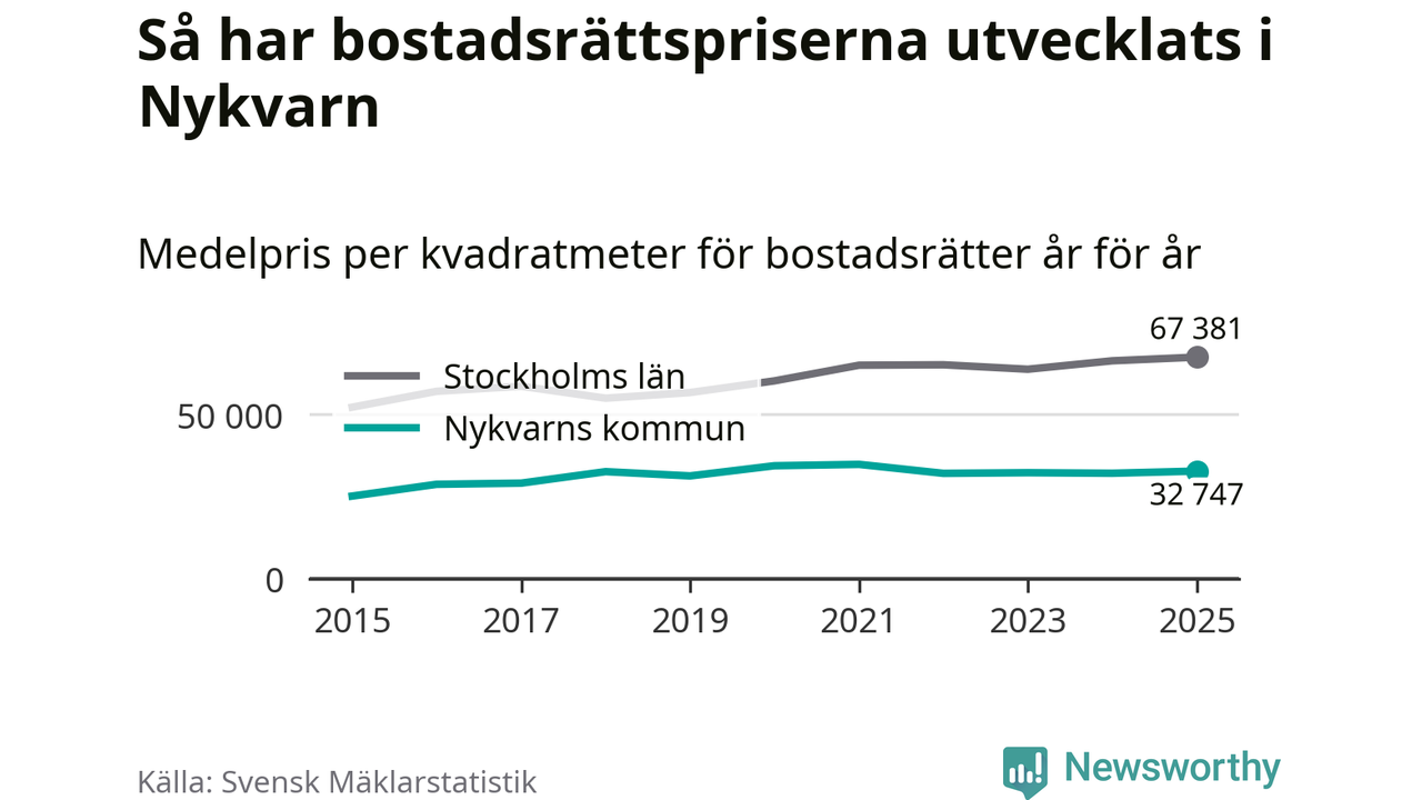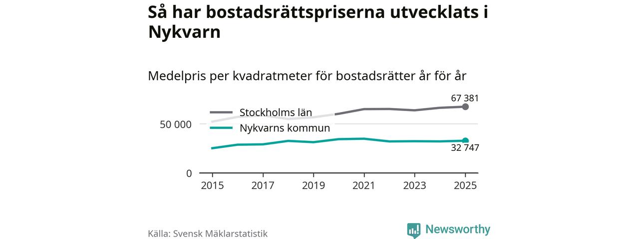 Det såldes totalt 71 bostadsrätter i Nykvarns kommun under året. Genomsnittspriset per kvadratmeter landade på 32 747 kronor. Det är en ökning med två procent i kommunen på ett år.