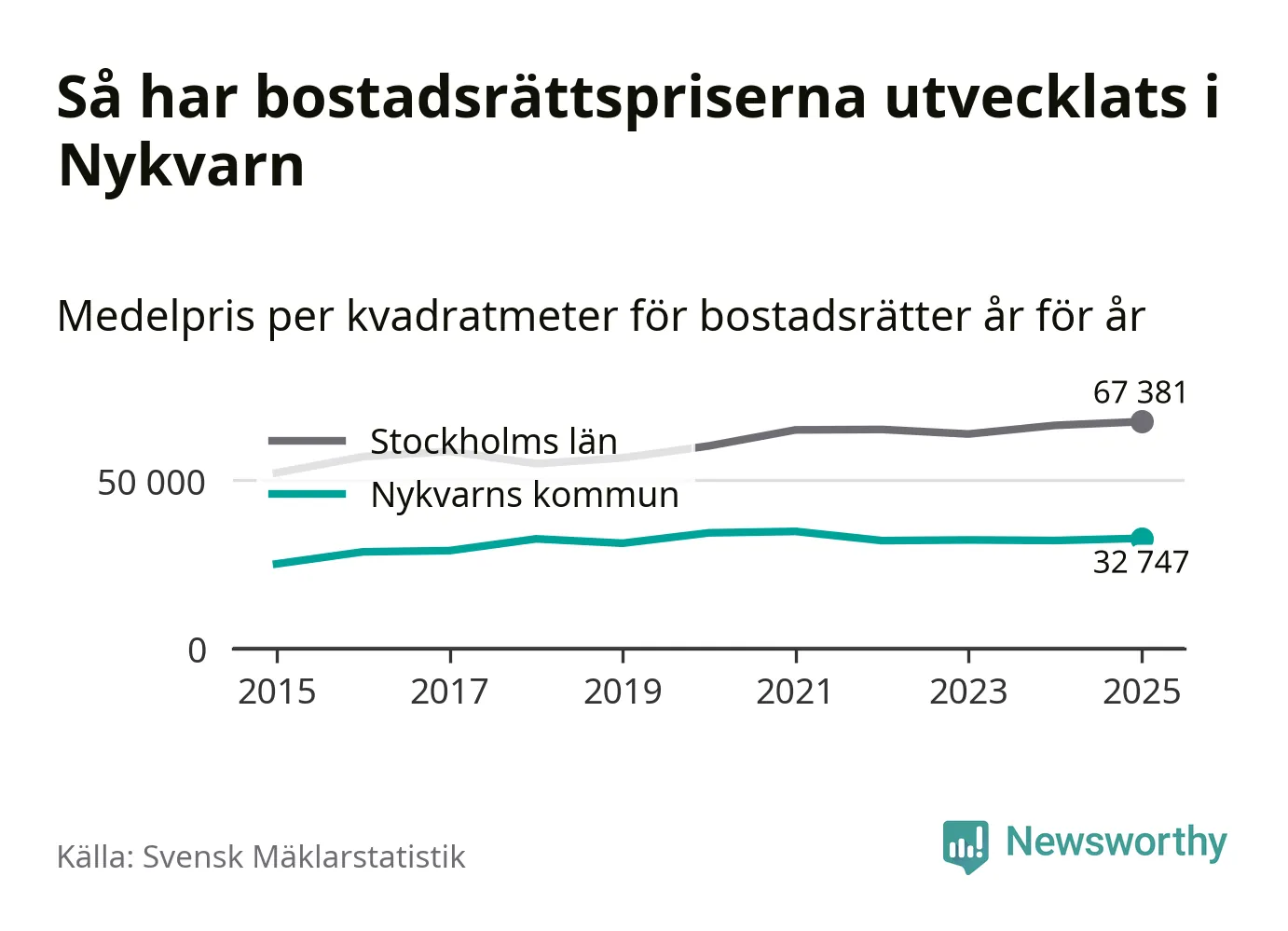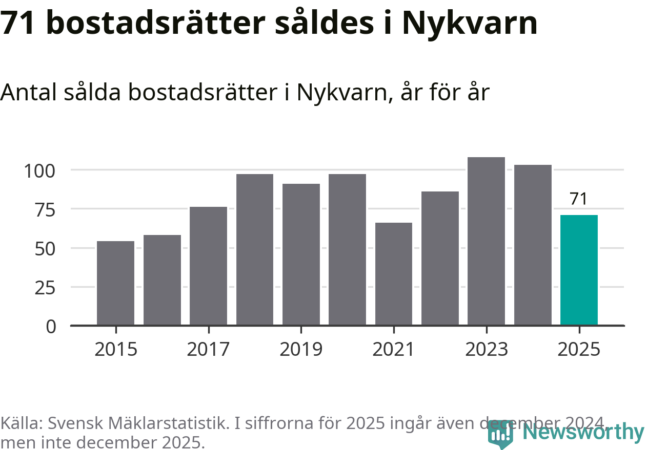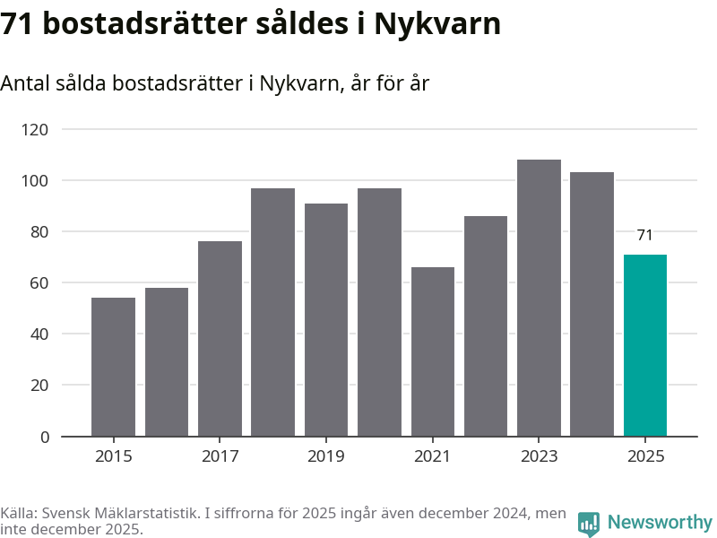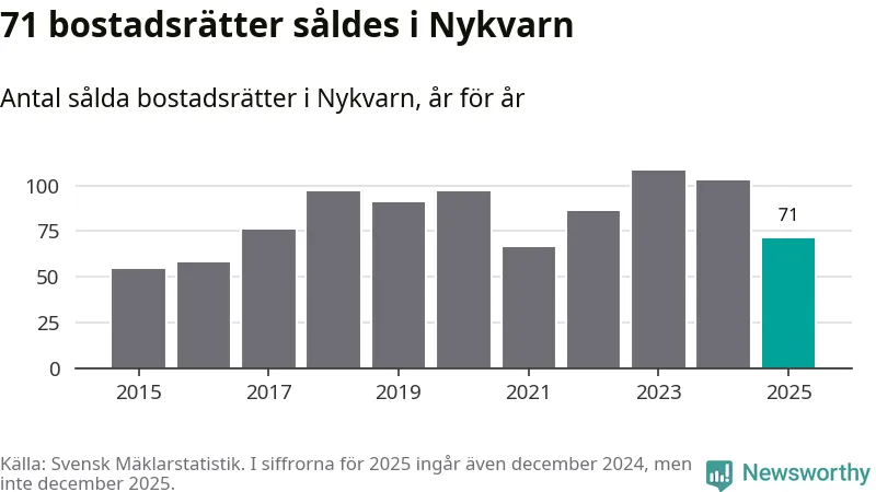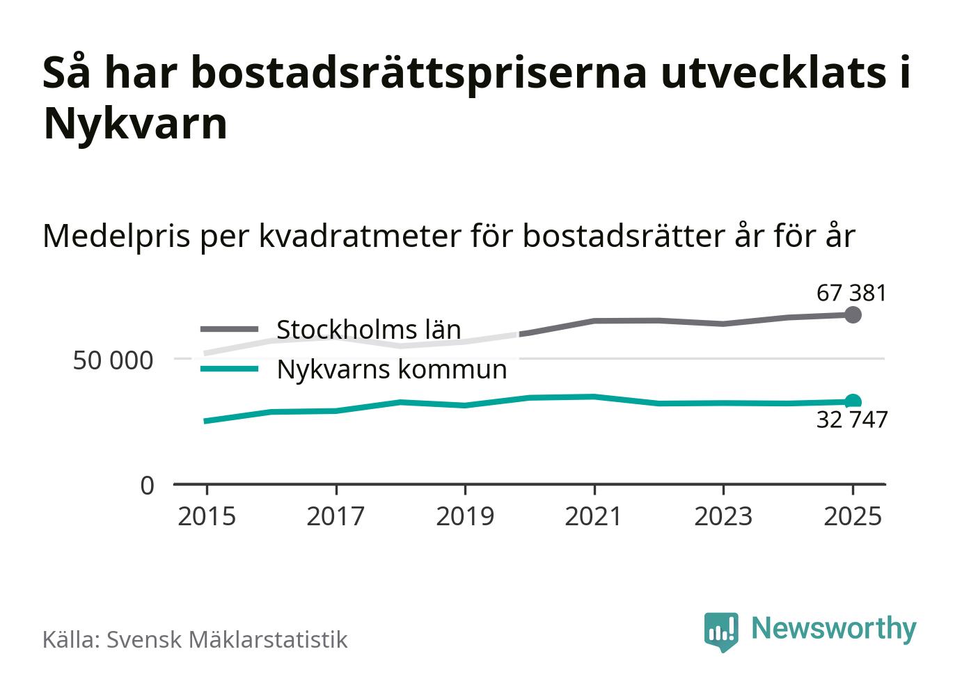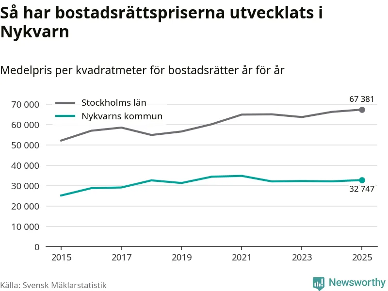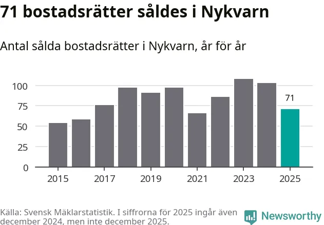 Det såldes totalt 71 bostadsrätter i Nykvarns kommun under året. Genomsnittspriset per kvadratmeter landade på 32 747 kronor. Det är en ökning med två procent i kommunen på ett år.