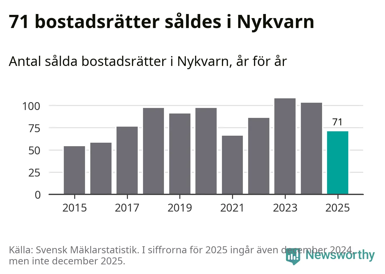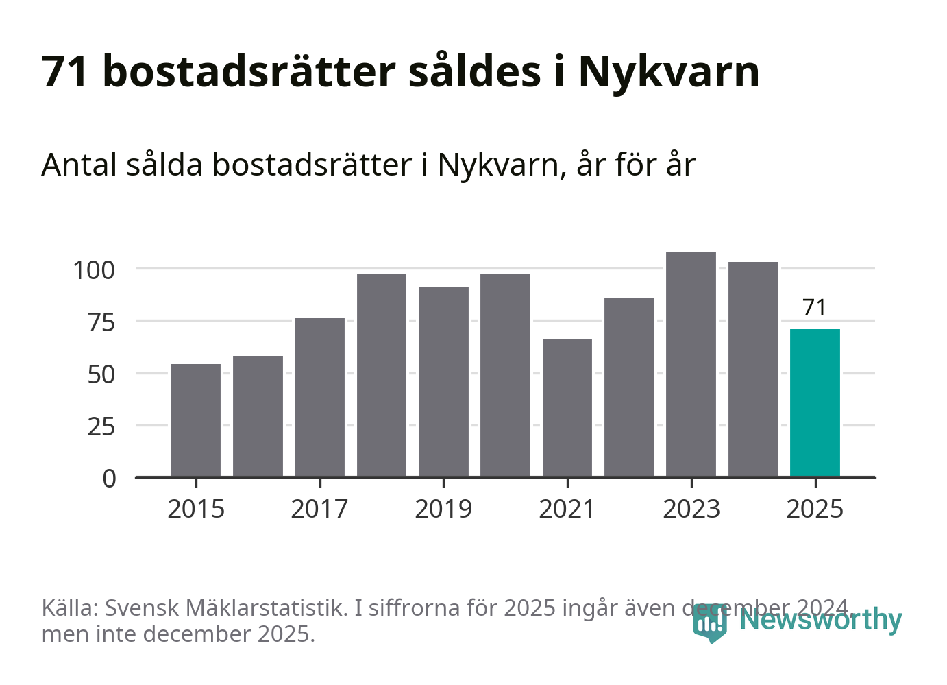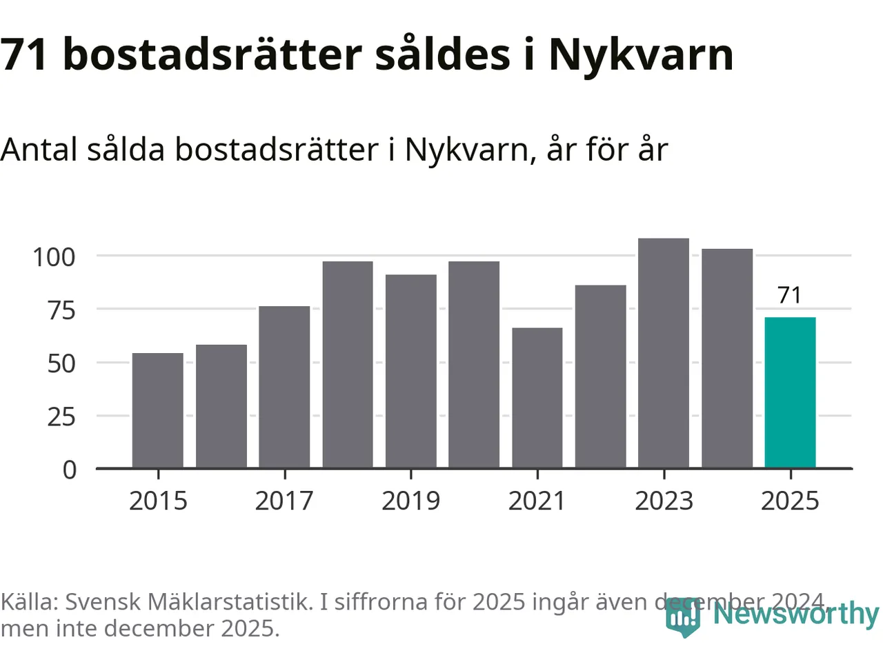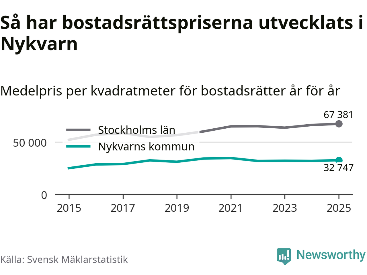 Det såldes totalt 71 bostadsrätter i Nykvarns kommun under året. Genomsnittspriset per kvadratmeter landade på 32 747 kronor. Det är en ökning med två procent i kommunen på ett år.