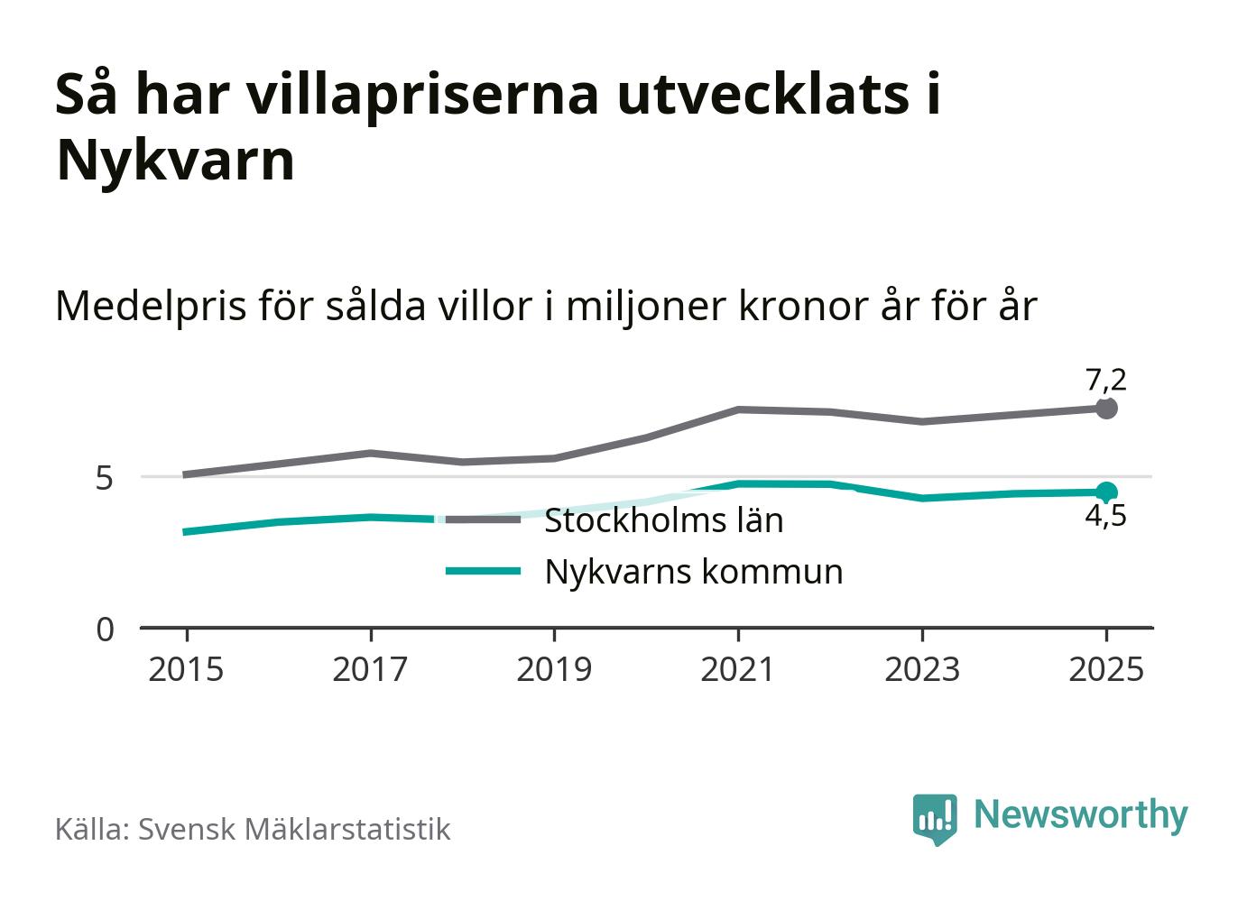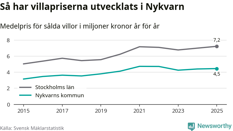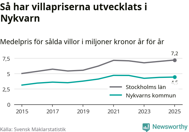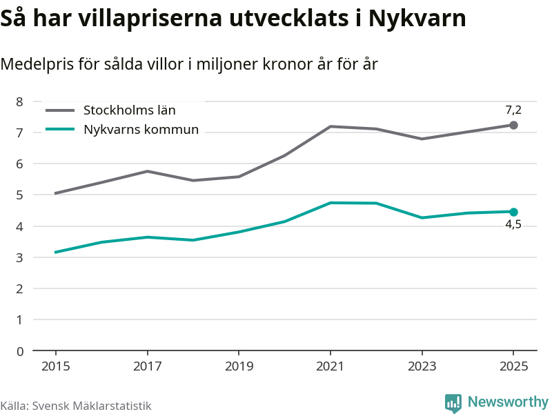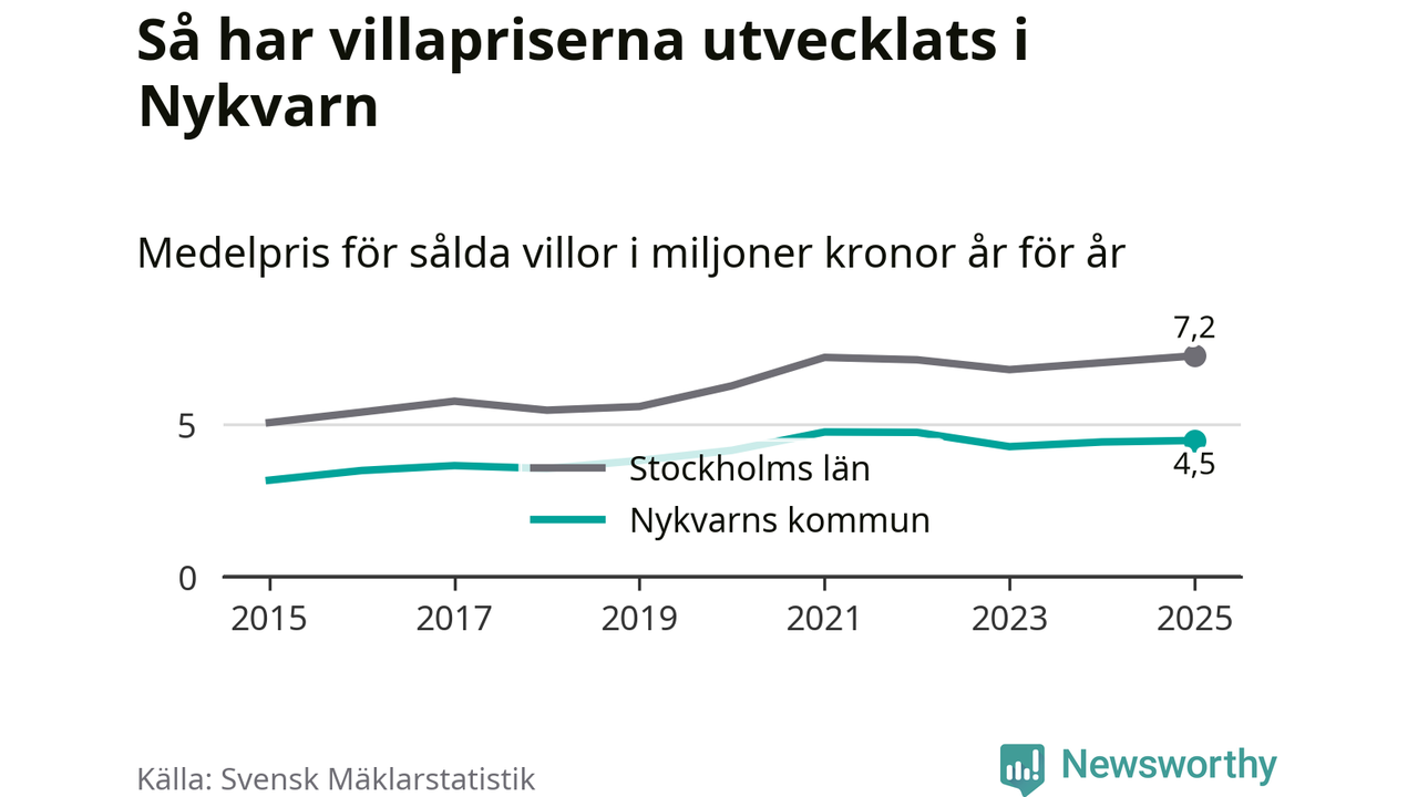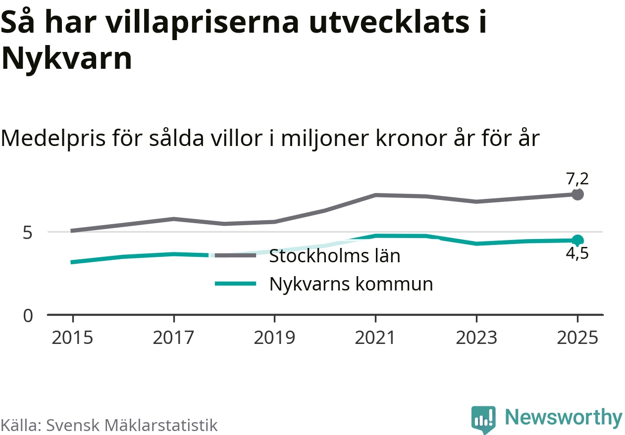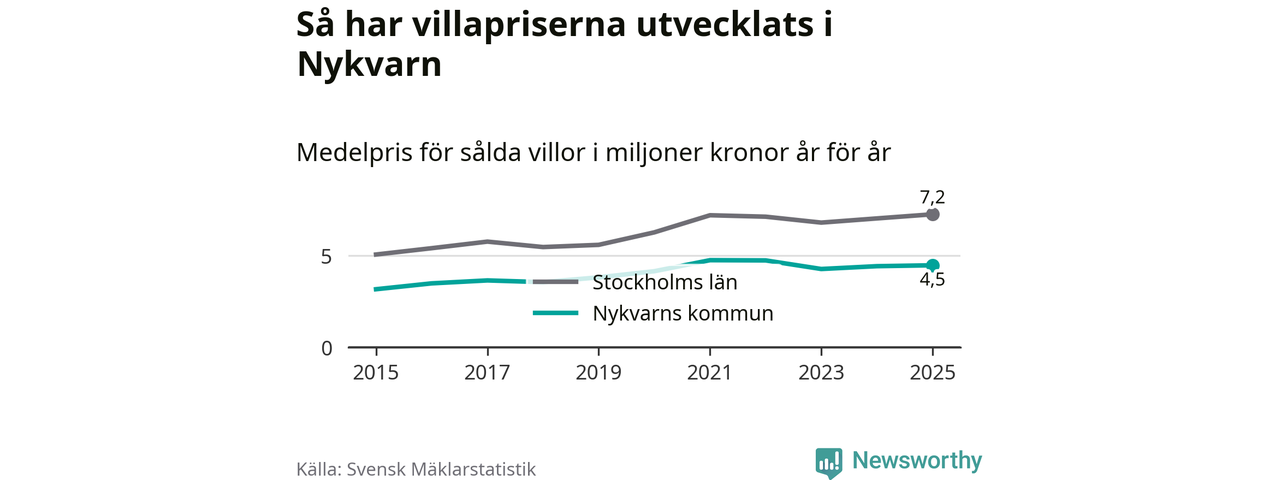 4,5 miljoner kronor är medelpriset för de villor som såldes i Nykvarns kommun under året, eller 36 614 kronor per kvadratmeter. Det innebär en prisökning med en procent på ett år och är andra året i rad som priserna ökar i kommunen.