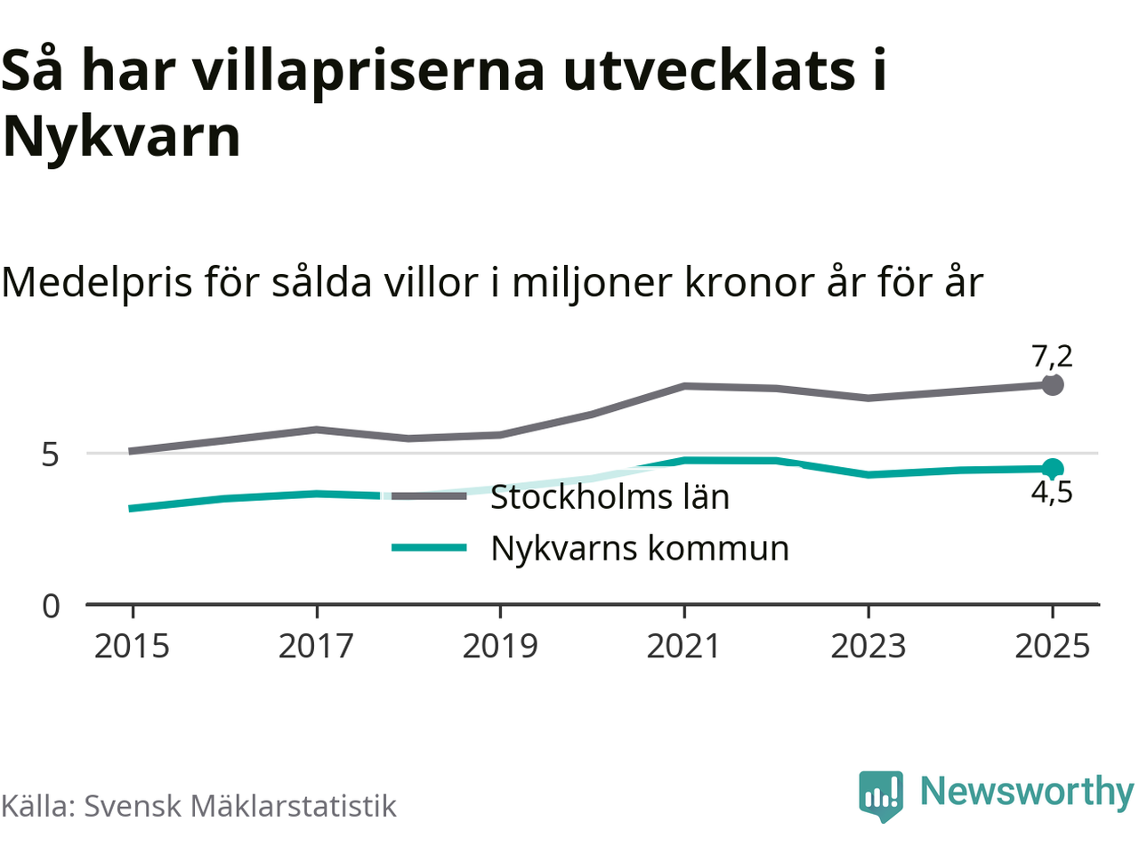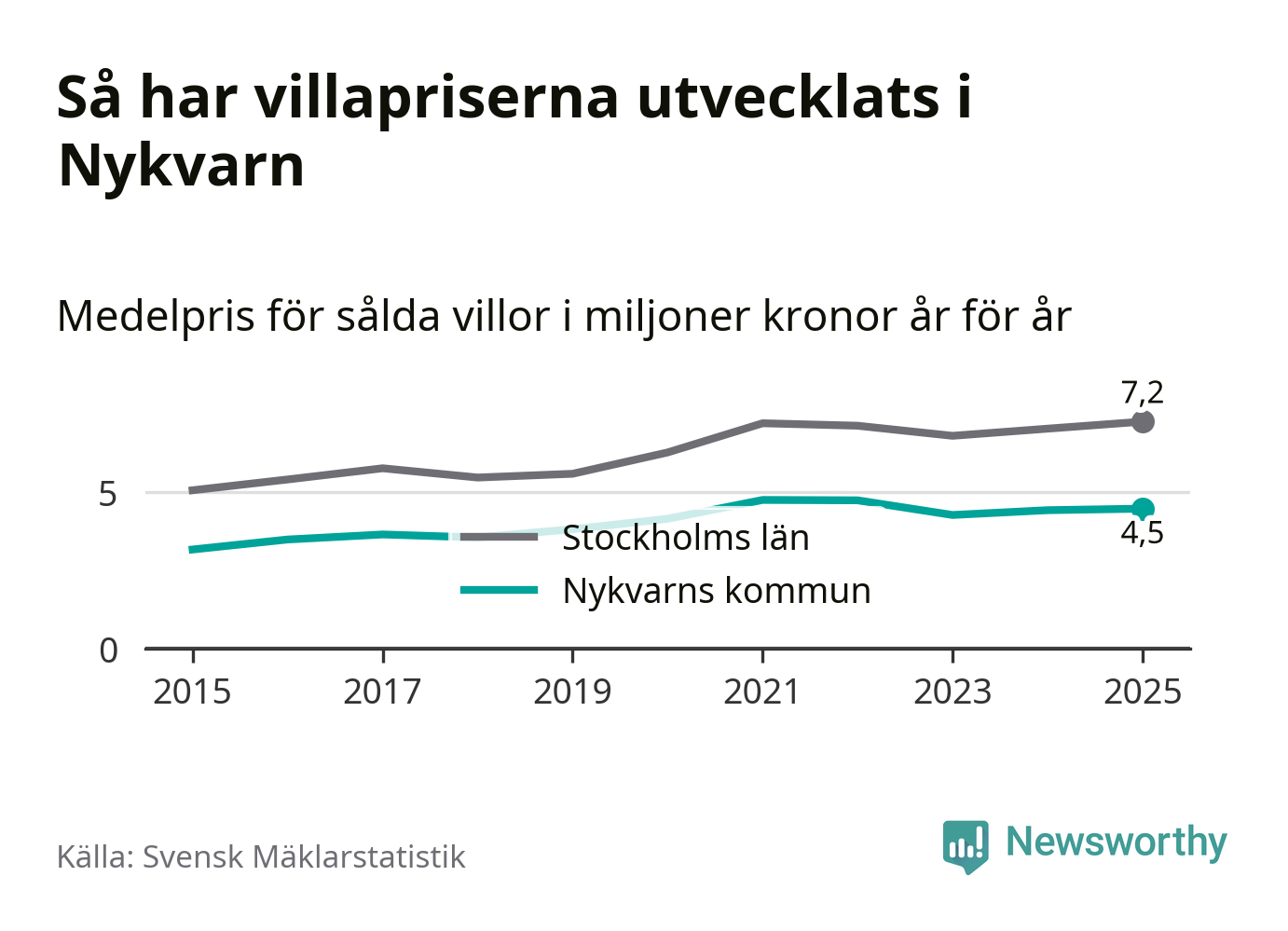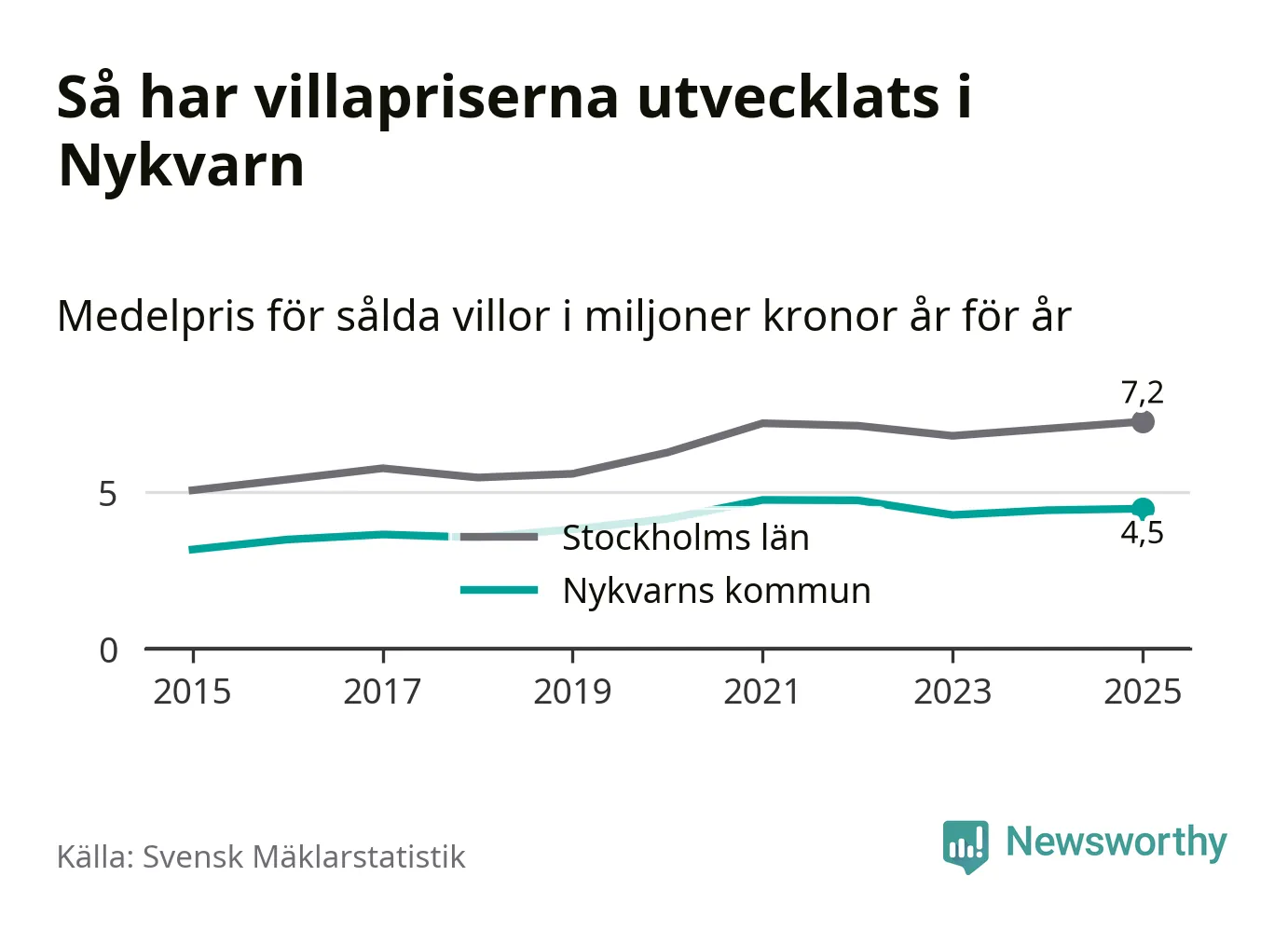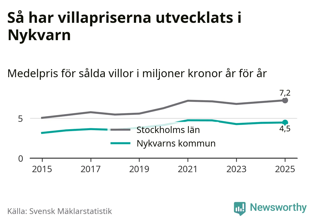 4,5 miljoner kronor är medelpriset för de villor som såldes i Nykvarns kommun under året, eller 36 614 kronor per kvadratmeter. Det innebär en prisökning med en procent på ett år och är andra året i rad som priserna ökar i kommunen.