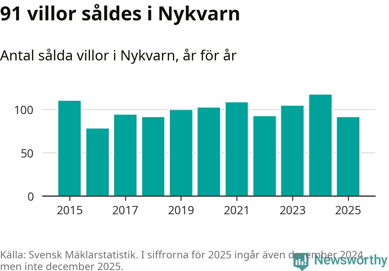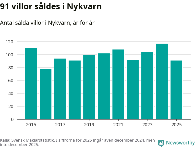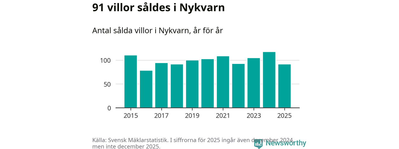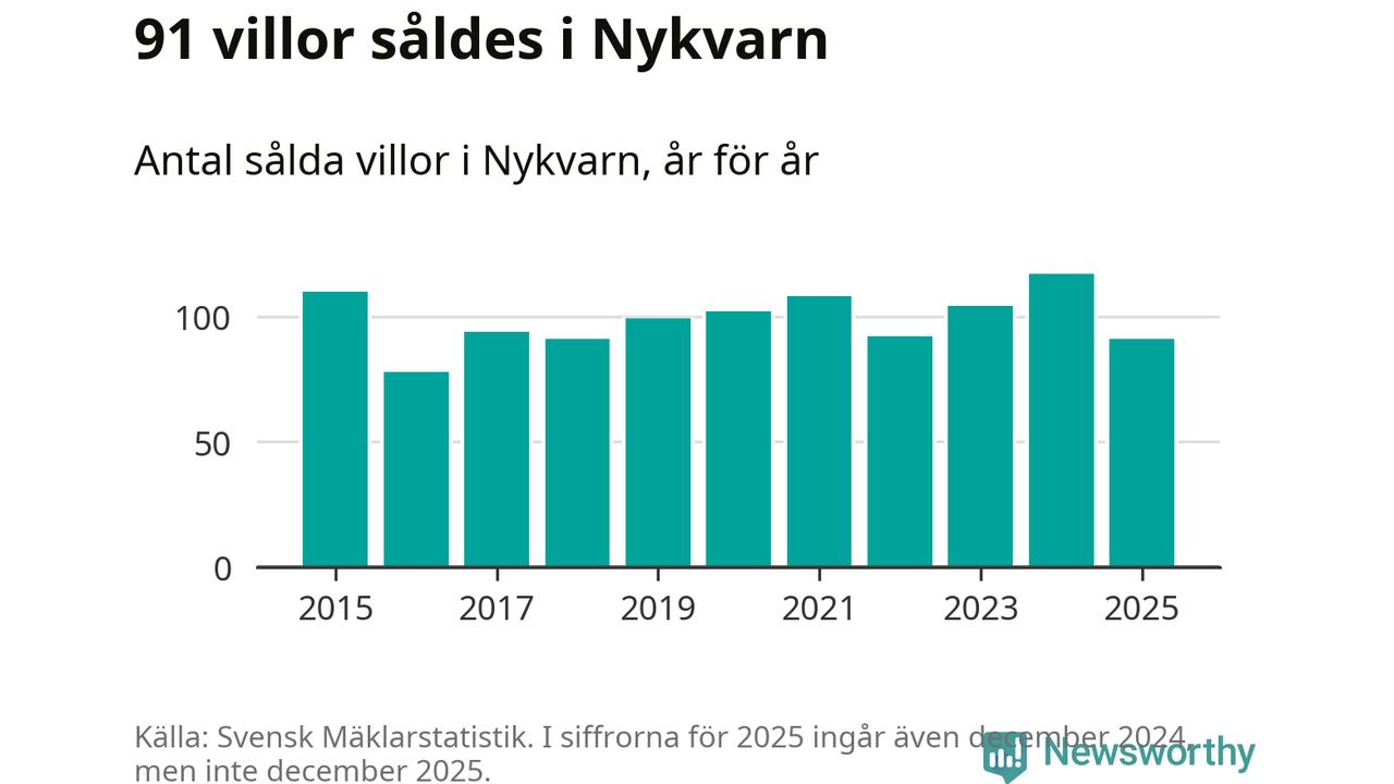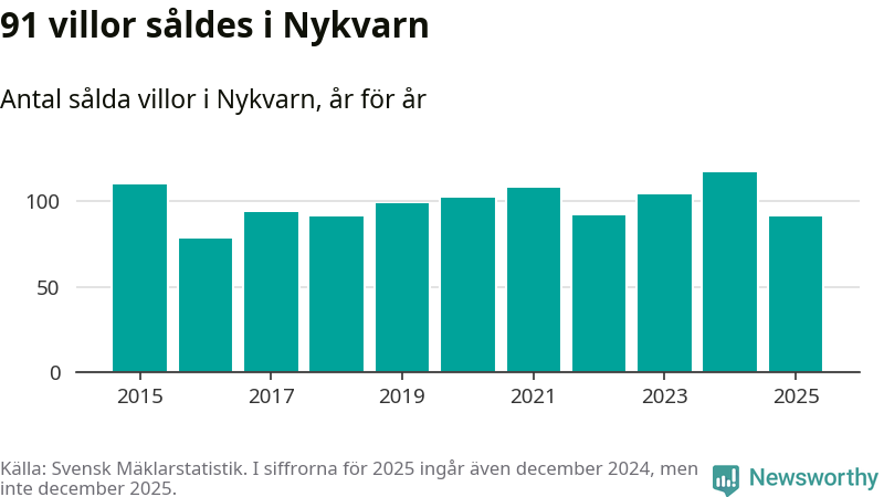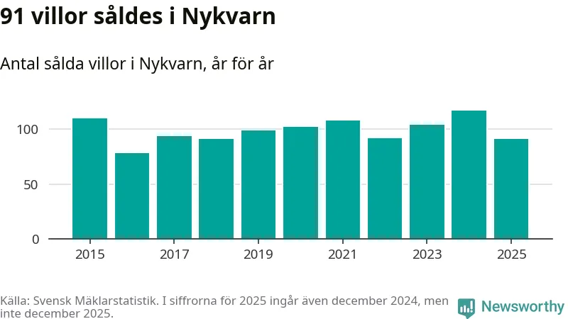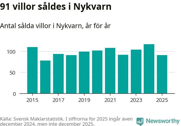 Däremot minskade antalet sålda villor. Totalt såldes 91 villor, att jämföra med 117 under 2024.