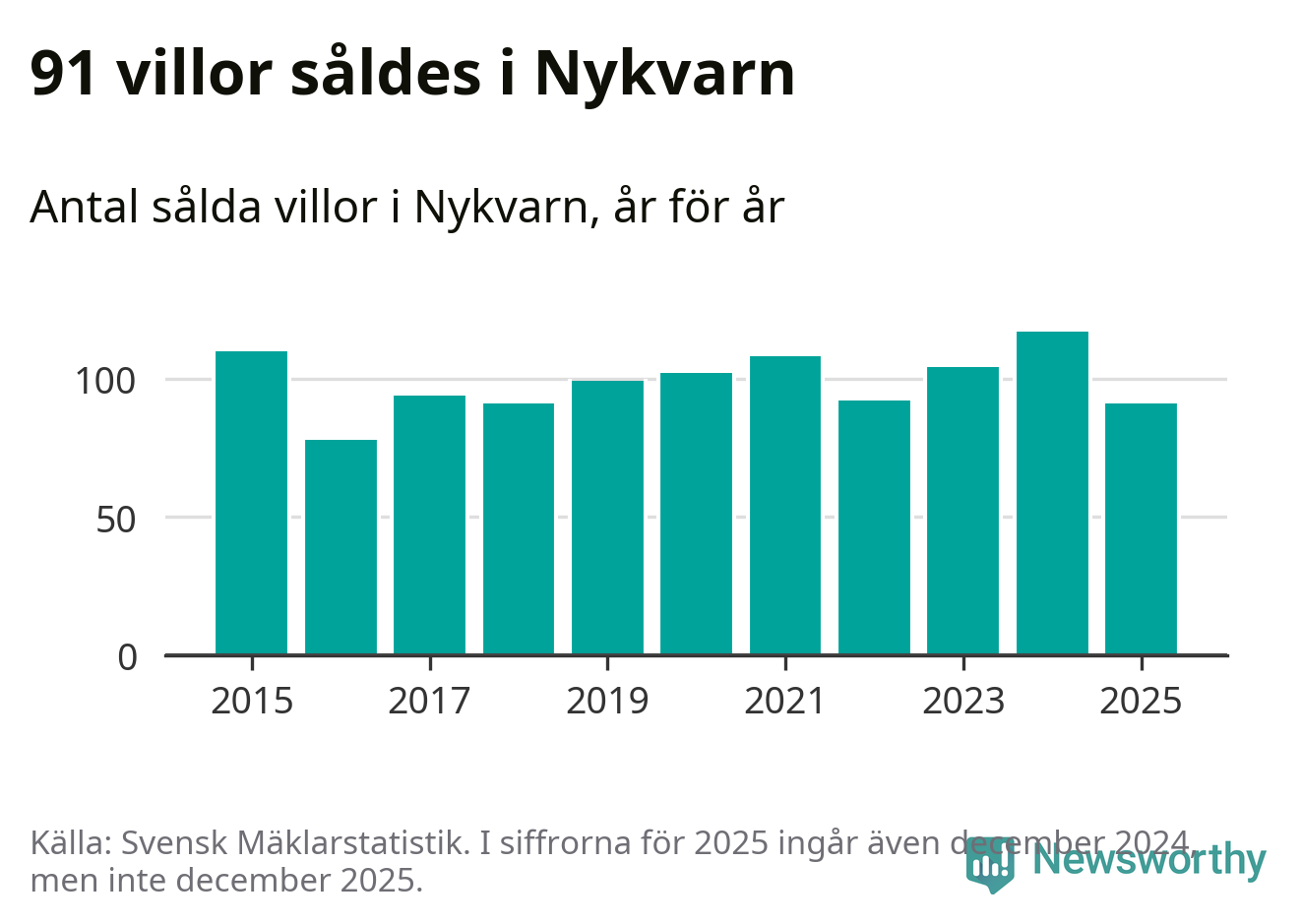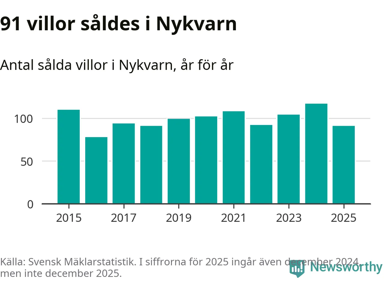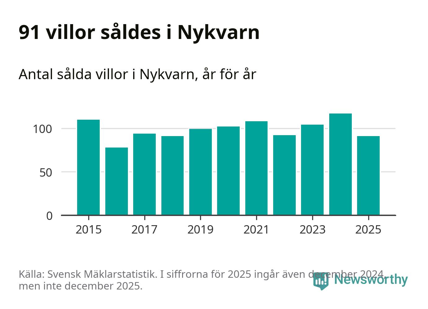 Däremot minskade antalet sålda villor. Totalt såldes 91 villor, att jämföra med 117 under 2024.