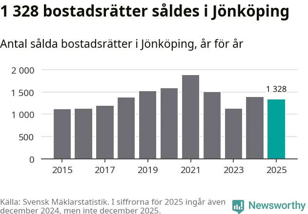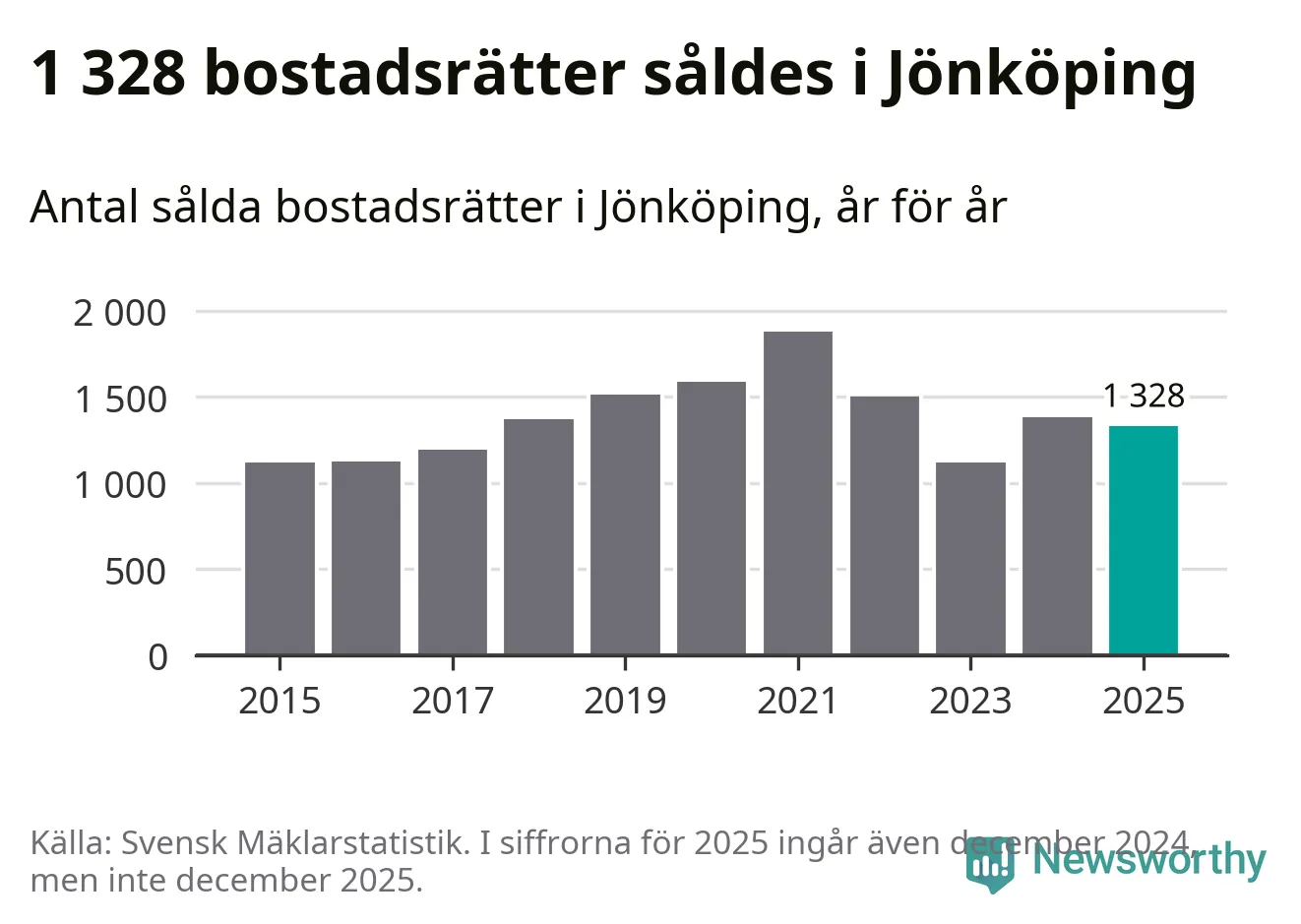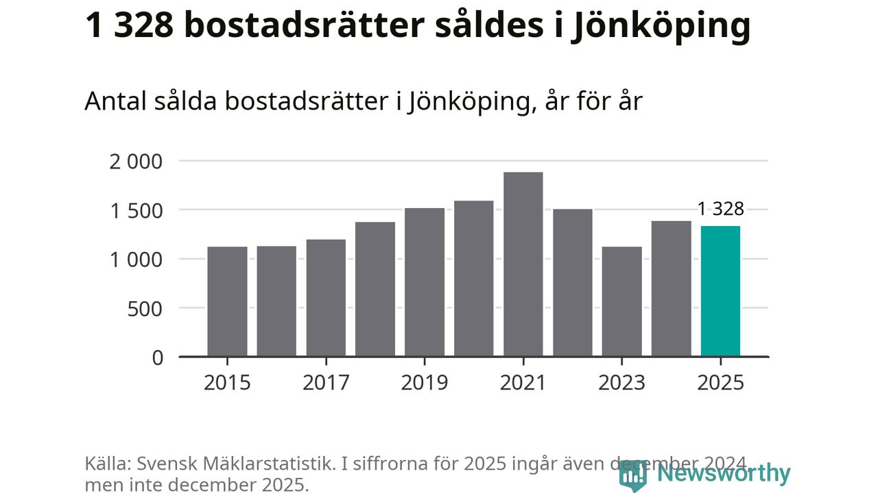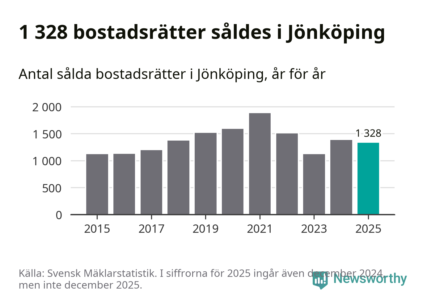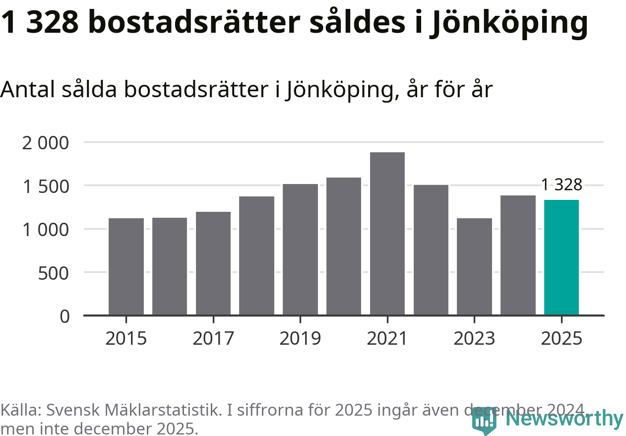 Det såldes totalt 1 328 bostadsrätter i Jönköpings kommun under året. Genomsnittspriset per kvadratmeter landade på 30 638 kronor, vilket är ungefär samma nivå som förra året.