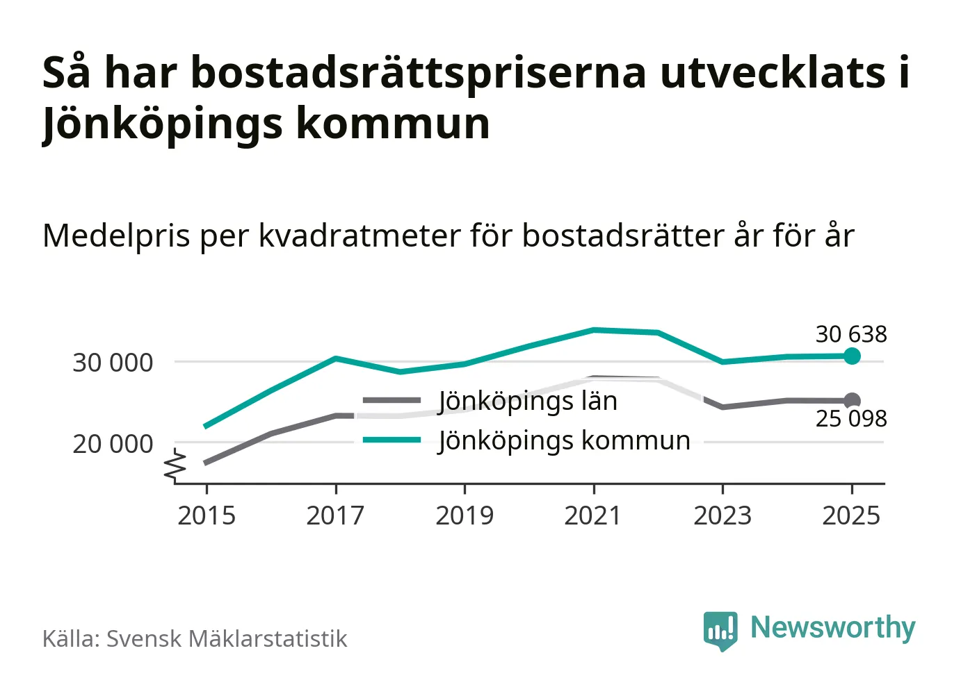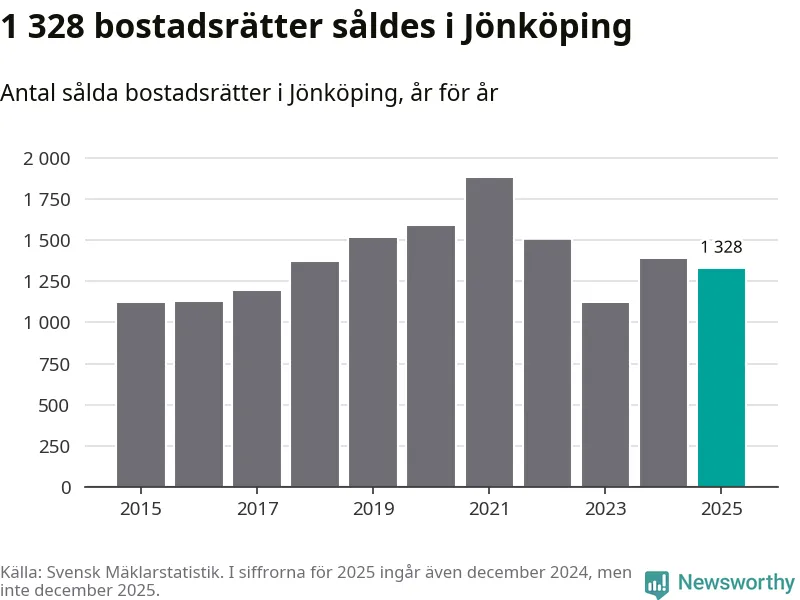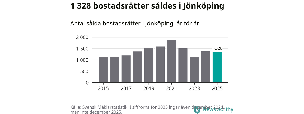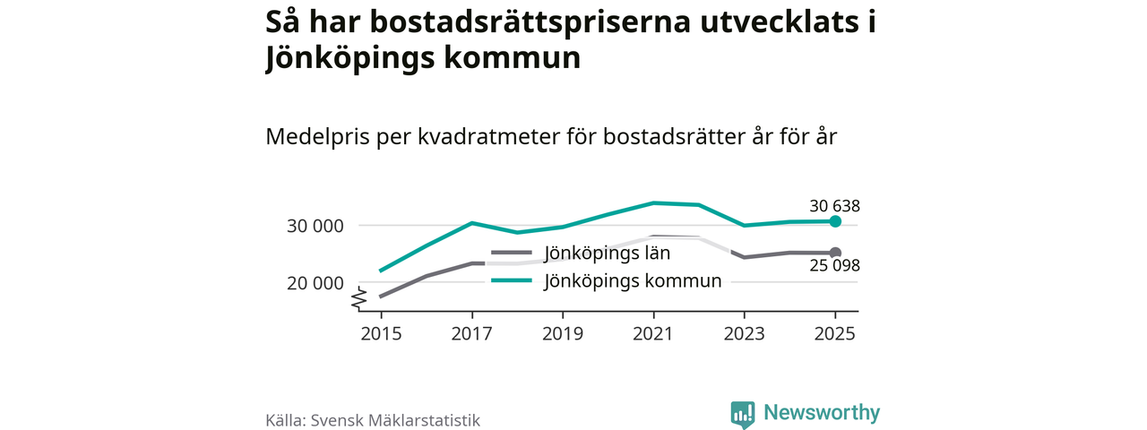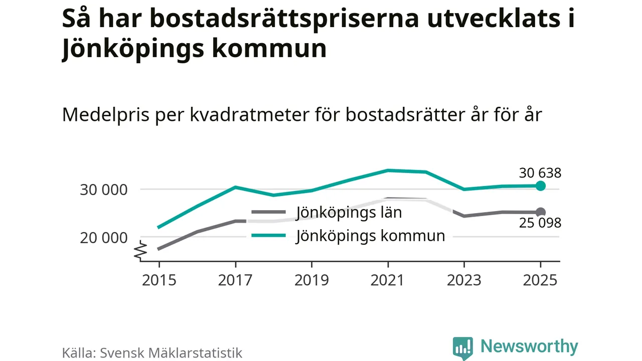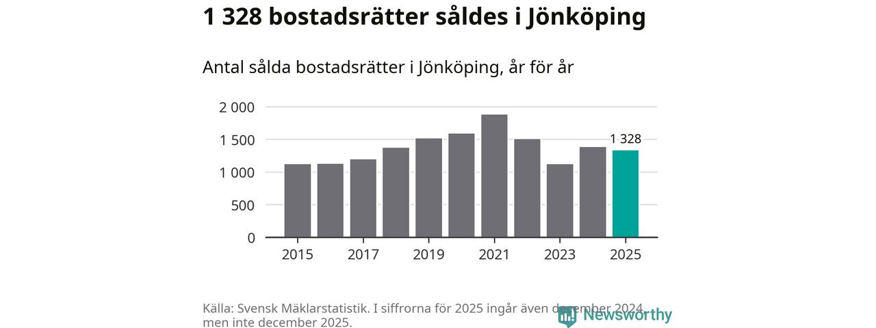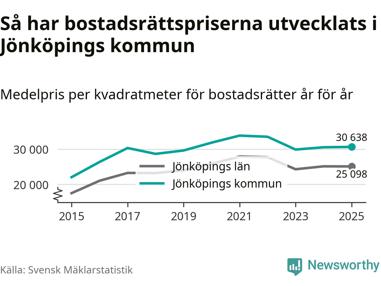 Det såldes totalt 1 328 bostadsrätter i Jönköpings kommun under året. Genomsnittspriset per kvadratmeter landade på 30 638 kronor, vilket är ungefär samma nivå som förra året.