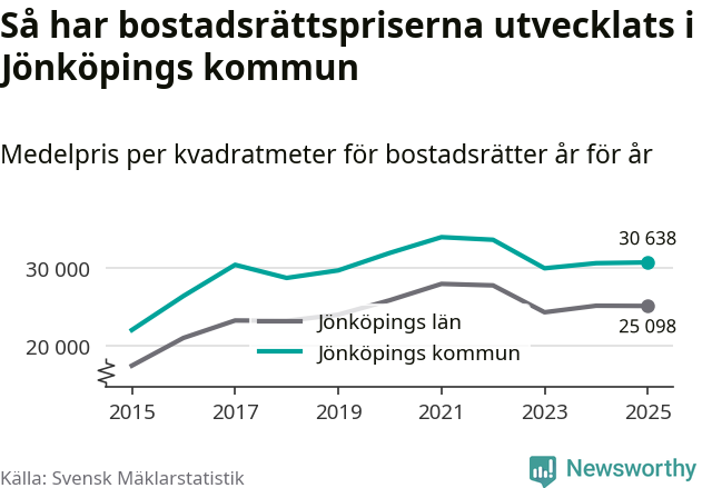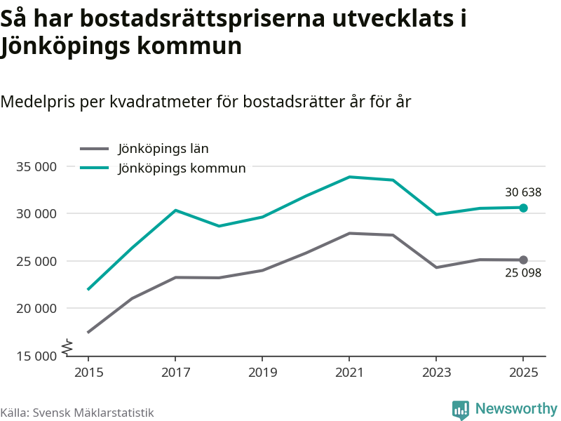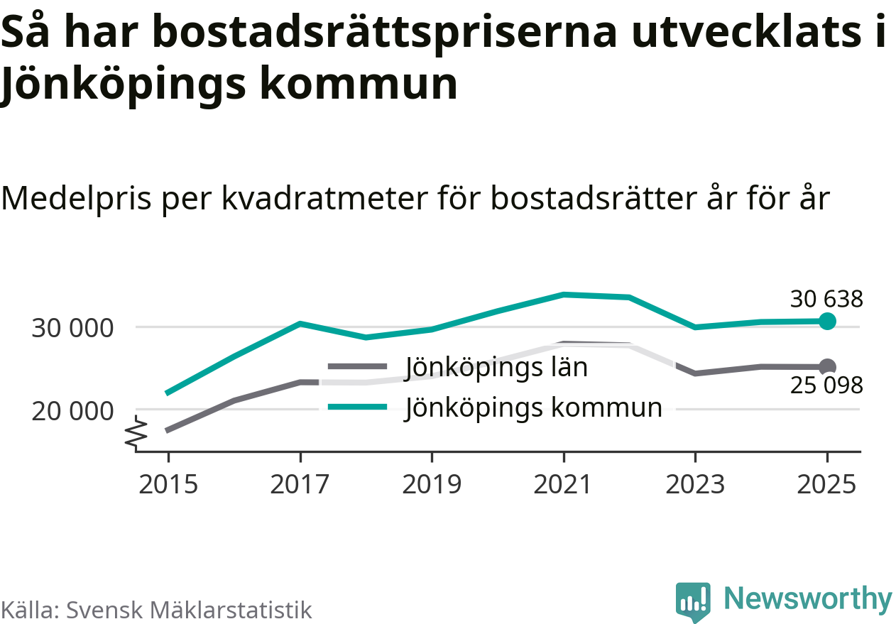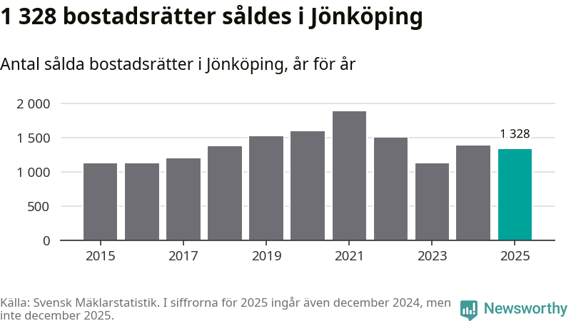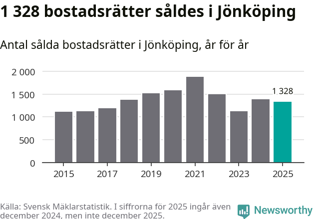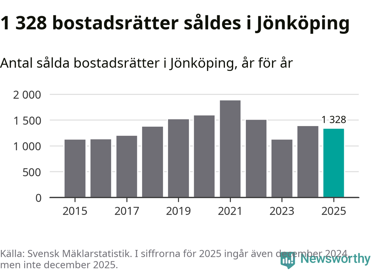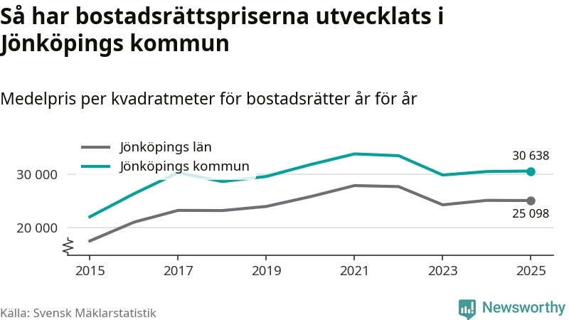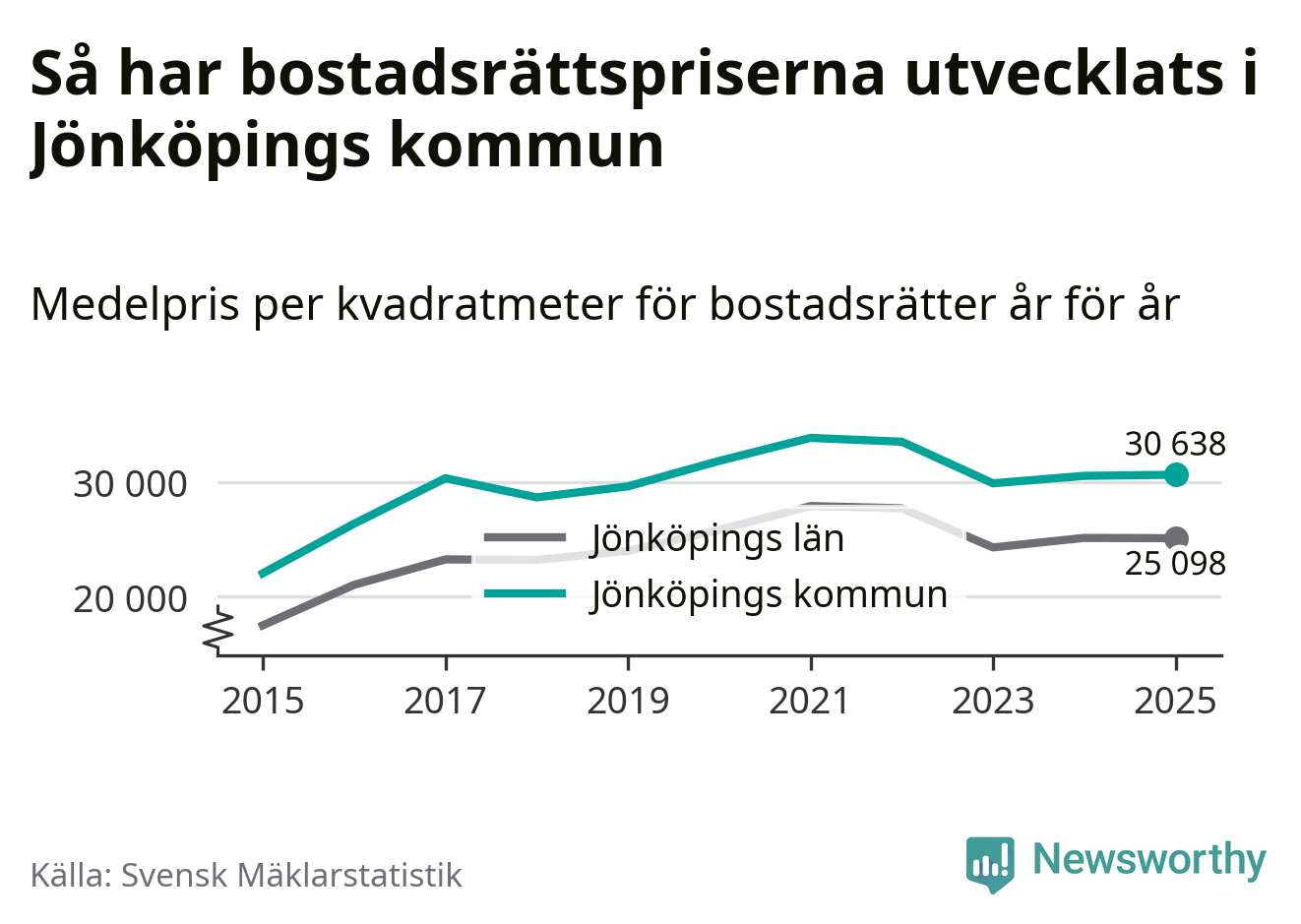Det såldes totalt 1 328 bostadsrätter i Jönköpings kommun under året. Genomsnittspriset per kvadratmeter landade på 30 638 kronor, vilket är ungefär samma nivå som förra året.