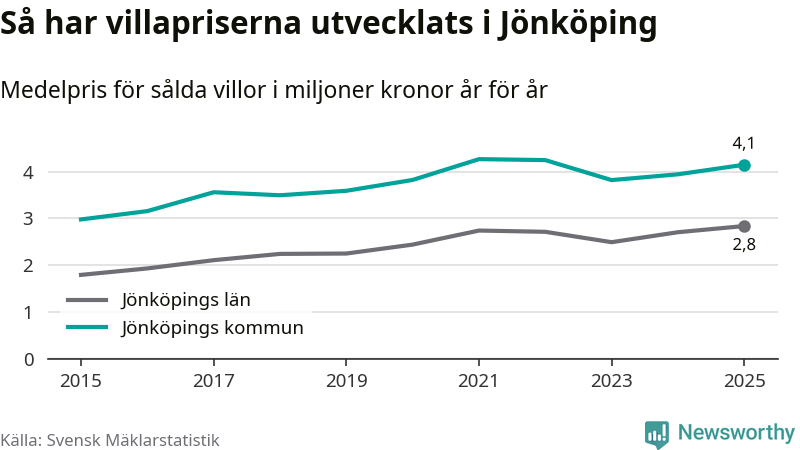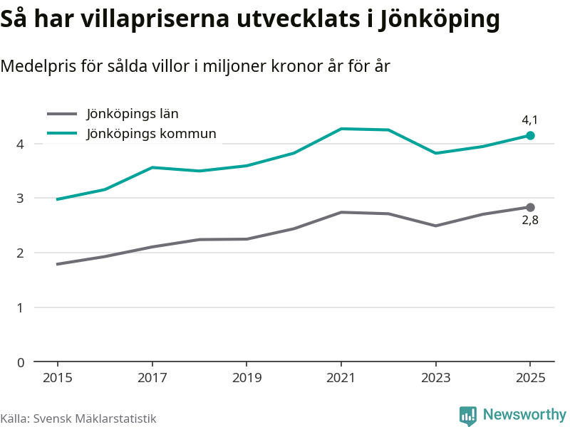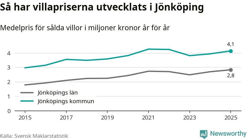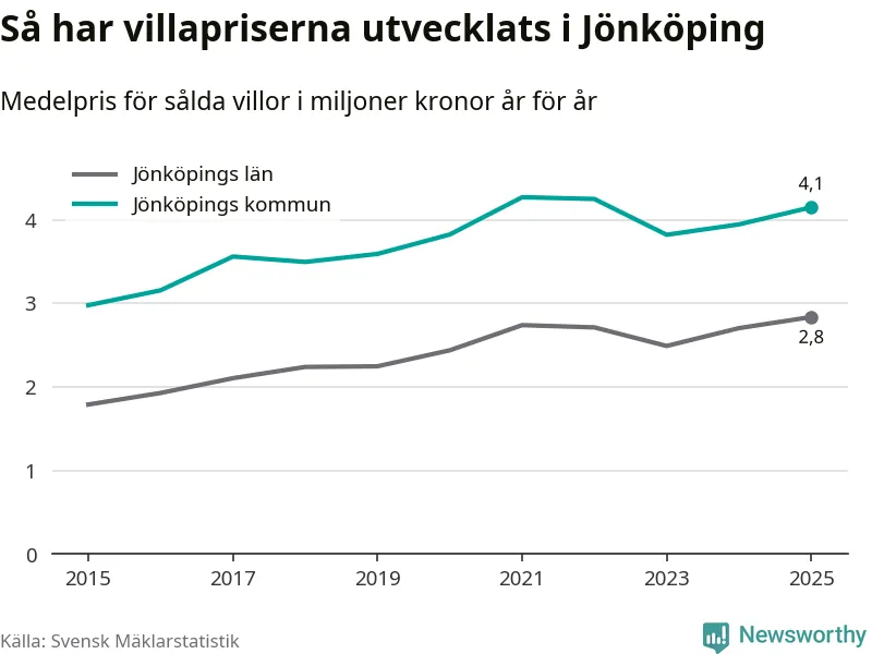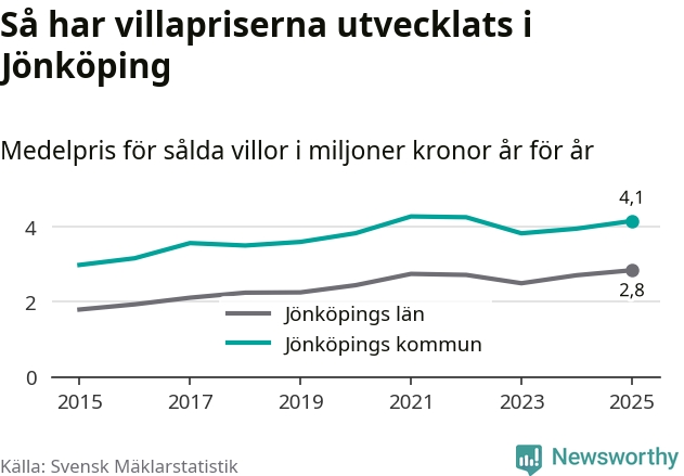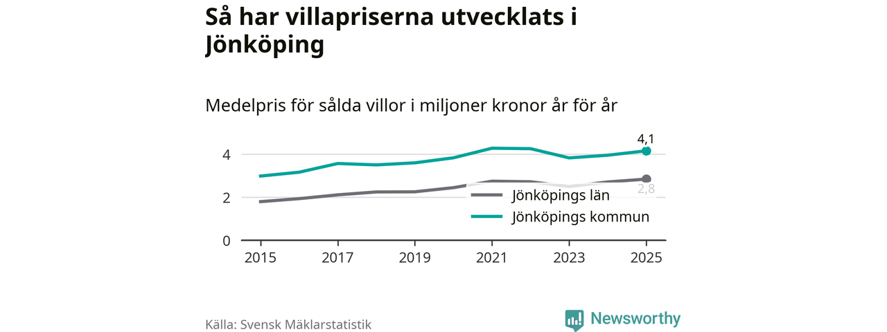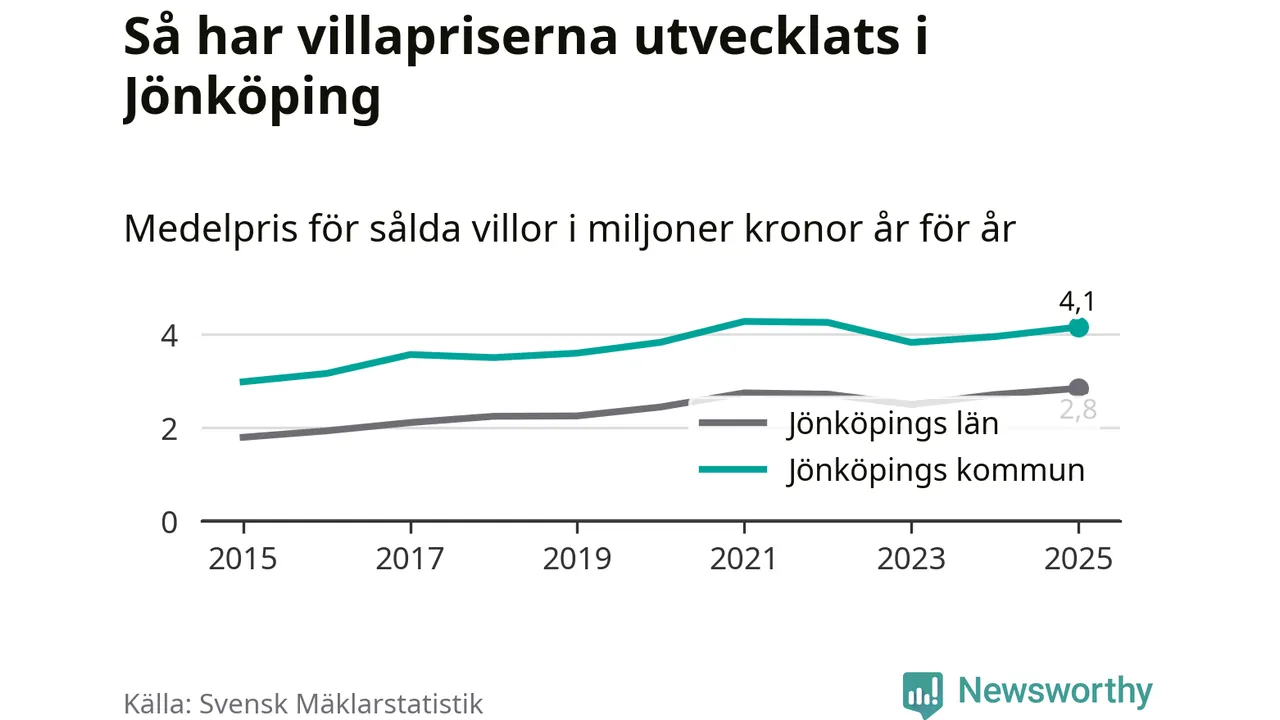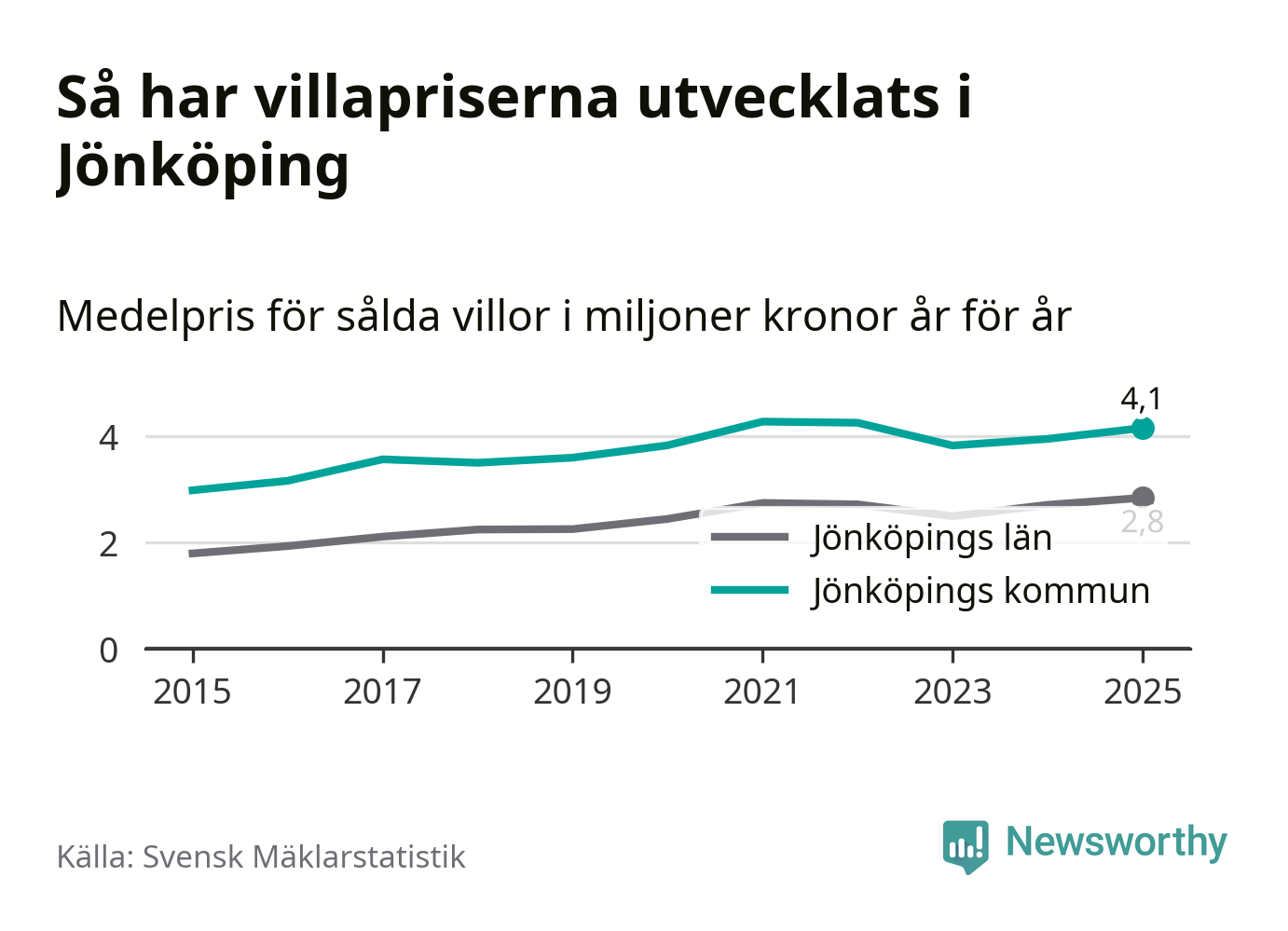 4,1 miljoner kronor är medelpriset för de villor som såldes i Jönköpings kommun under året, eller 30 673 kronor per kvadratmeter. Det innebär en prisökning med fem procent på ett år och är andra året i rad som priserna ökar i kommunen.