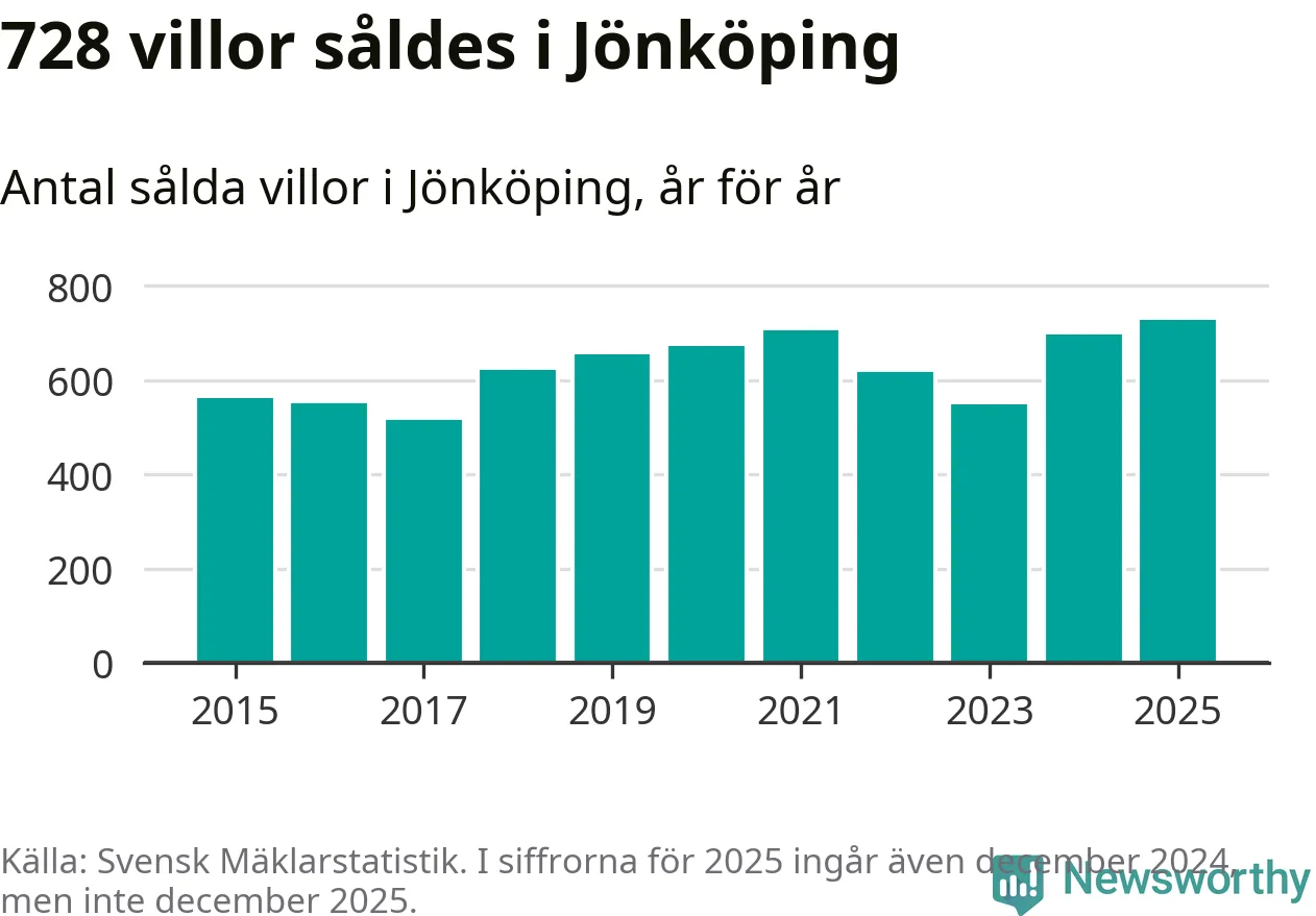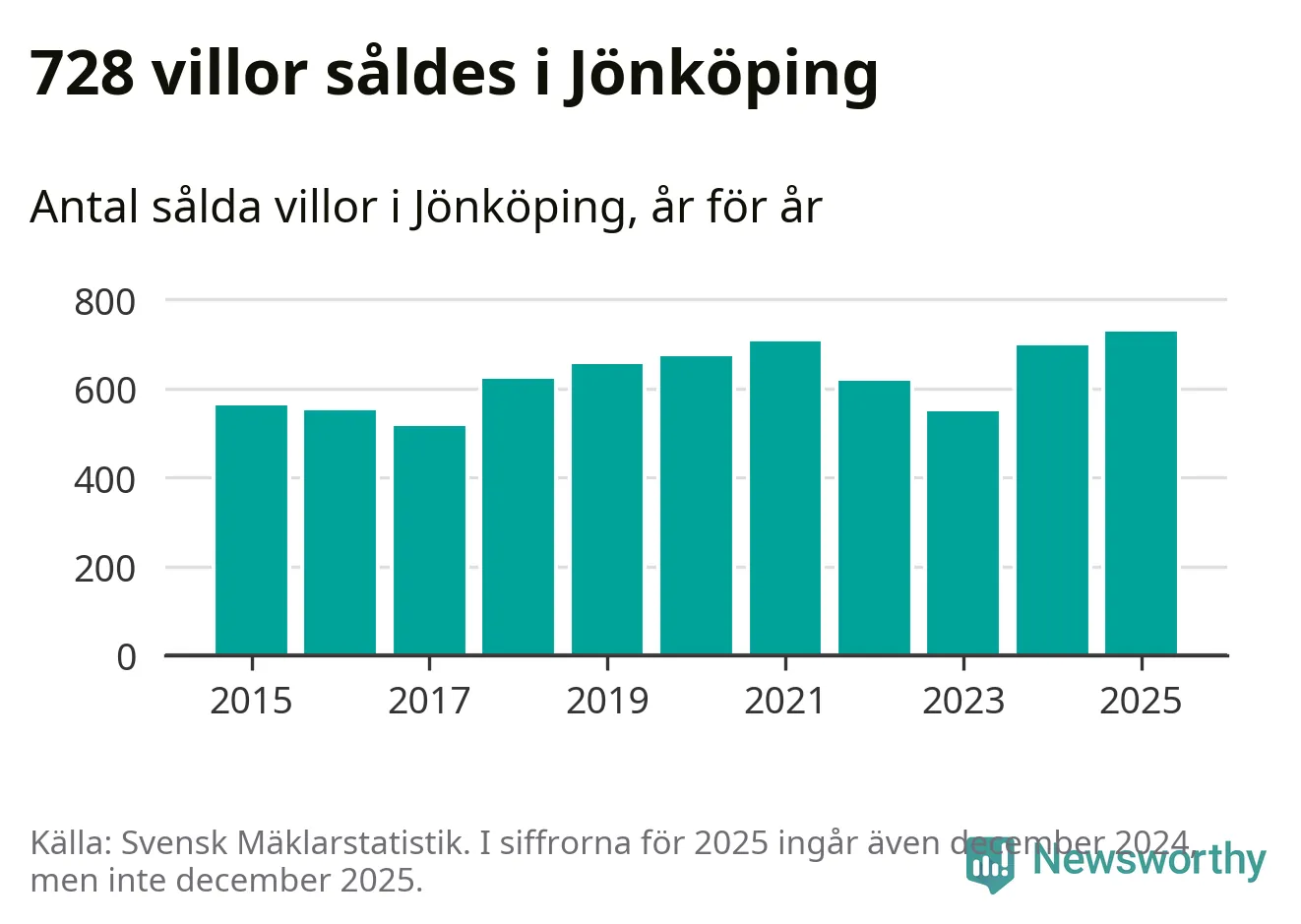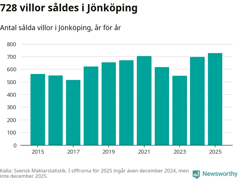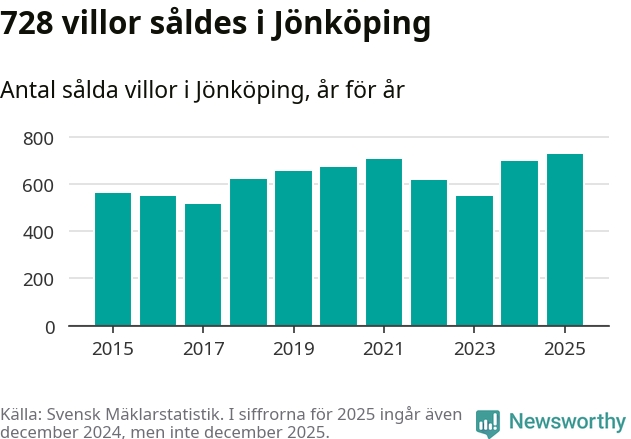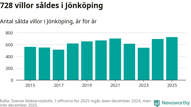 Antalet sålda villor ökade också. Totalt såldes 728 villor, att jämföra med 697 under 2024. Det är fler än något annat år sedan 2015.
