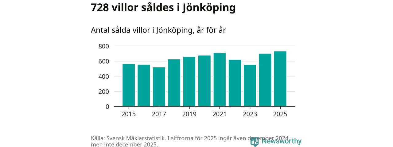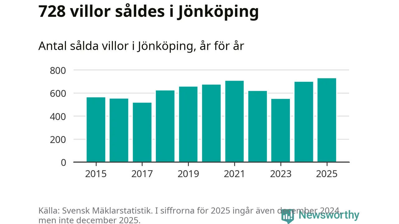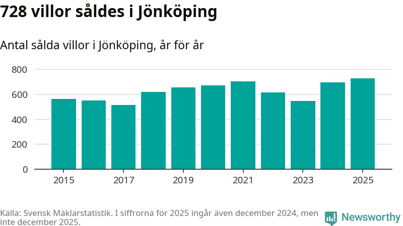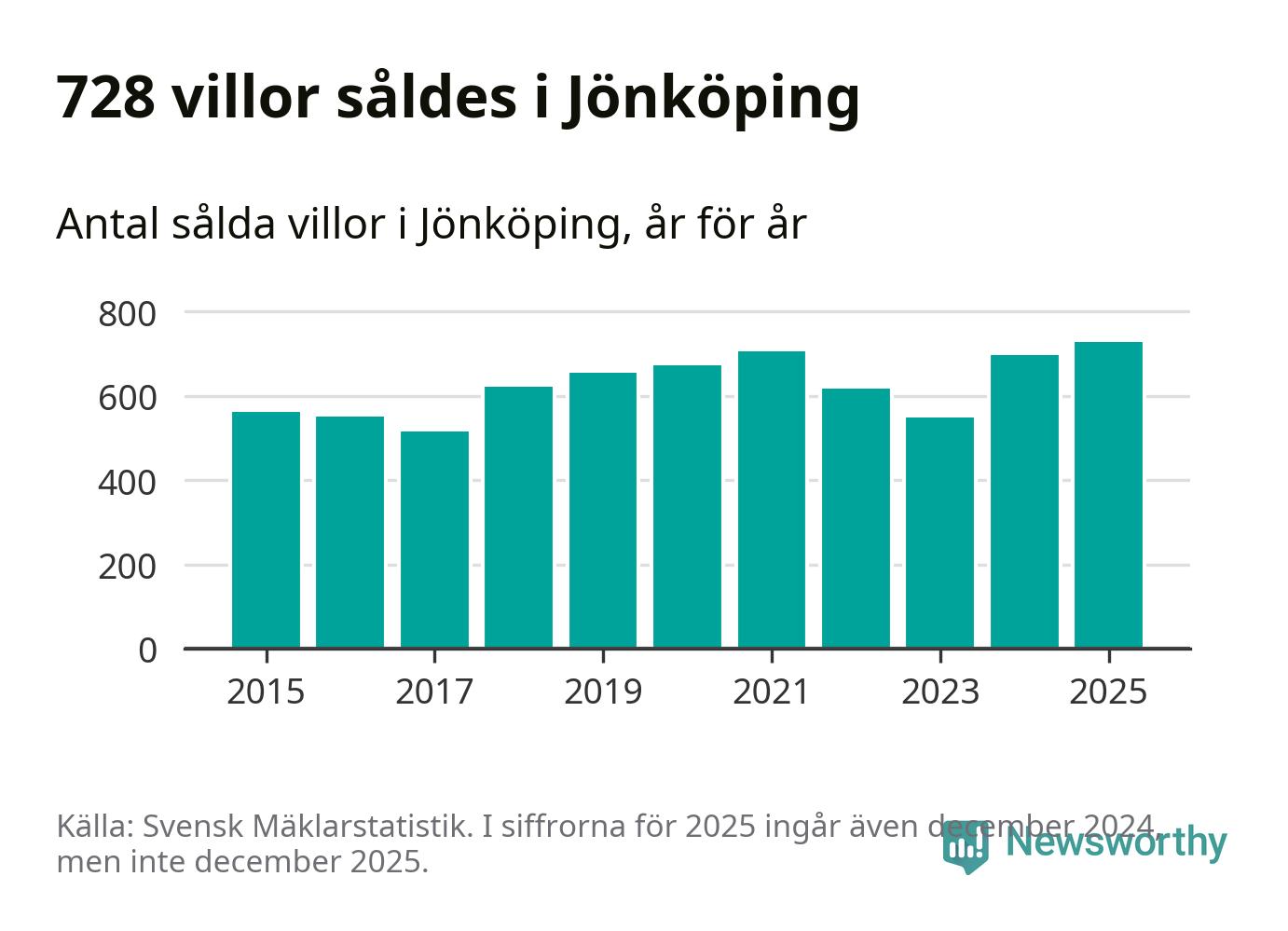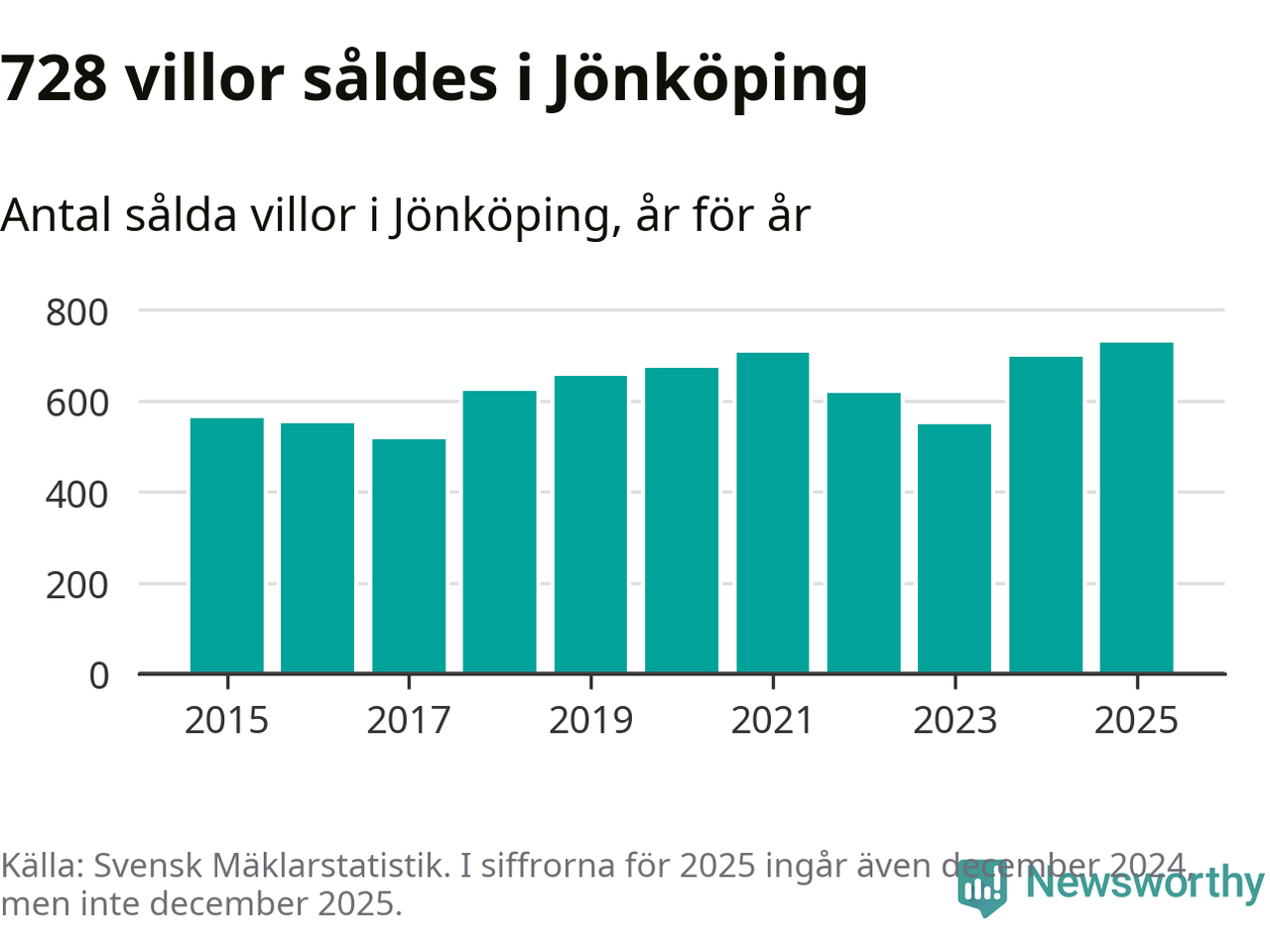 Antalet sålda villor ökade också. Totalt såldes 728 villor, att jämföra med 697 under 2024. Det är fler än något annat år sedan 2015.