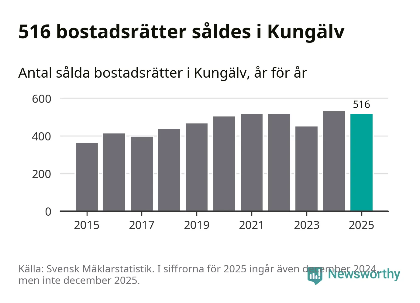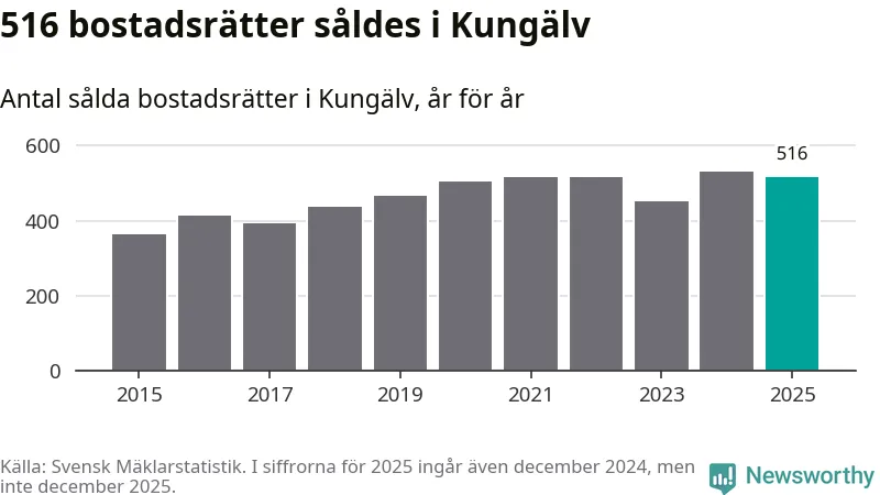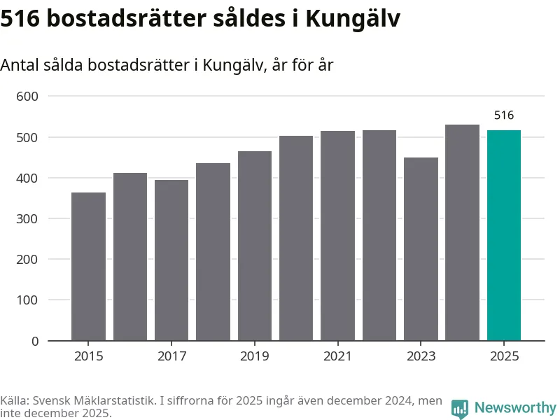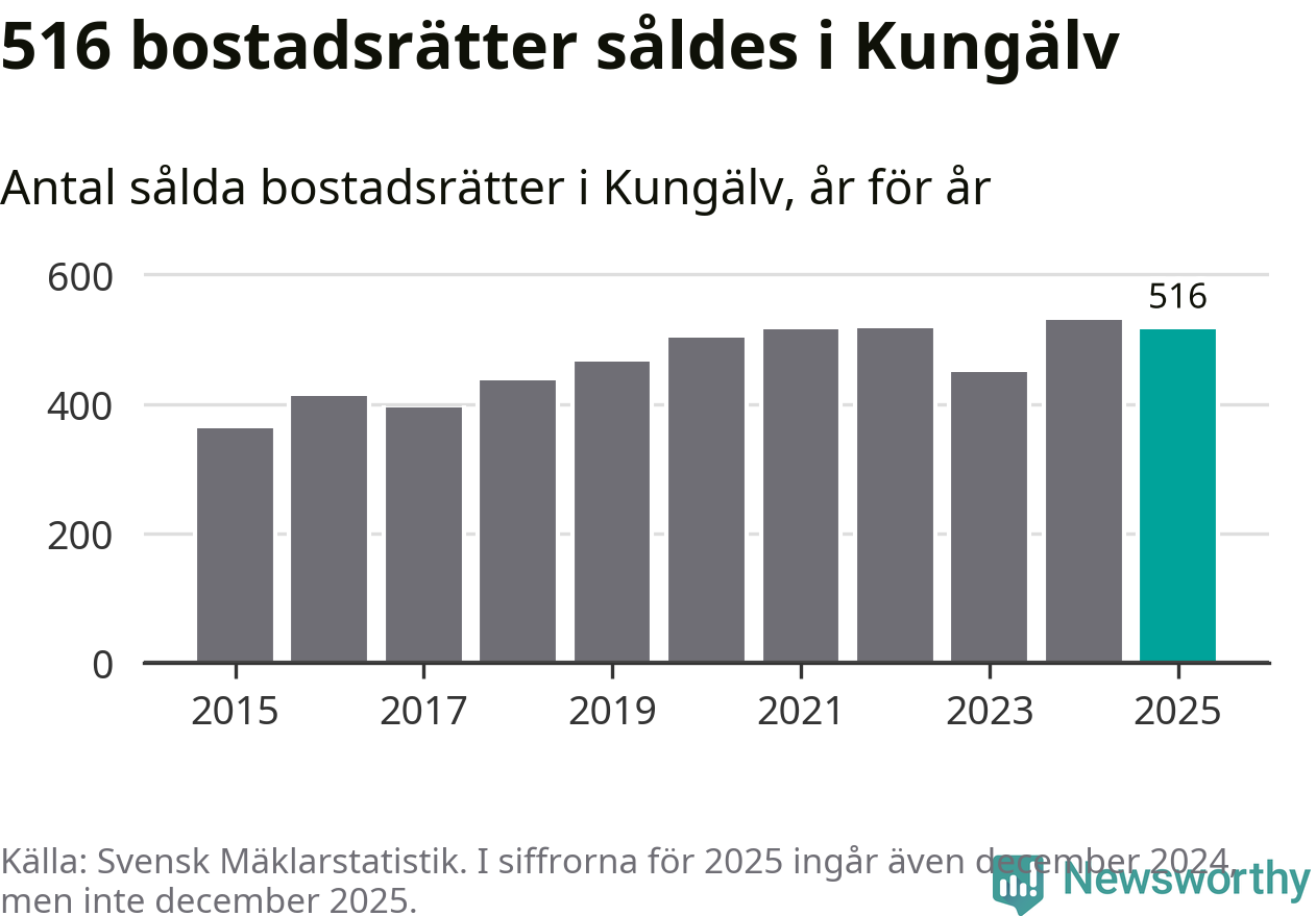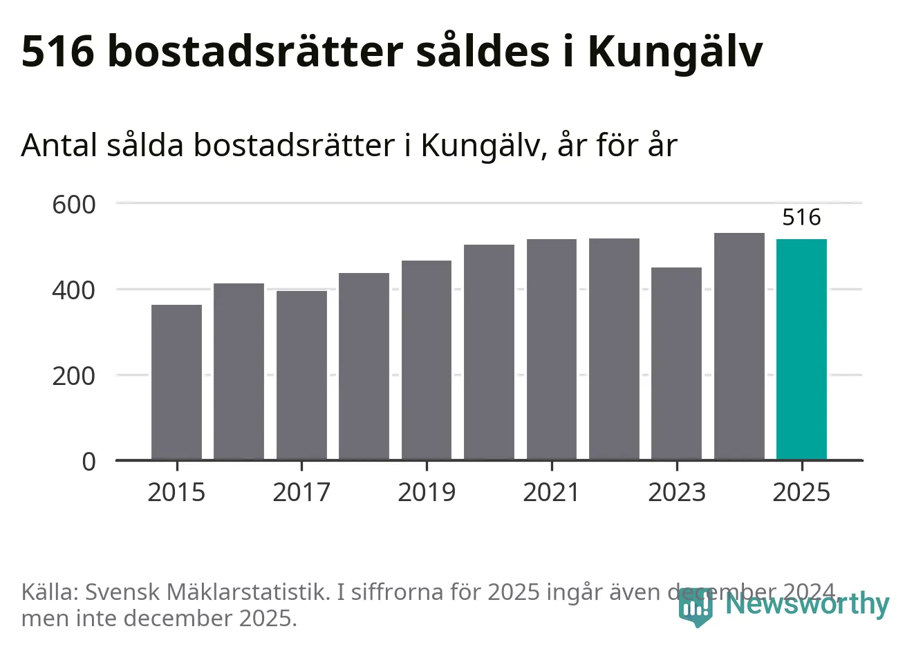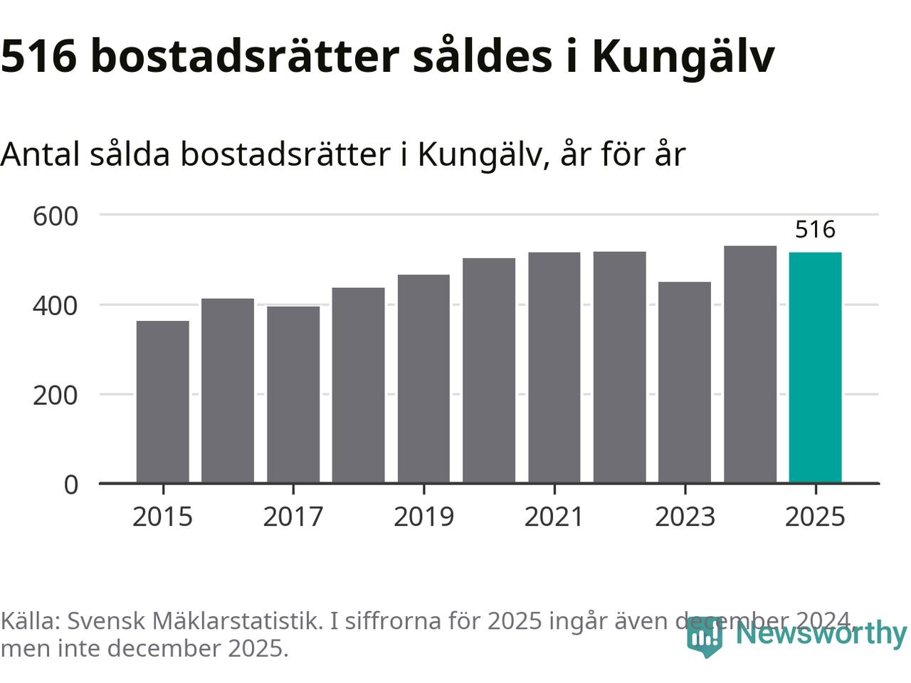 Det såldes totalt 516 bostadsrätter i Kungälvs kommun under året. Genomsnittspriset per kvadratmeter landade på 36 365 kronor, vilket är ungefär samma nivå som förra året.