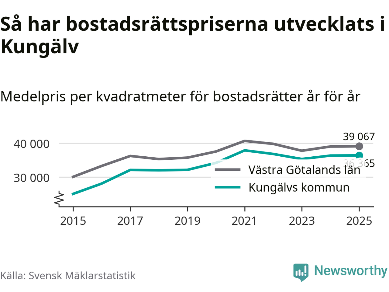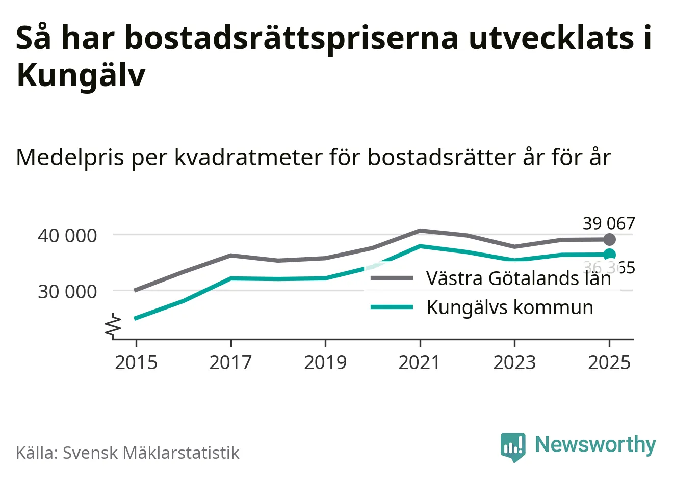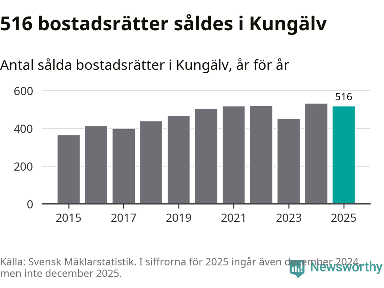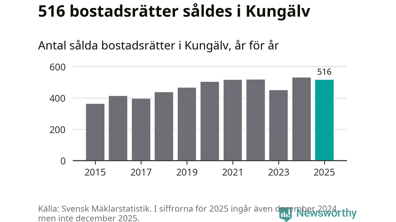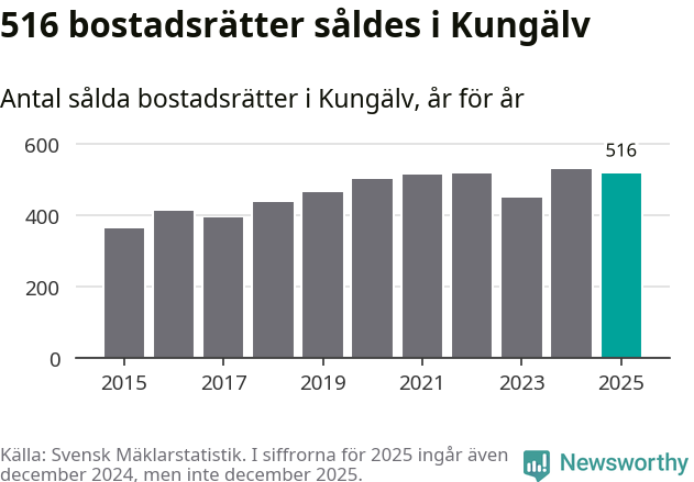 Det såldes totalt 516 bostadsrätter i Kungälvs kommun under året. Genomsnittspriset per kvadratmeter landade på 36 365 kronor, vilket är ungefär samma nivå som förra året.
