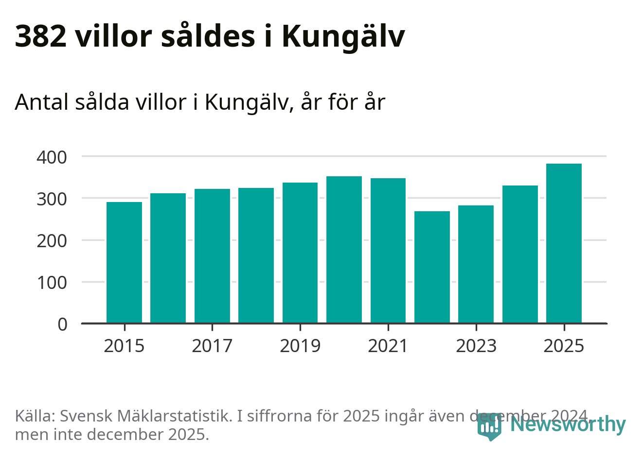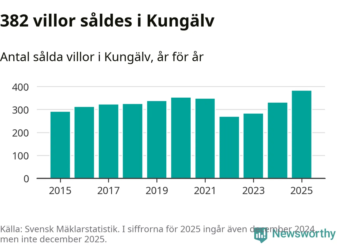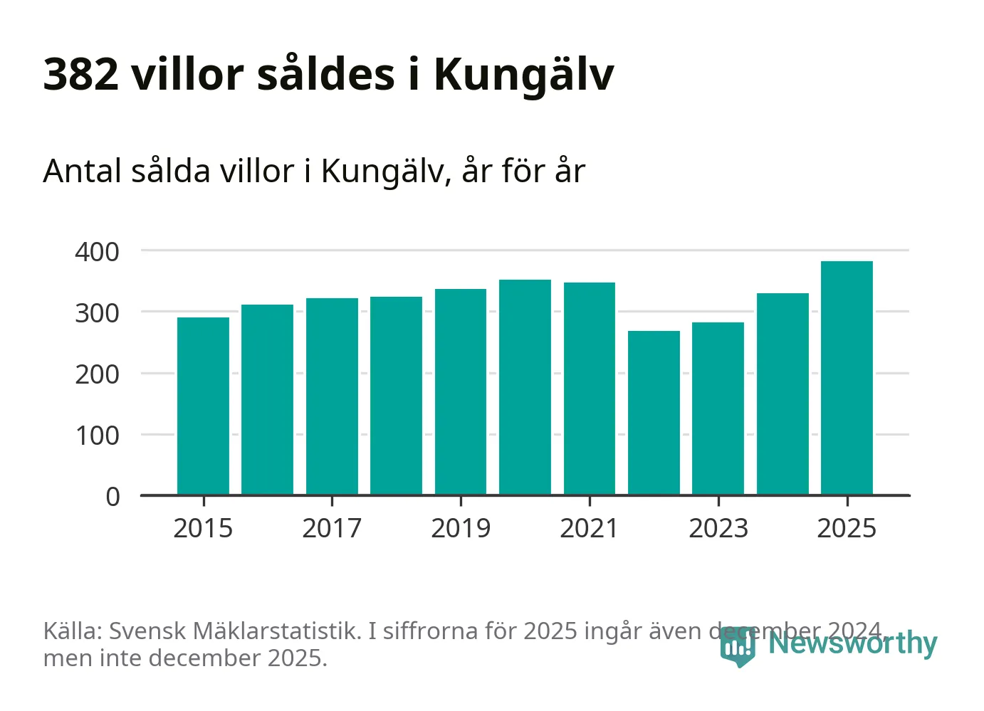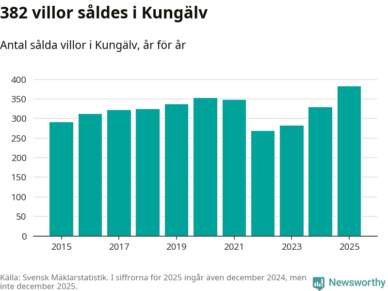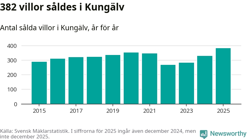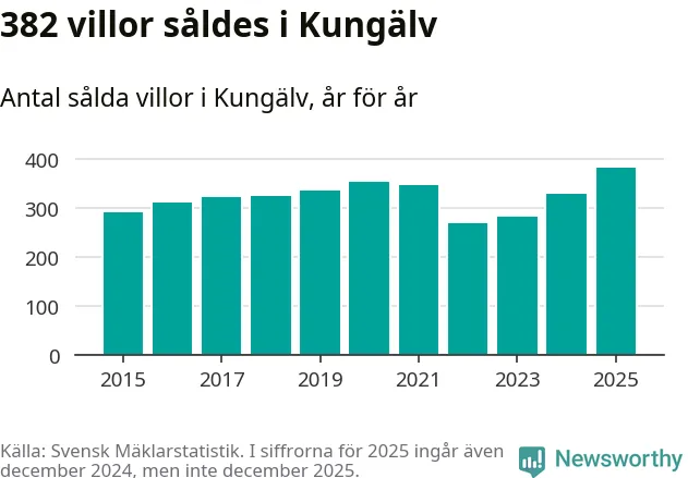 Antalet sålda villor ökade också. Totalt såldes 382 villor, att jämföra med 329 under 2024. Det är fler än något annat år sedan 2015.