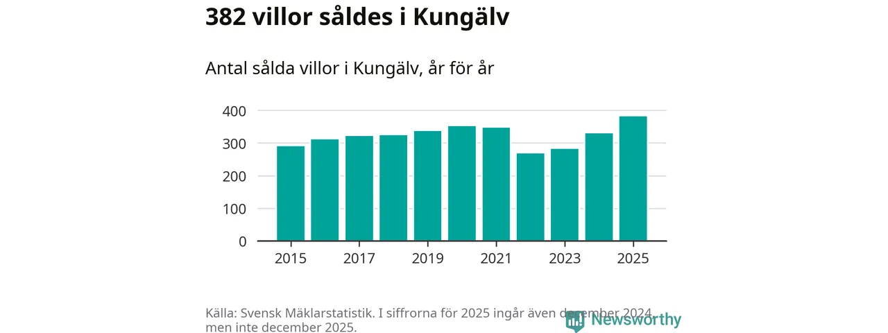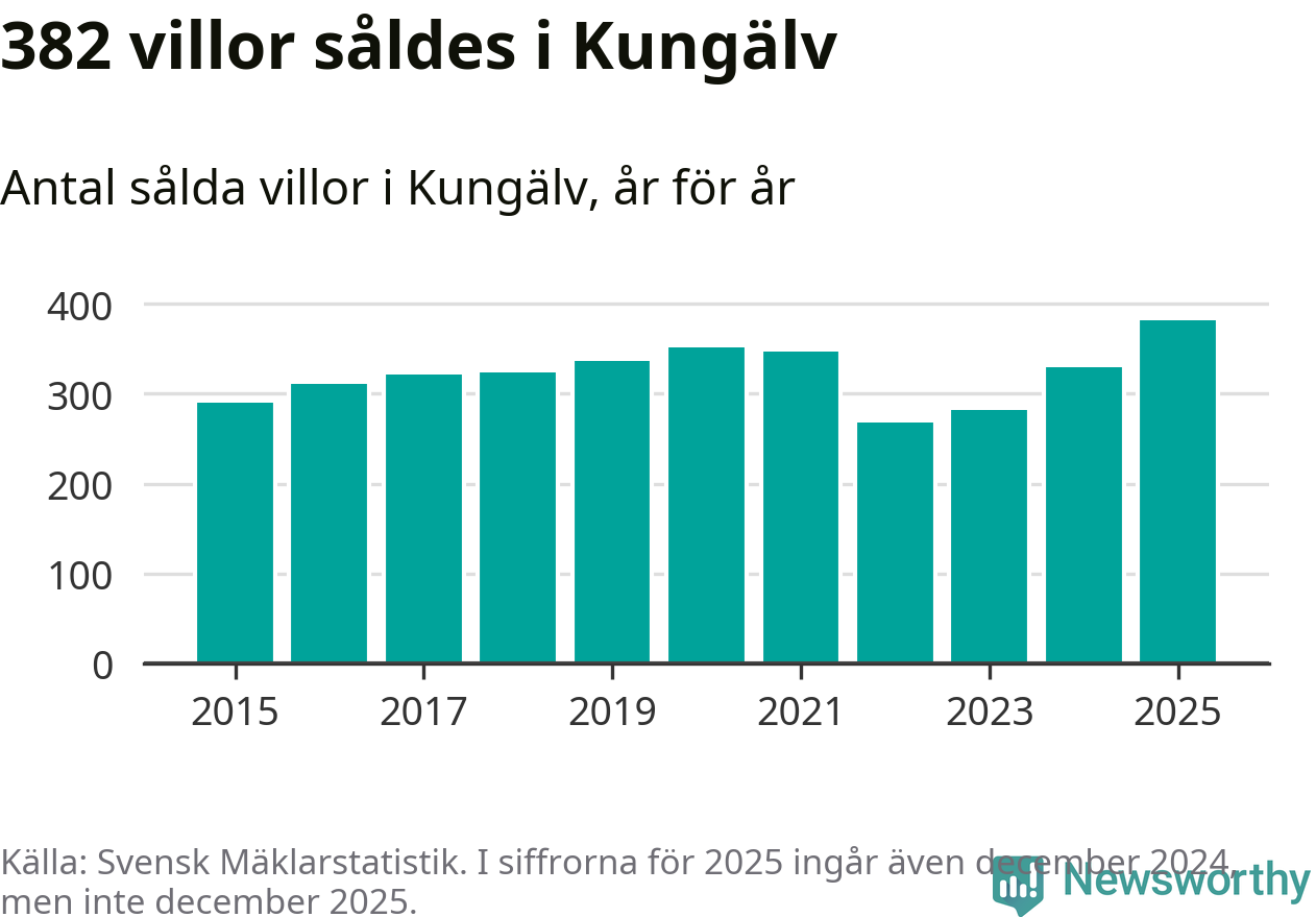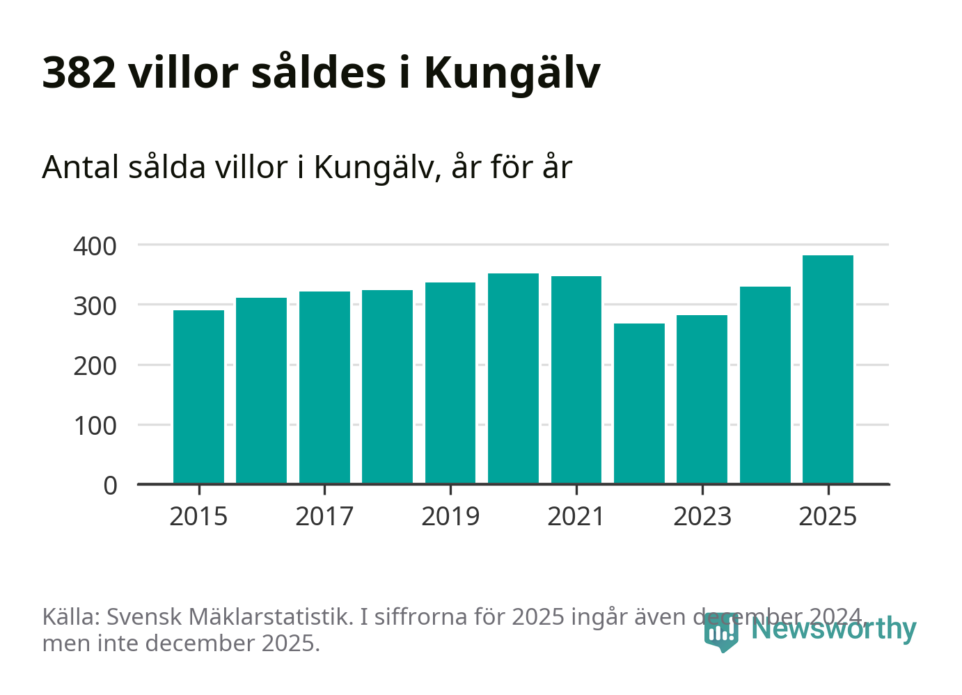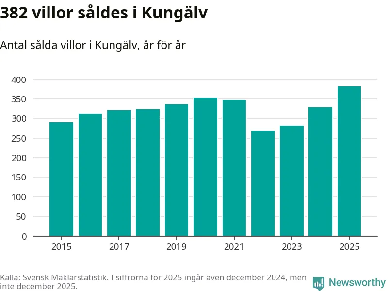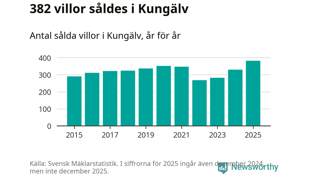 Antalet sålda villor ökade också. Totalt såldes 382 villor, att jämföra med 329 under 2024. Det är fler än något annat år sedan 2015.