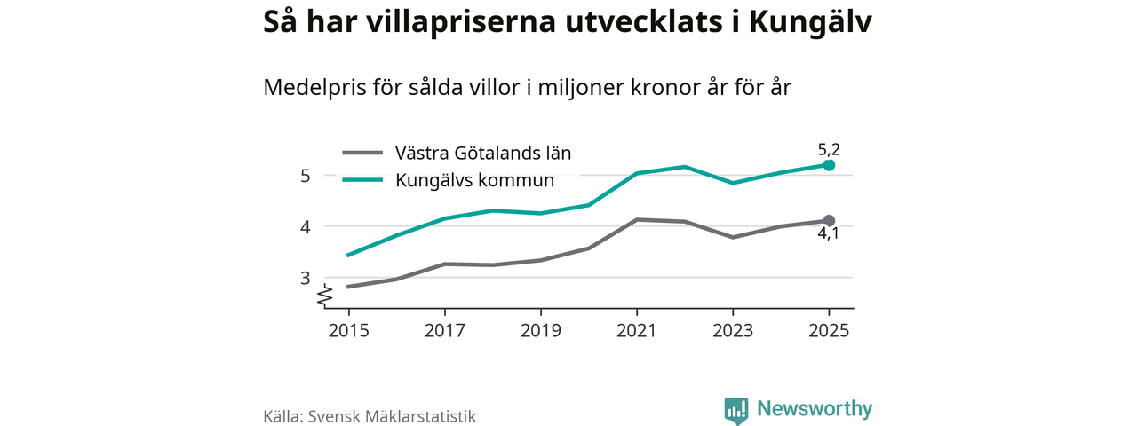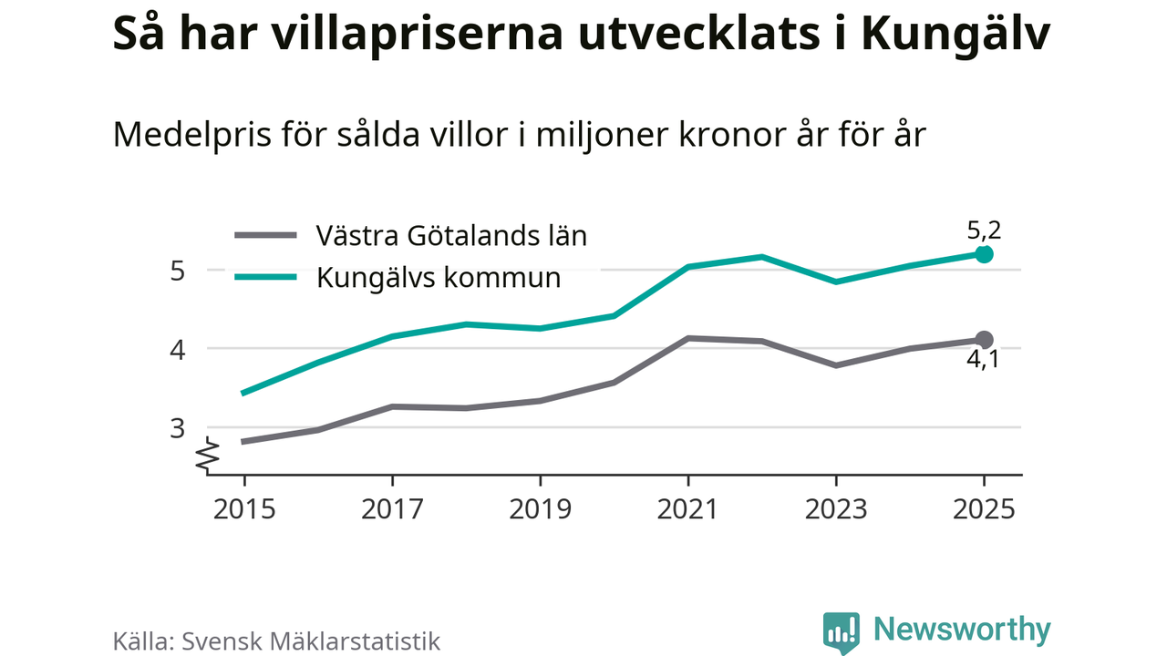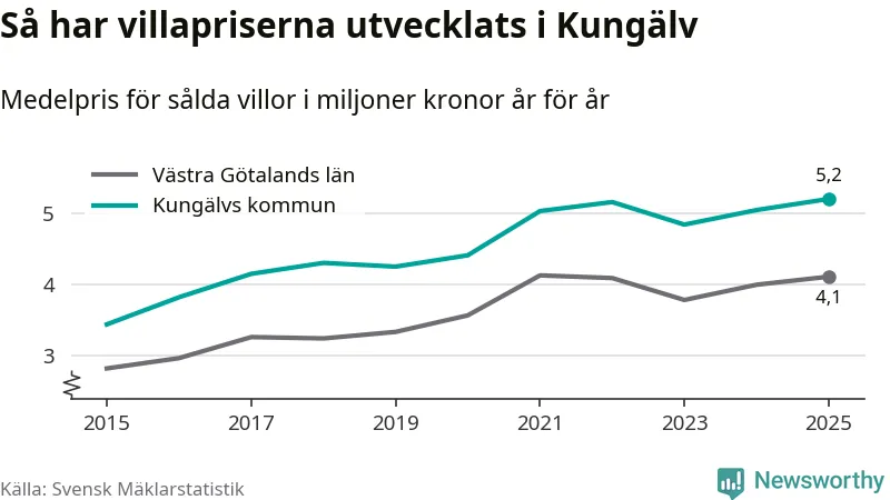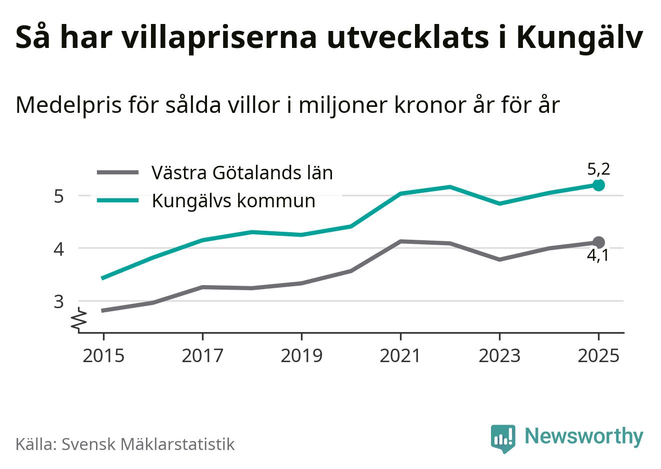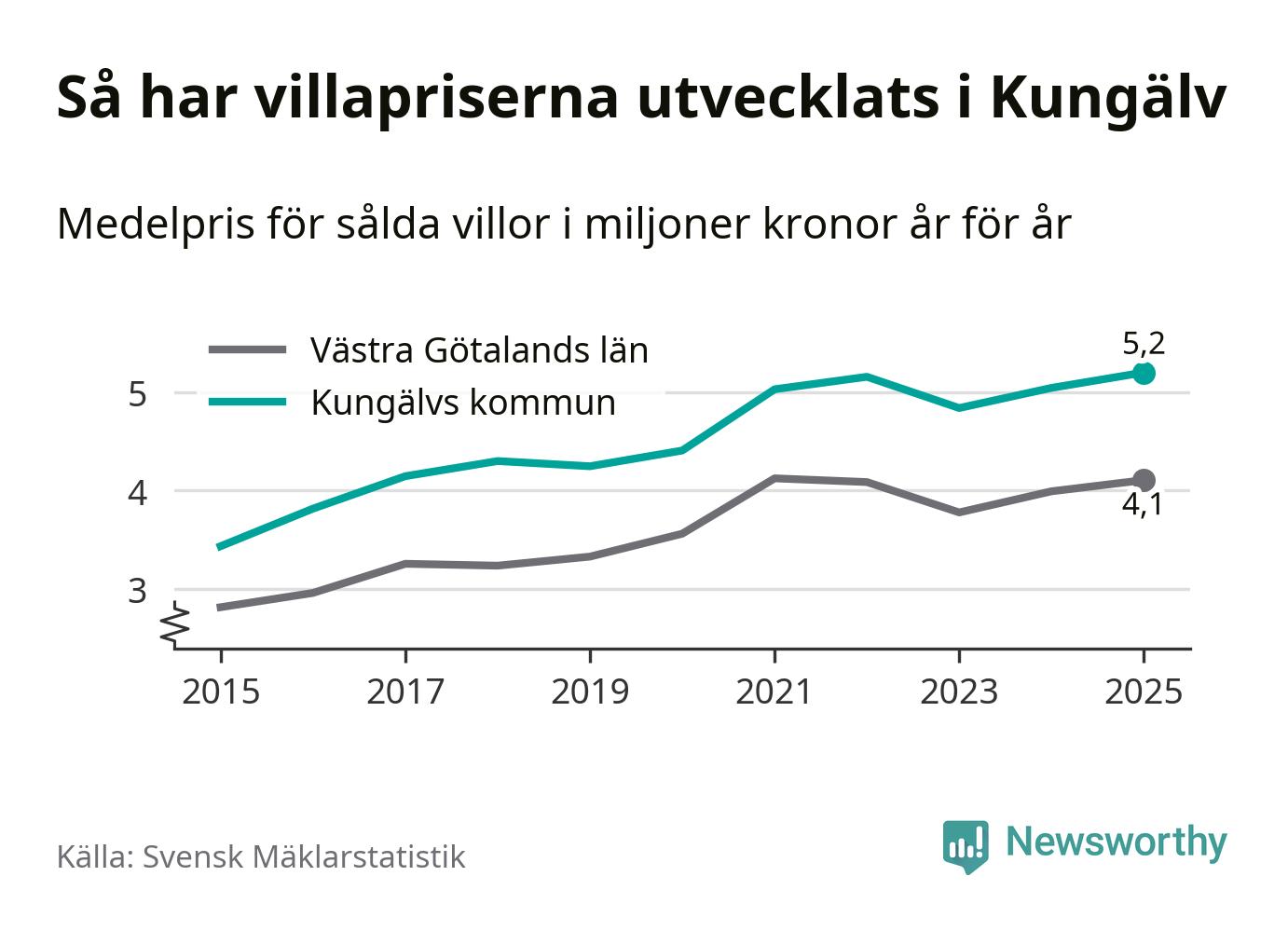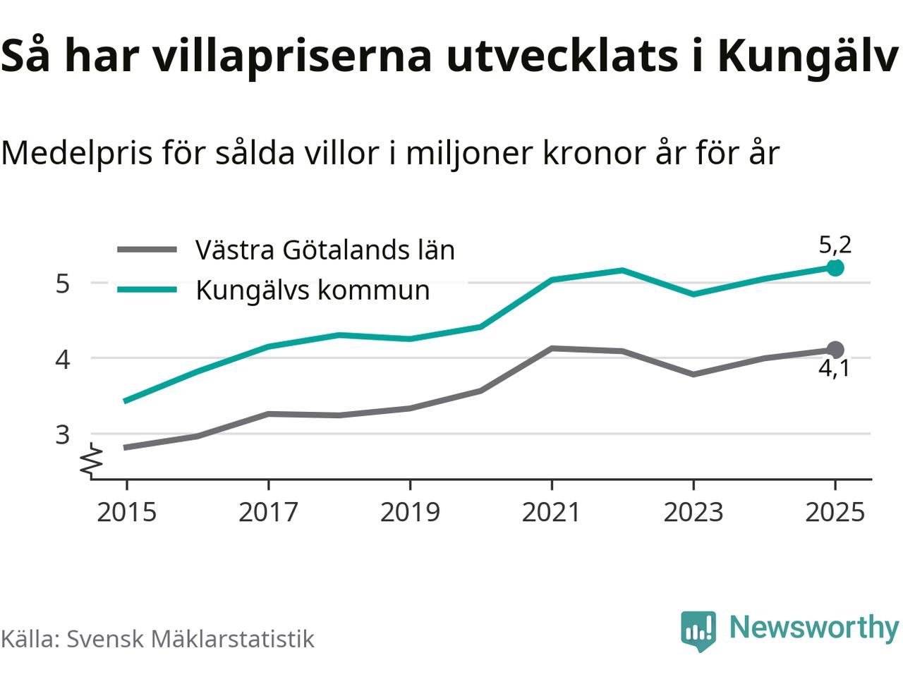 5,2 miljoner kronor är medelpriset för de villor som såldes i Kungälvs kommun under året, eller 43 590 kronor per kvadratmeter. Det innebär en prisökning med tre procent på ett år. Det är det högsta årssnittet på åtminstone tio år. Bryter man upp siffrorna per kvartal har dock ännu högre villapriser noterats i Kungälv vintern 2021/22.