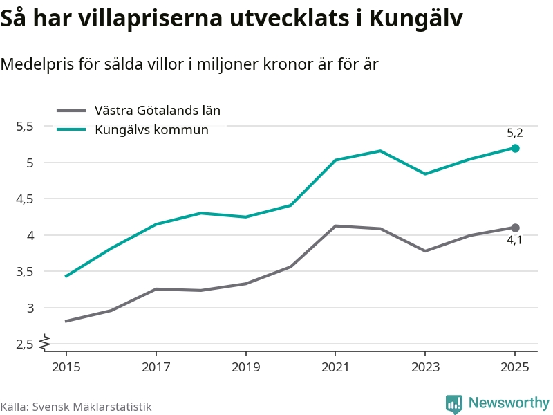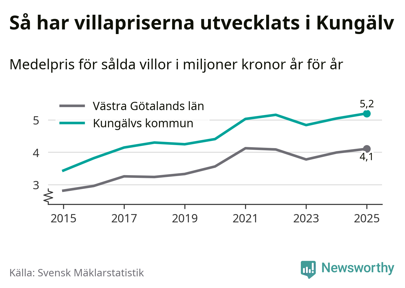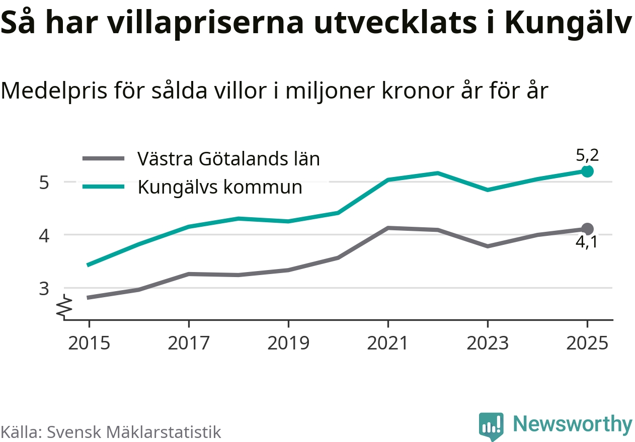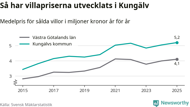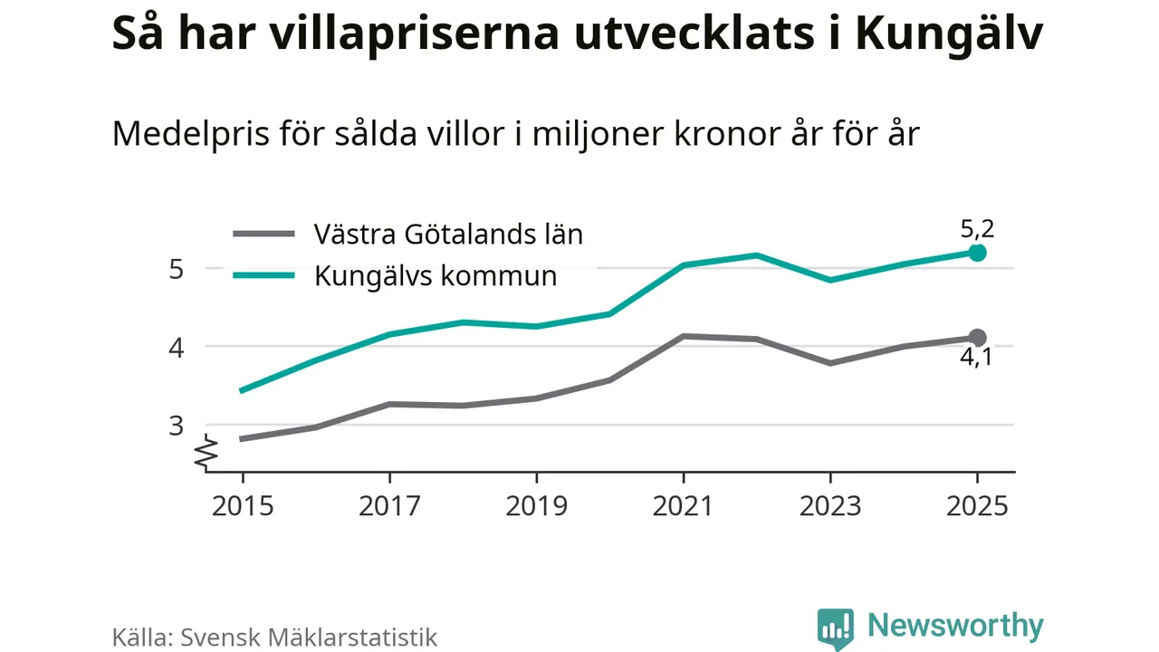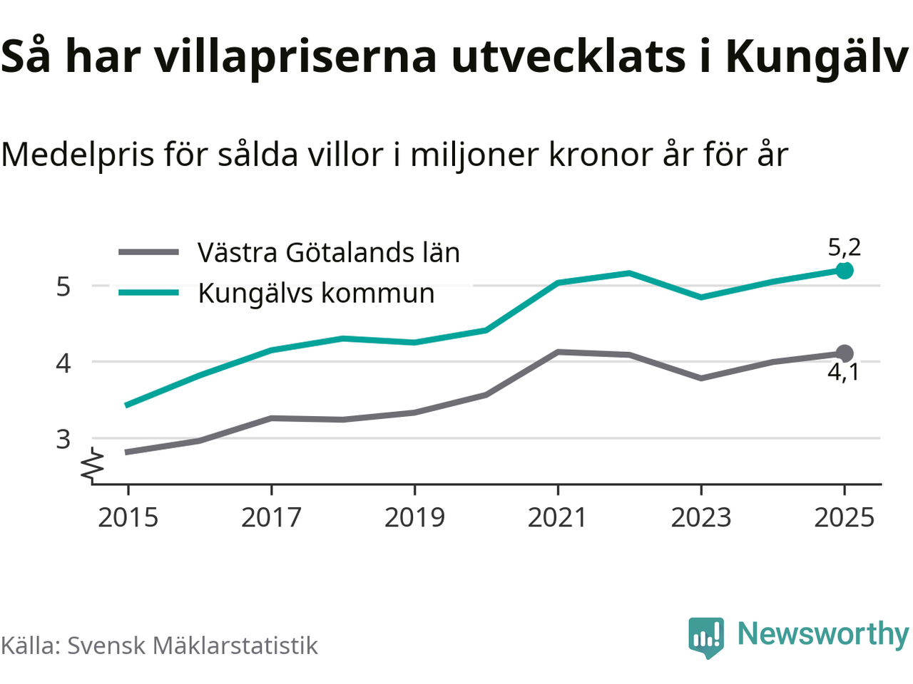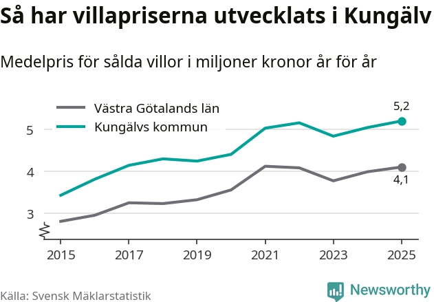 5,2 miljoner kronor är medelpriset för de villor som såldes i Kungälvs kommun under året, eller 43 590 kronor per kvadratmeter. Det innebär en prisökning med tre procent på ett år. Det är det högsta årssnittet på åtminstone tio år. Bryter man upp siffrorna per kvartal har dock ännu högre villapriser noterats i Kungälv vintern 2021/22.