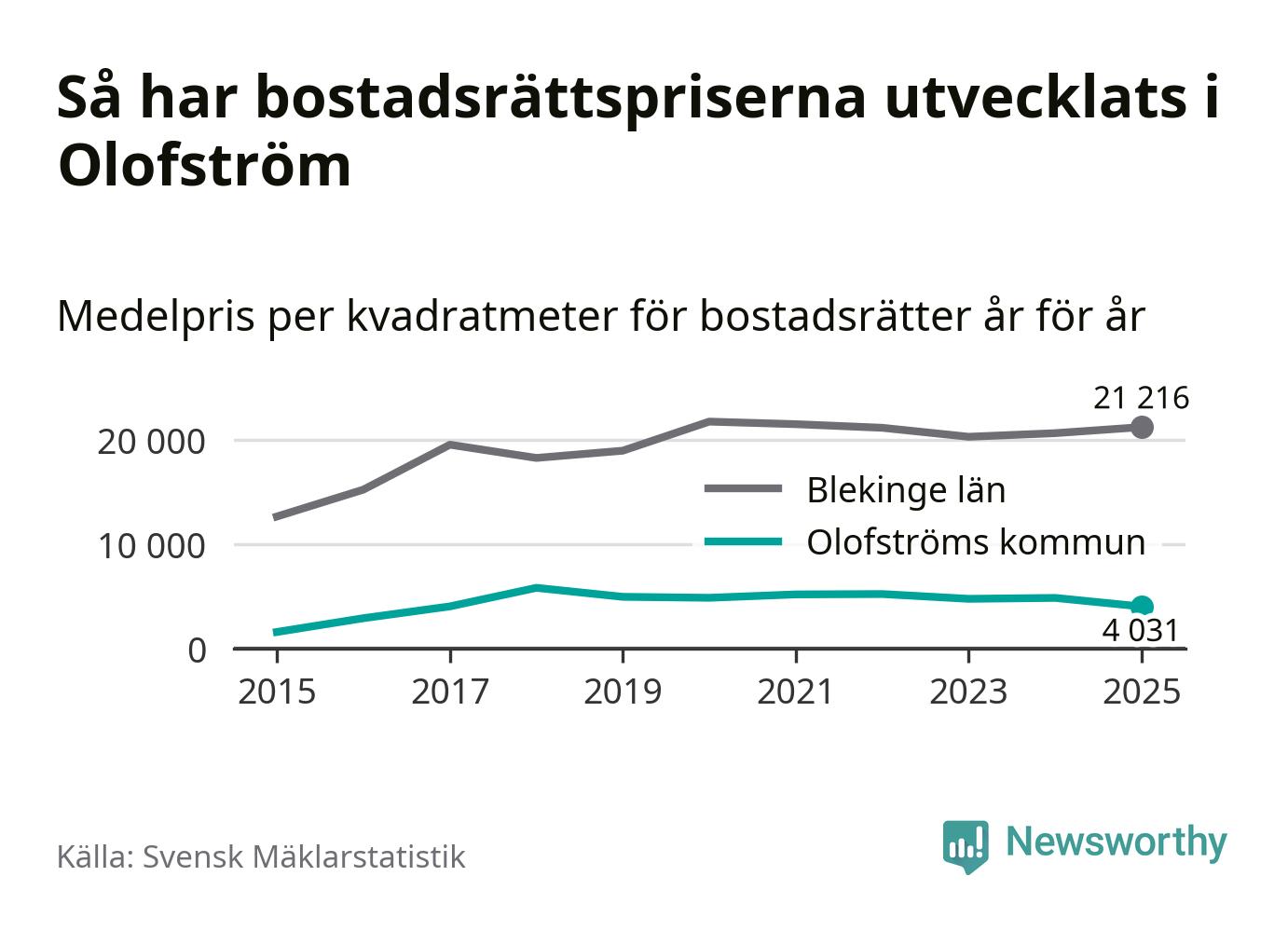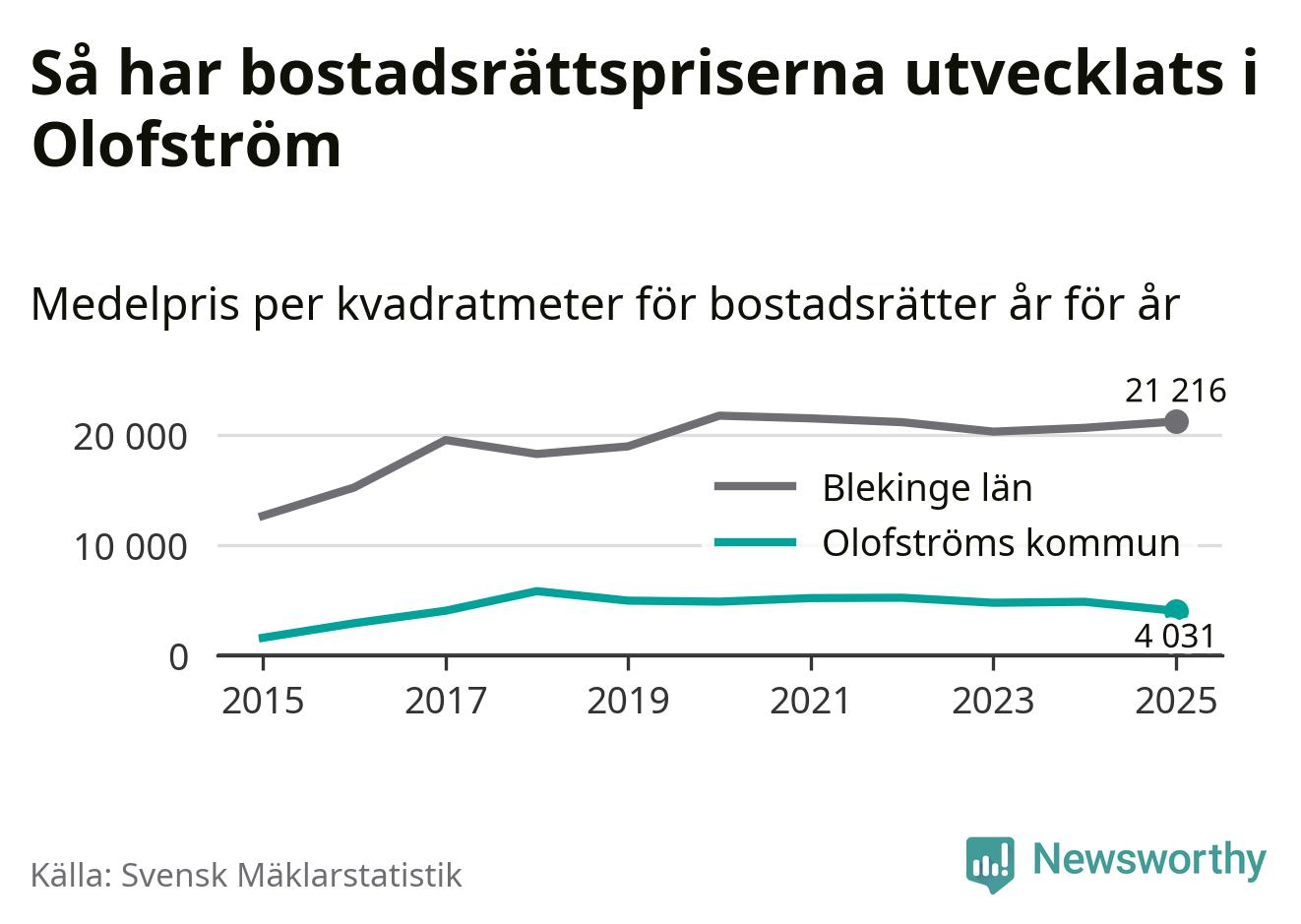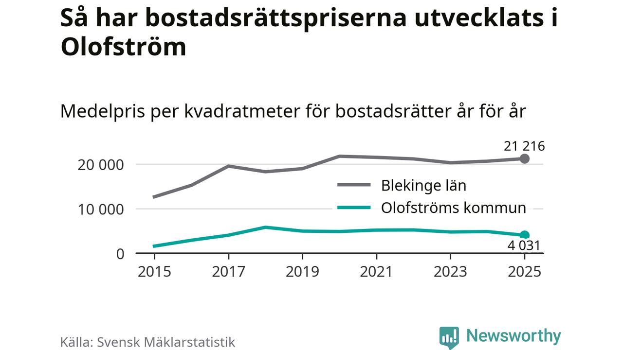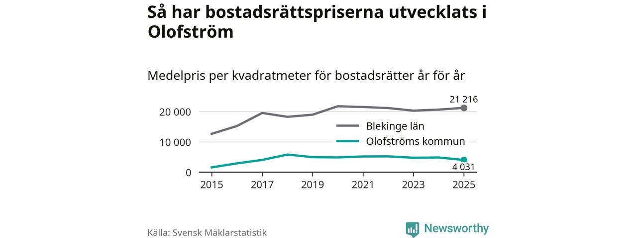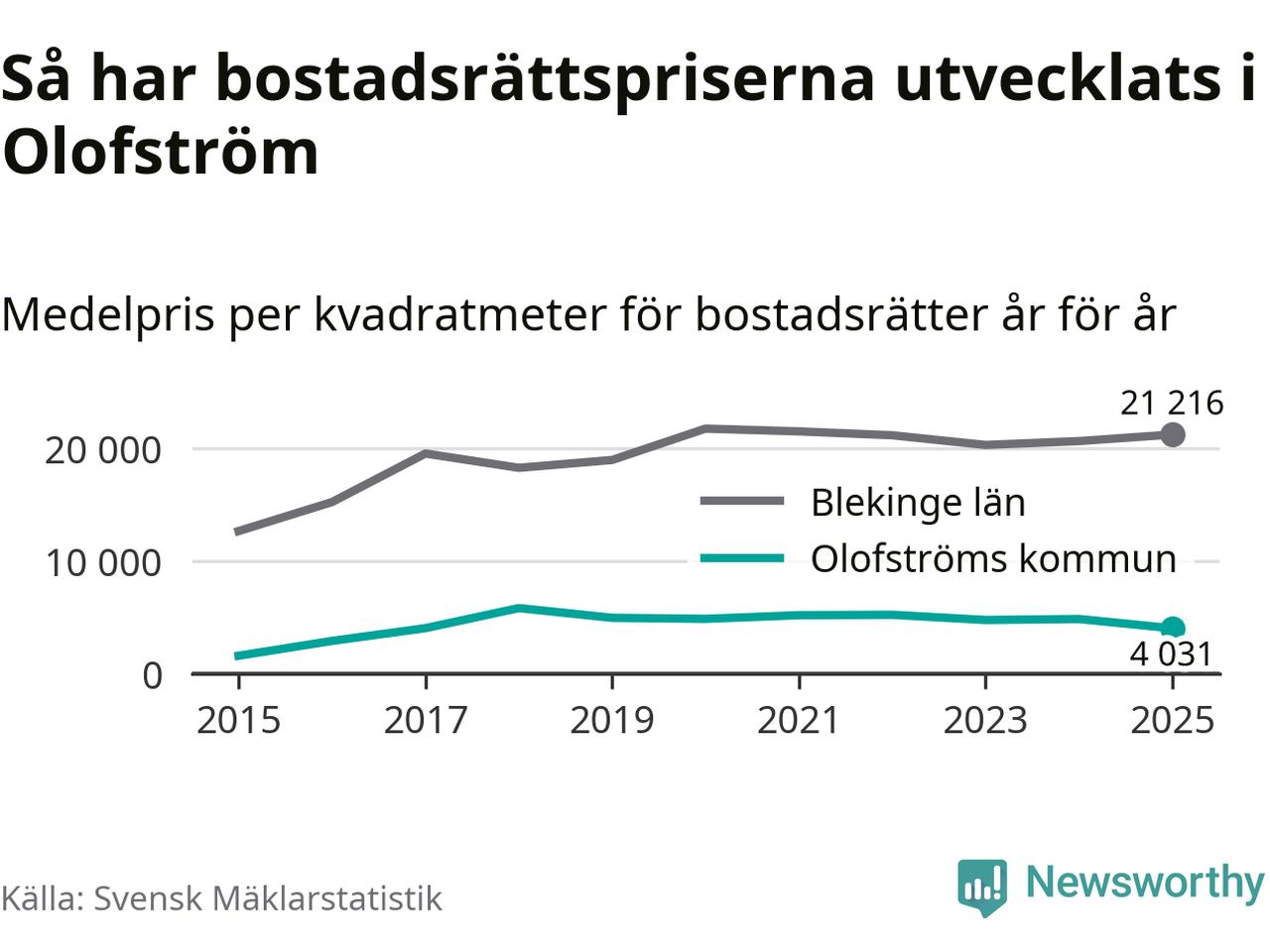 Det såldes totalt 33 bostadsrätter i Olofströms kommun under året. Genomsnittspriset per kvadratmeter landade på 4 031 kronor. Det är en minskning med 17 procent i kommunen på ett år.