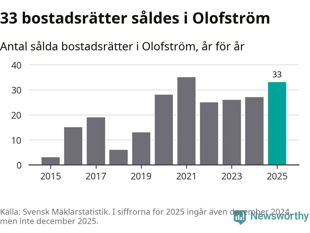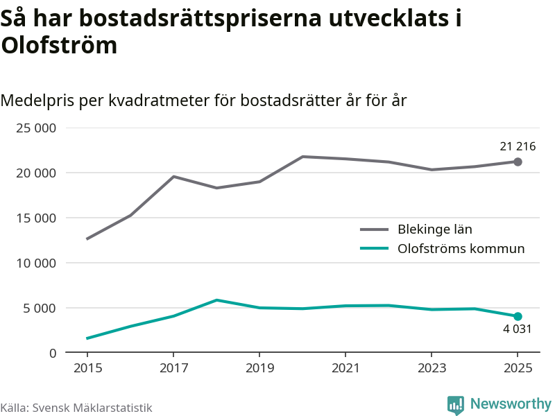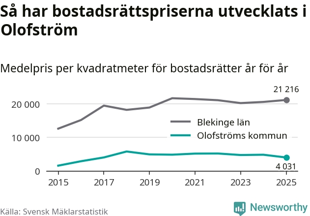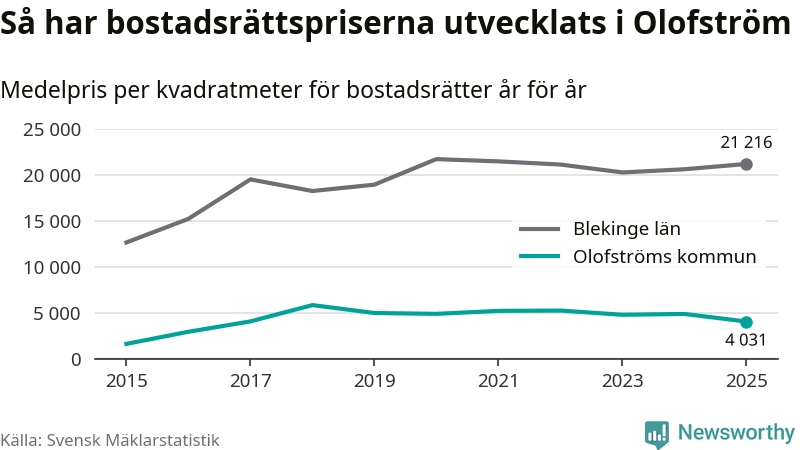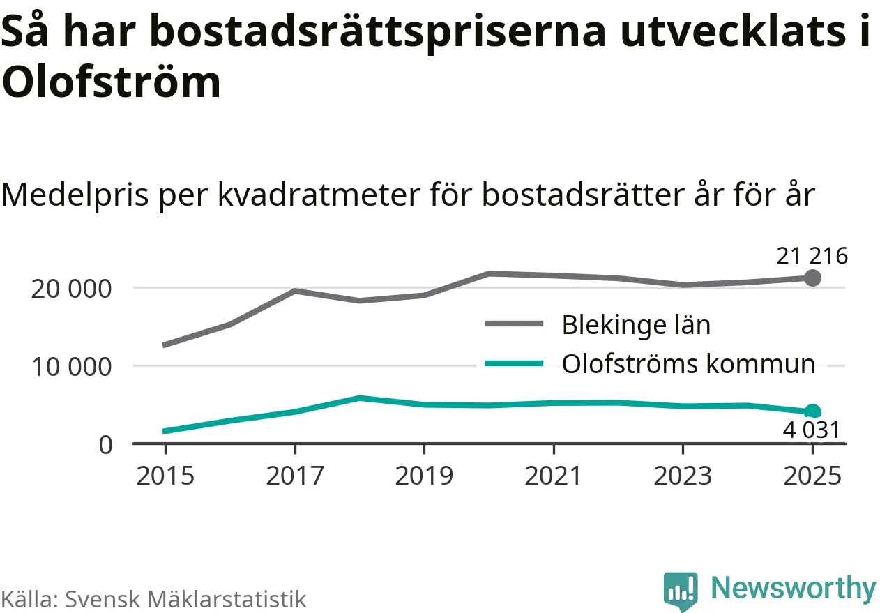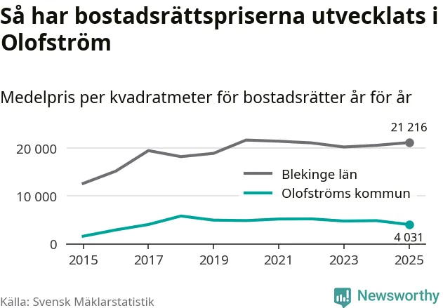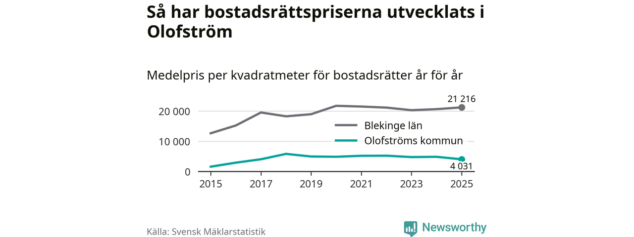 Det såldes totalt 33 bostadsrätter i Olofströms kommun under året. Genomsnittspriset per kvadratmeter landade på 4 031 kronor. Det är en minskning med 17 procent i kommunen på ett år.