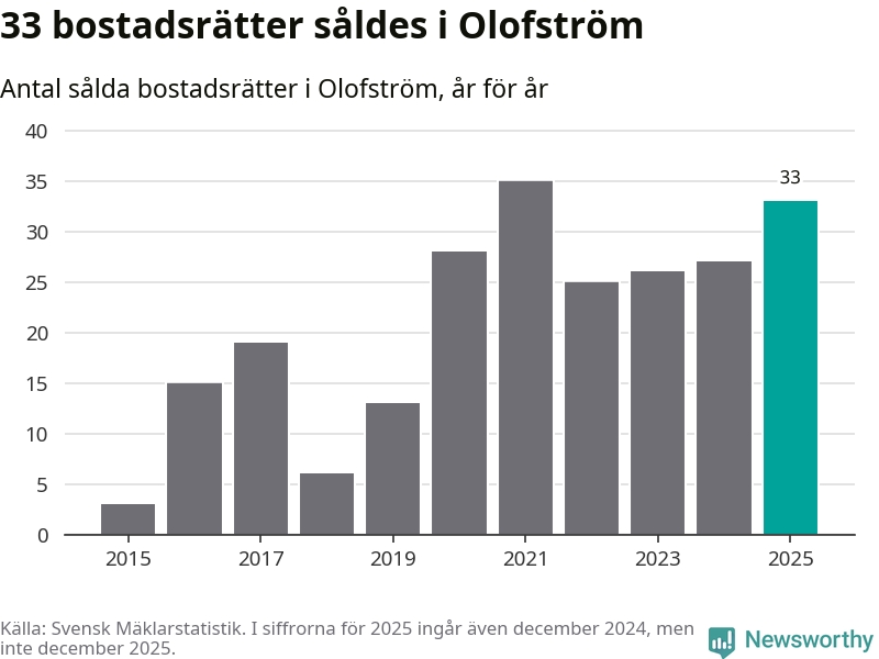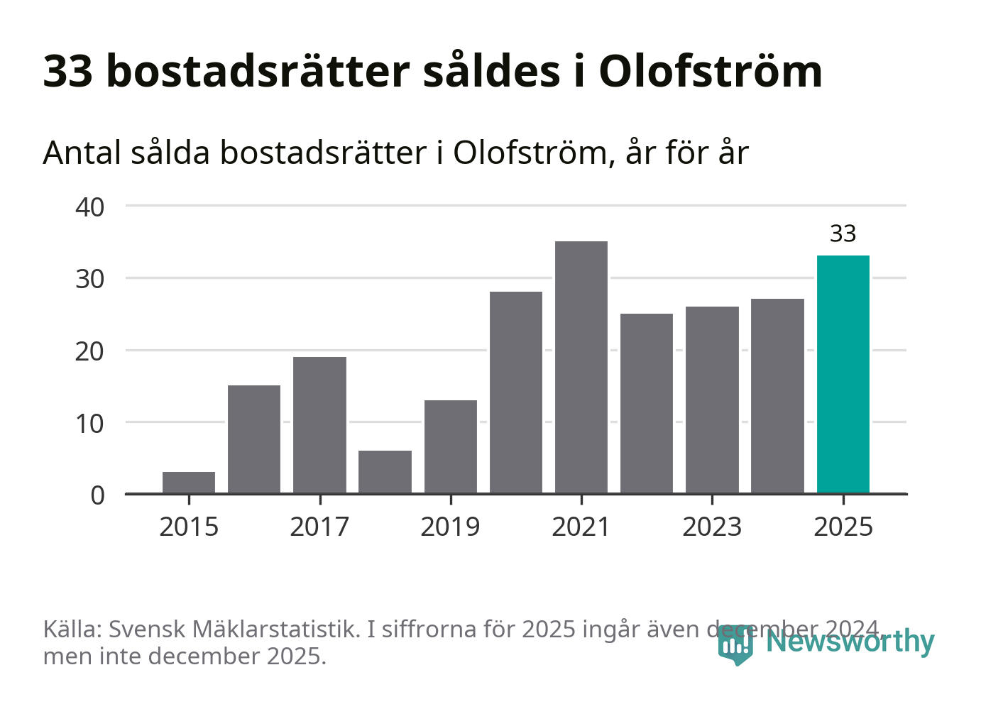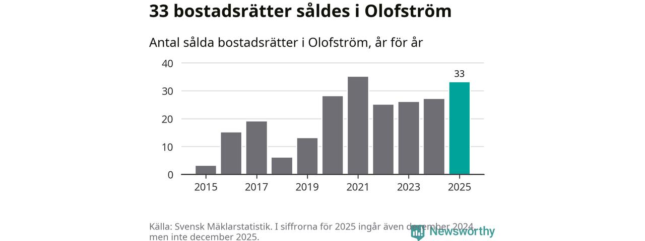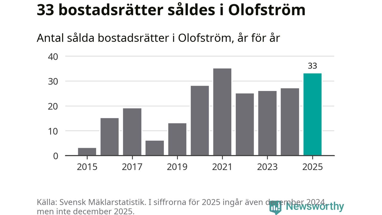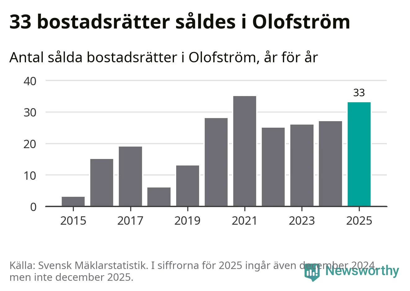 Det såldes totalt 33 bostadsrätter i Olofströms kommun under året. Genomsnittspriset per kvadratmeter landade på 4 031 kronor. Det är en minskning med 17 procent i kommunen på ett år.