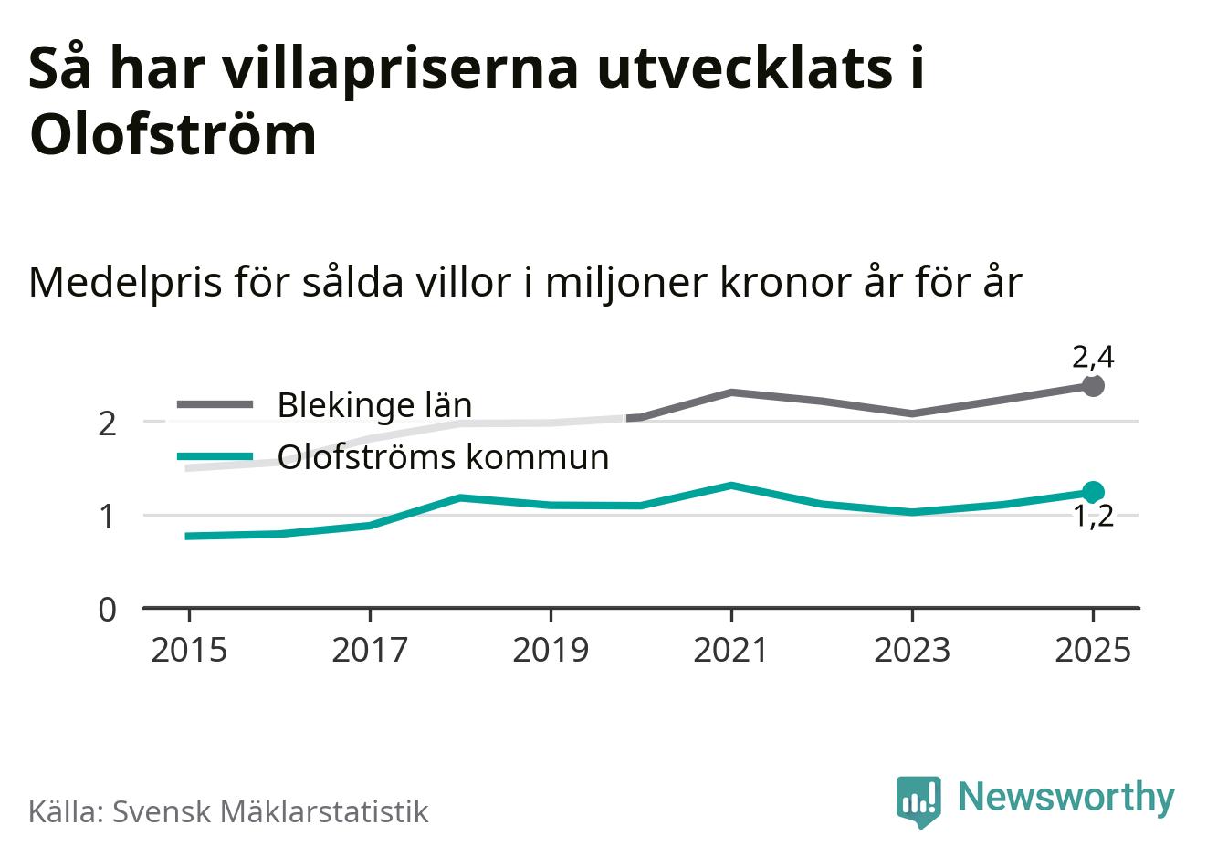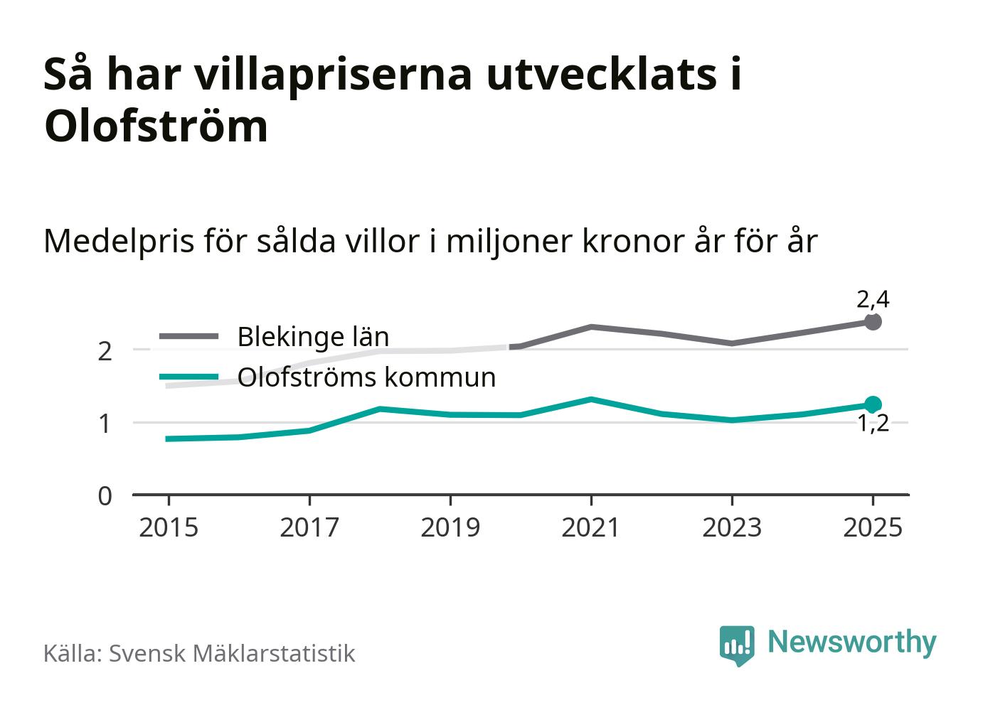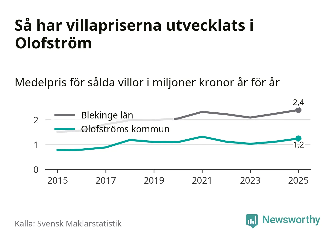 1,2 miljoner kronor är medelpriset för de villor som såldes i Olofströms kommun under året, eller 10 089 kronor per kvadratmeter. Det innebär en prisökning med tolv procent på ett år och är andra året i rad som priserna ökar i kommunen.