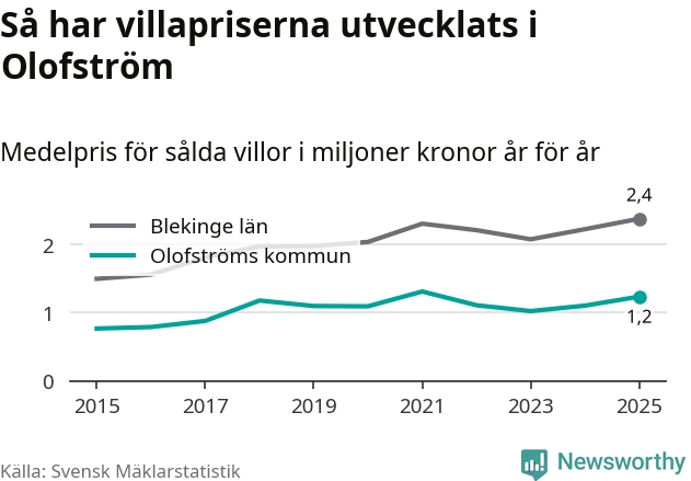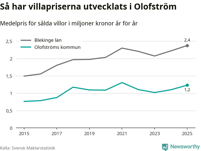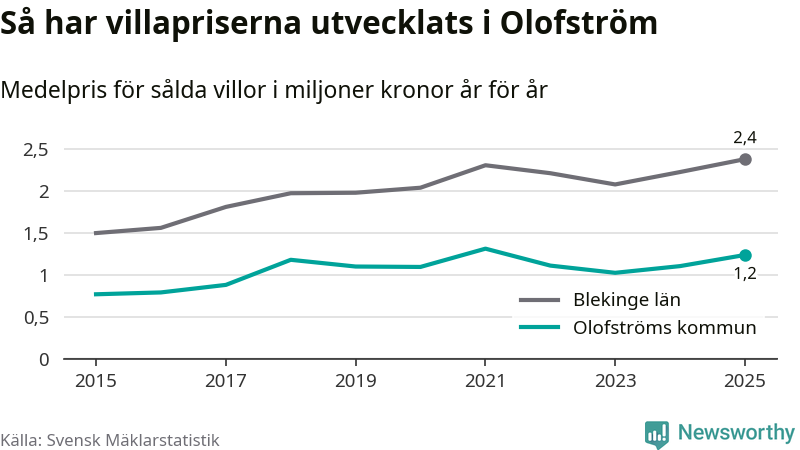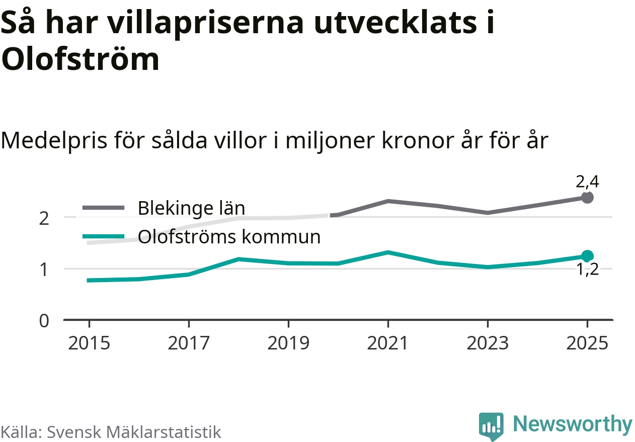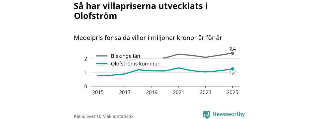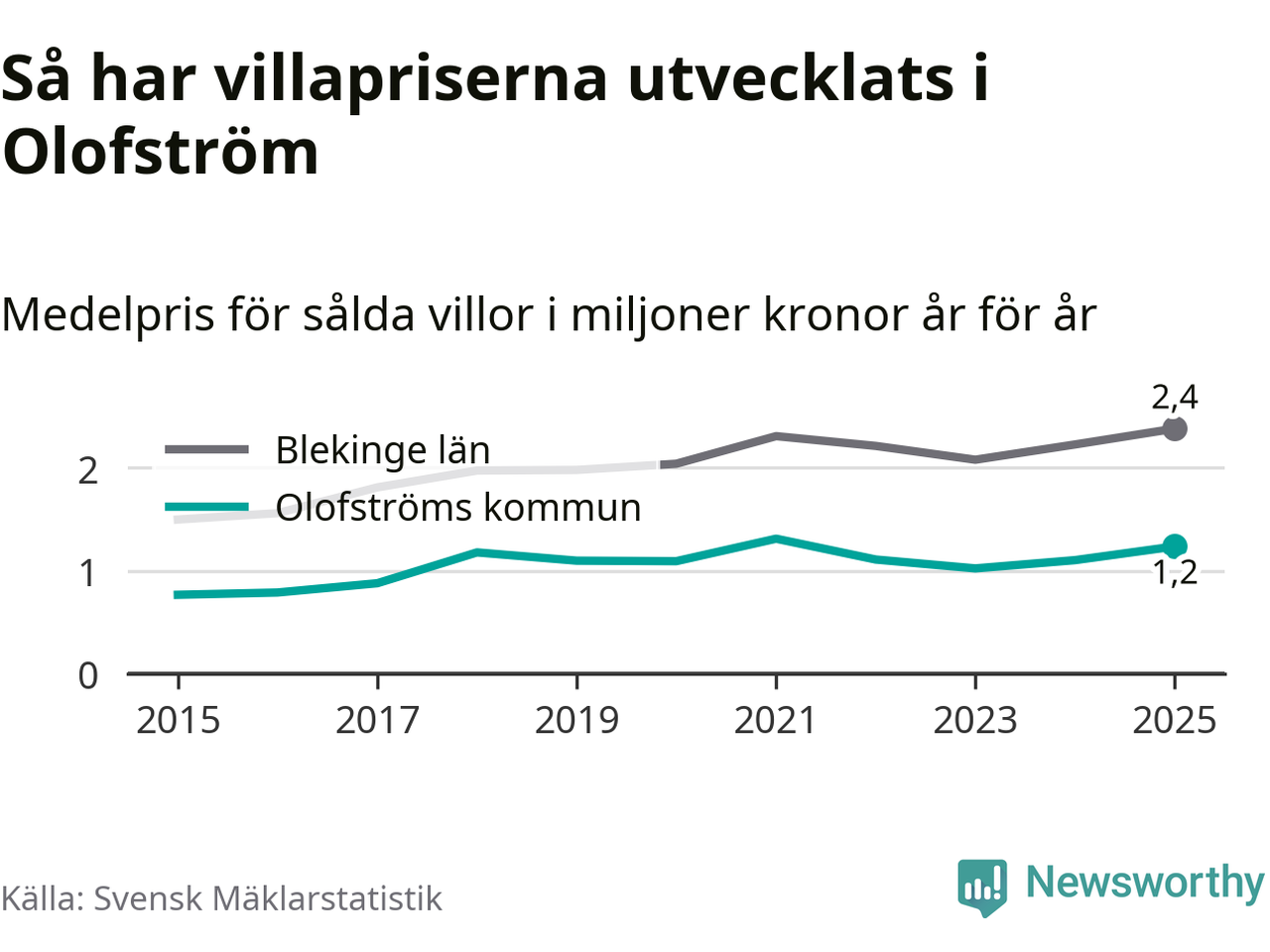 1,2 miljoner kronor är medelpriset för de villor som såldes i Olofströms kommun under året, eller 10 089 kronor per kvadratmeter. Det innebär en prisökning med tolv procent på ett år och är andra året i rad som priserna ökar i kommunen.