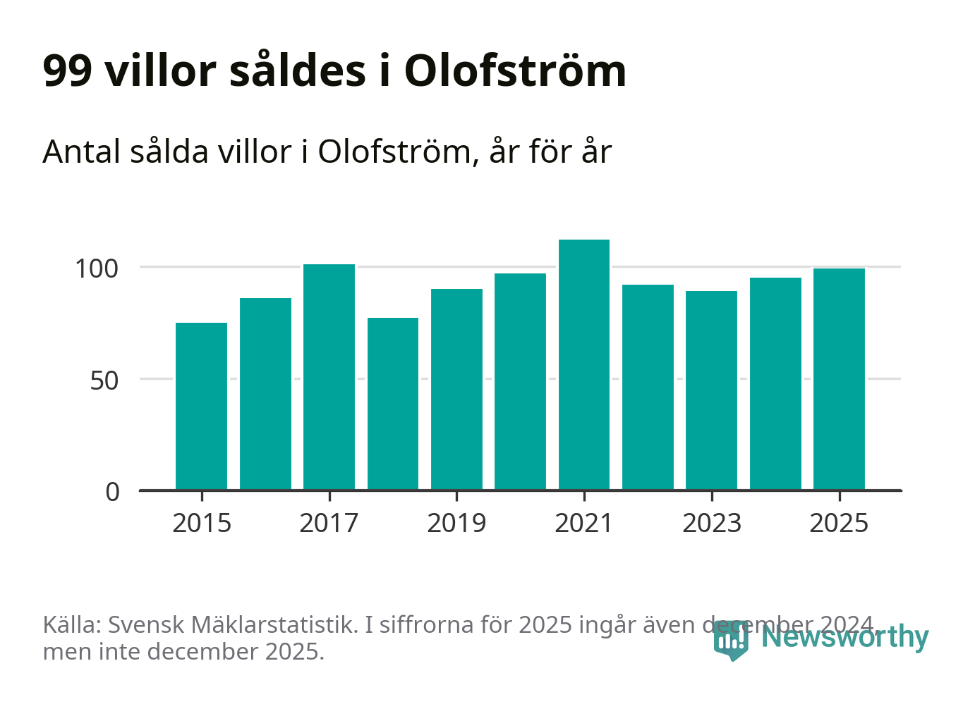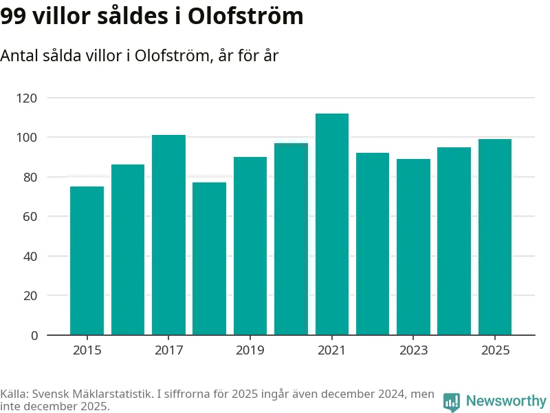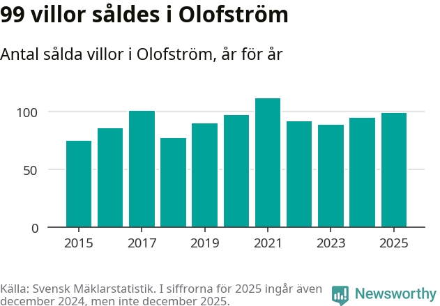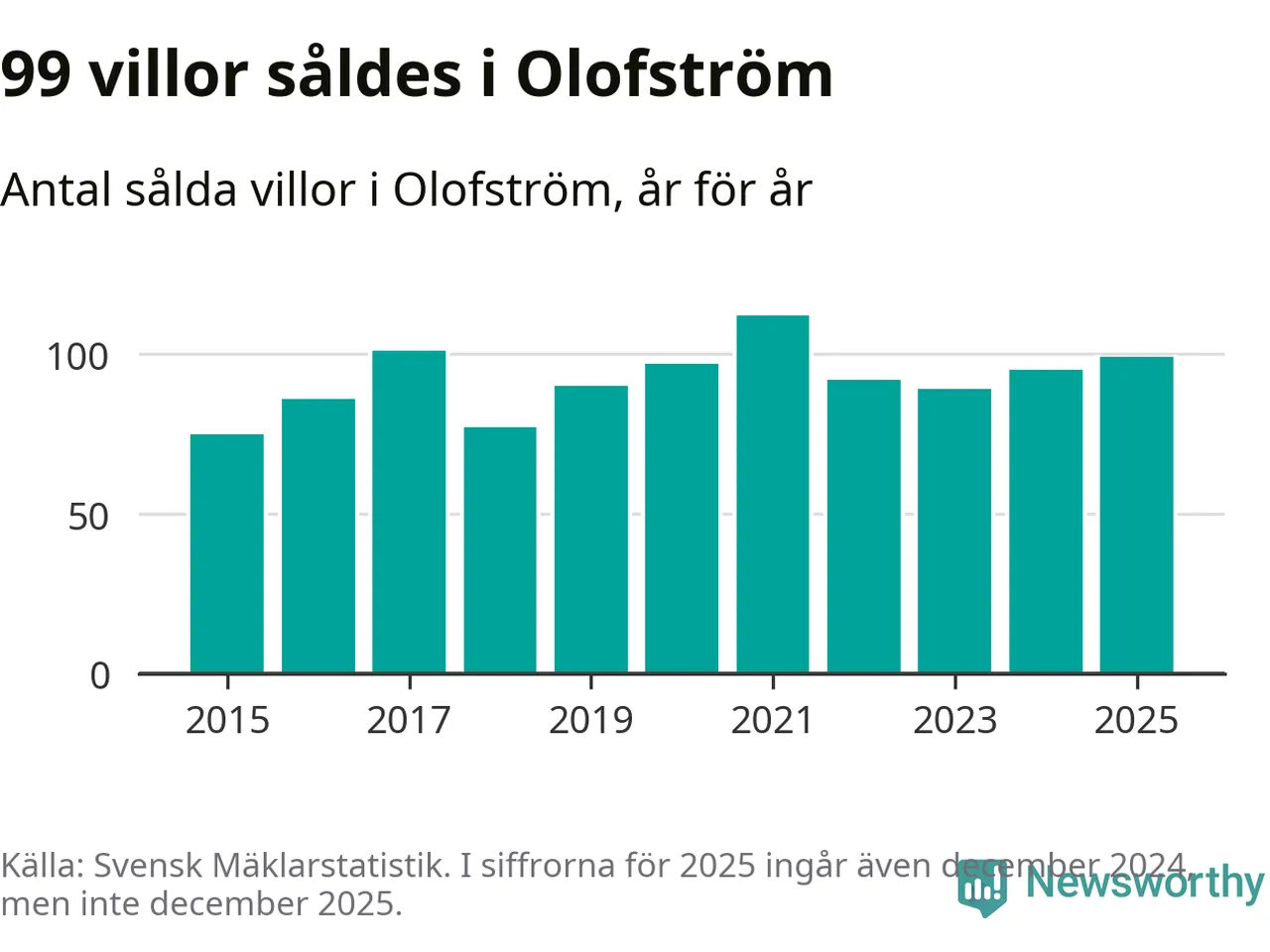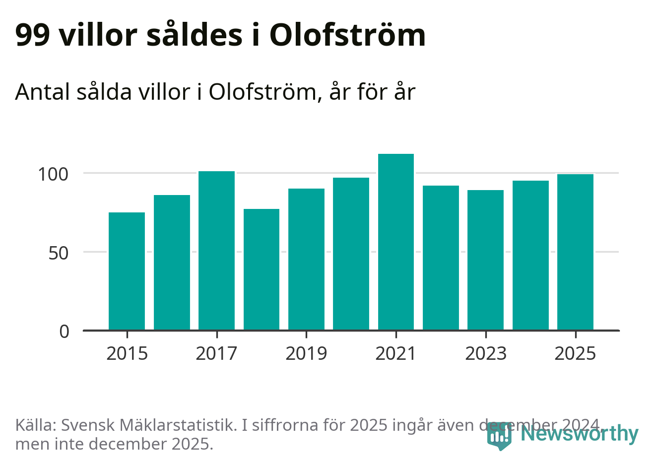 Antalet sålda villor ökade också något. Totalt såldes 99 villor, att jämföra med 95 under 2024. Det är andra året i rad som antalet sålda villor ökar i kommunen.