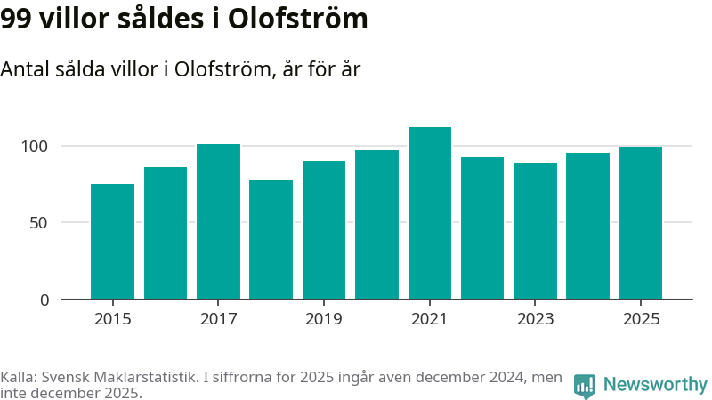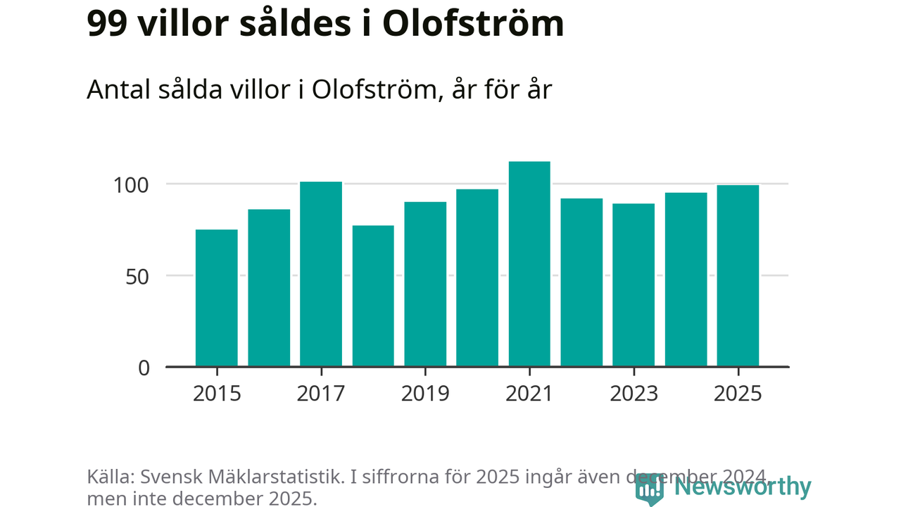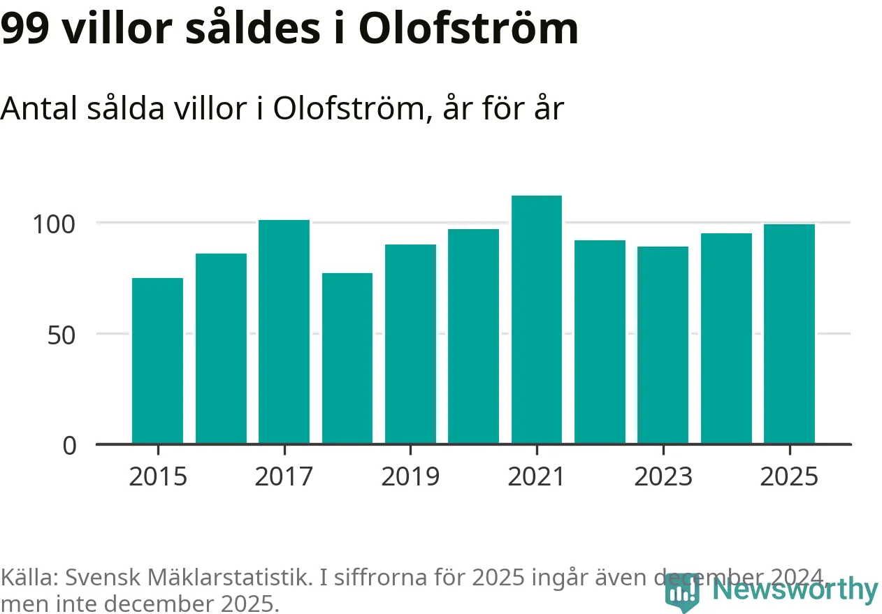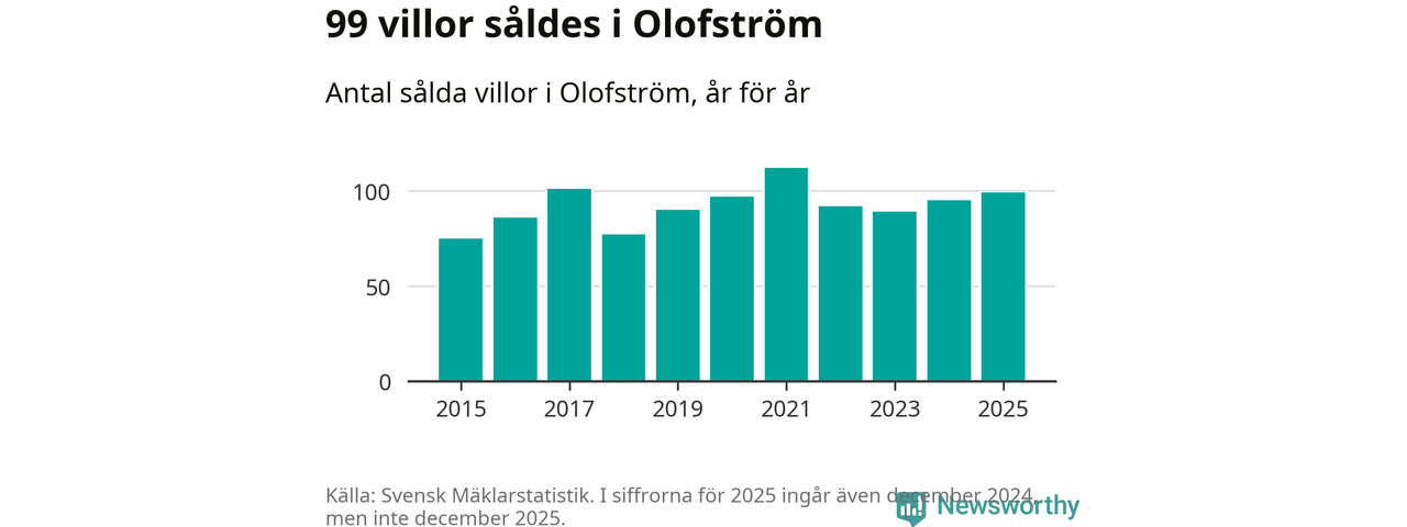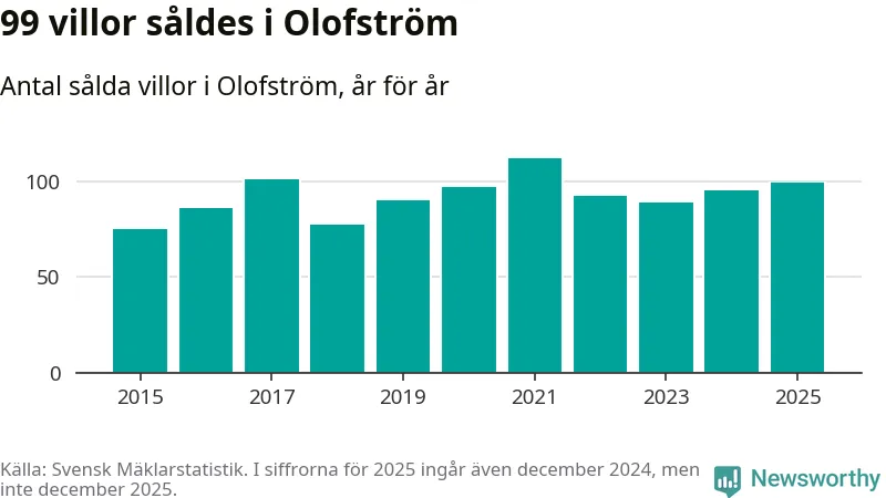 Antalet sålda villor ökade också något. Totalt såldes 99 villor, att jämföra med 95 under 2024. Det är andra året i rad som antalet sålda villor ökar i kommunen.