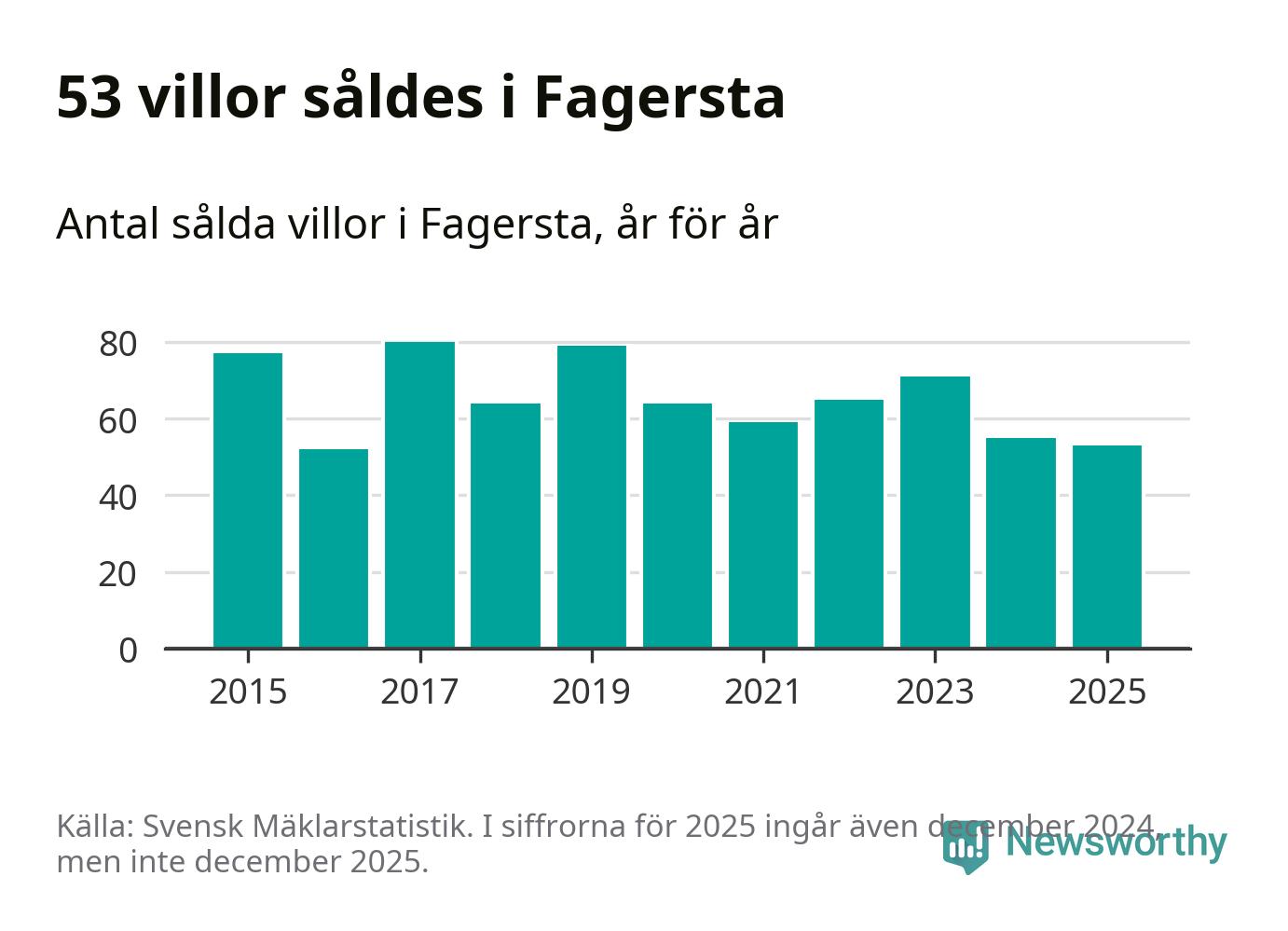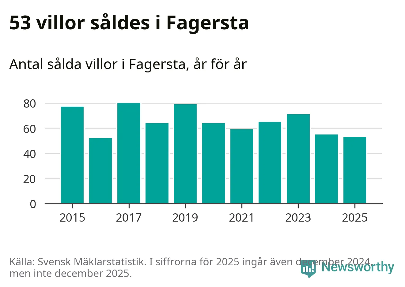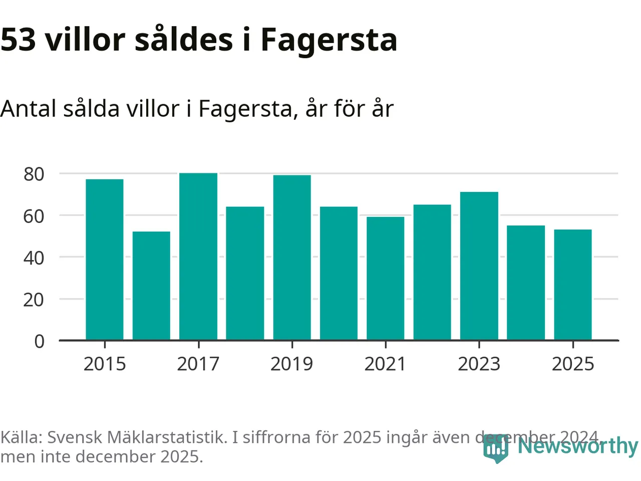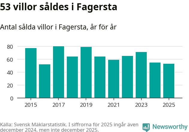 Däremot minskade antalet sålda villor något. Totalt såldes 53 villor, att jämföra med 55 under 2024. Det är andra året i rad som antalet sålda villor minskar i kommunen.