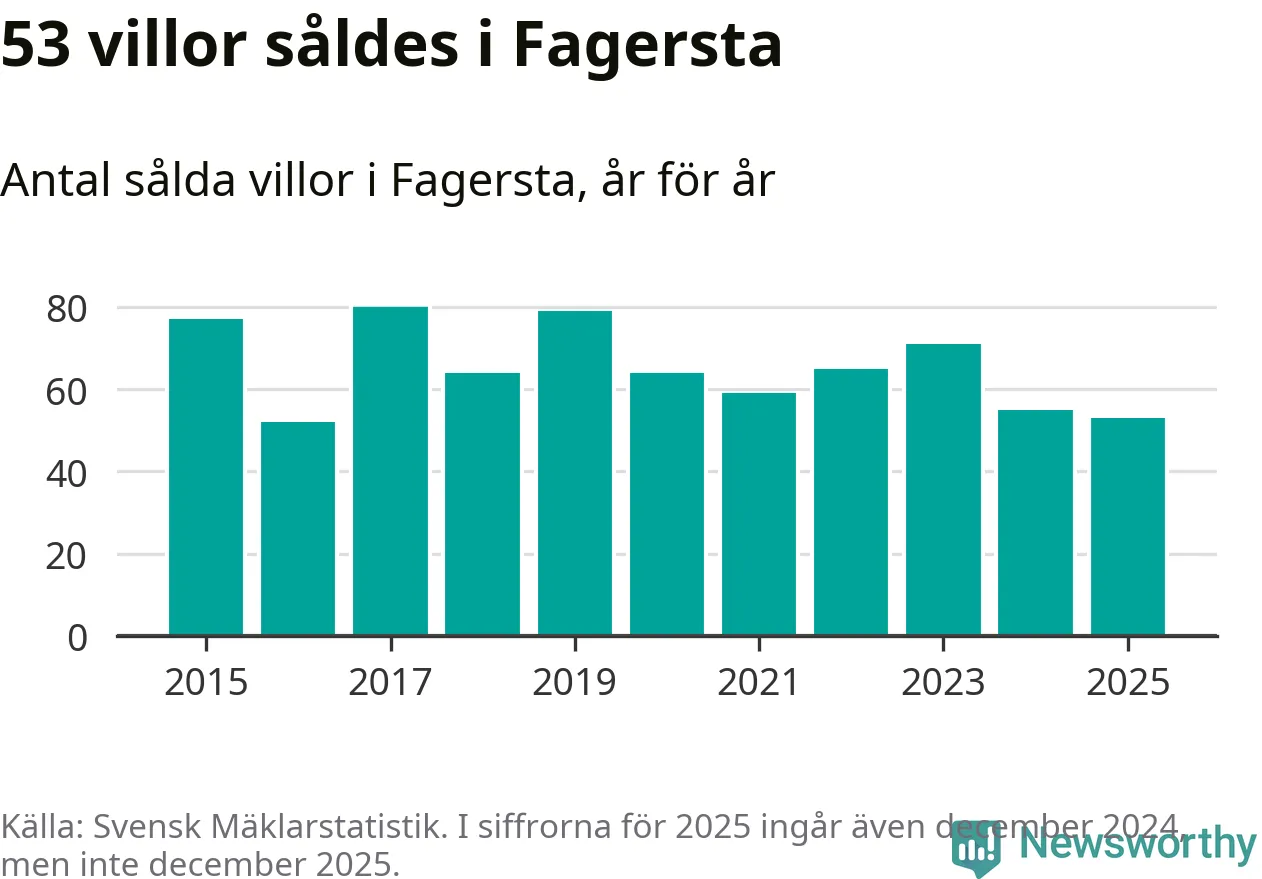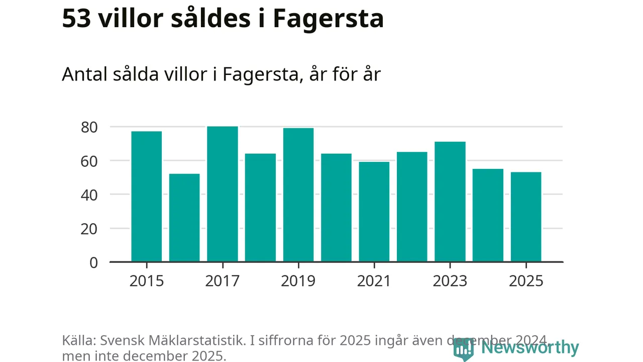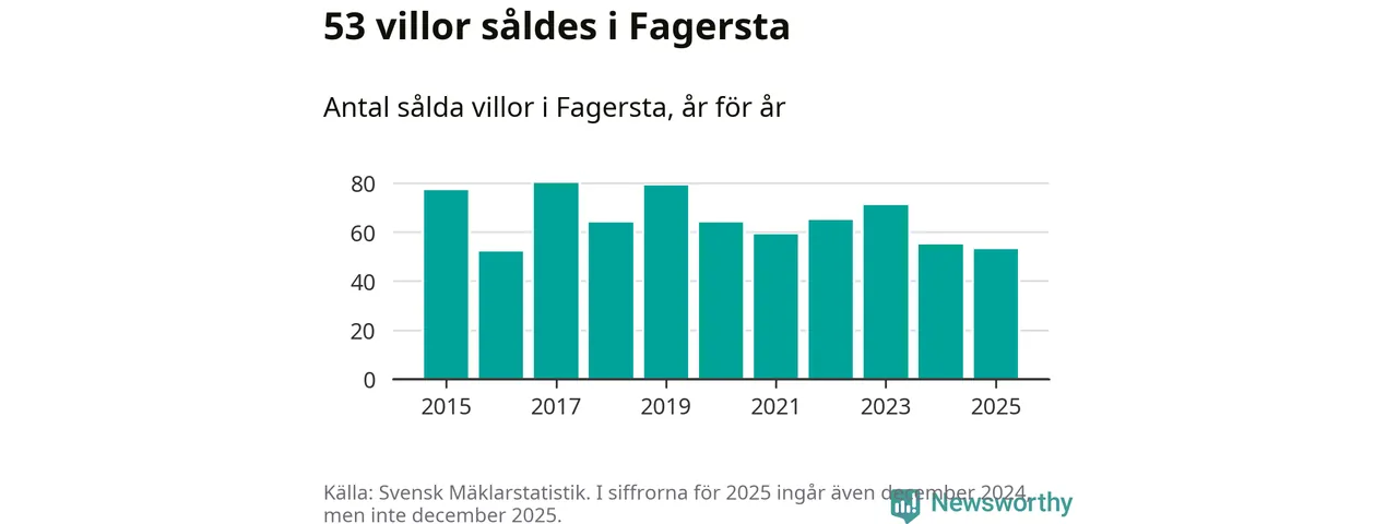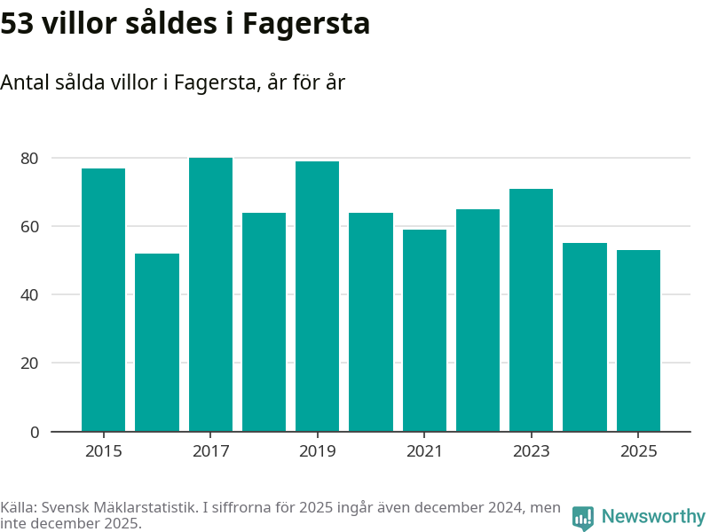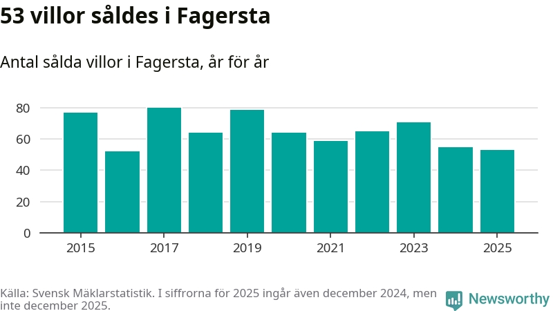 Däremot minskade antalet sålda villor något. Totalt såldes 53 villor, att jämföra med 55 under 2024. Det är andra året i rad som antalet sålda villor minskar i kommunen.