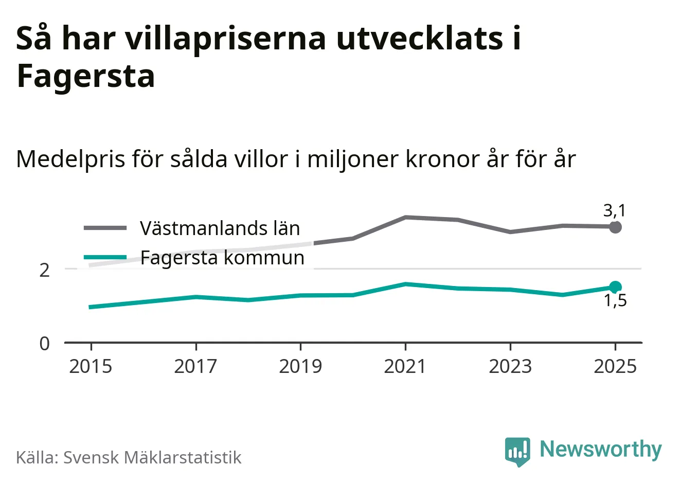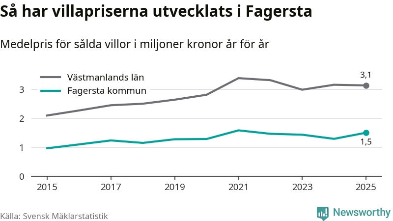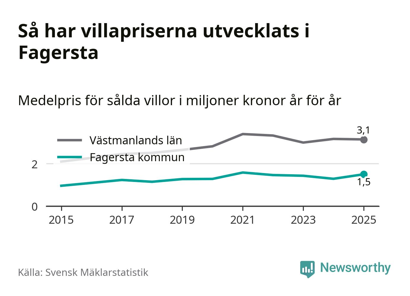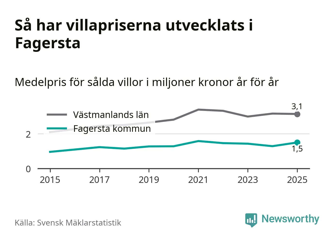1,5 miljoner kronor är medelpriset för de villor som såldes i Fagersta kommun under året, eller 13 295 kronor per kvadratmeter. Det innebär en prisökning med 16 procent på ett år.