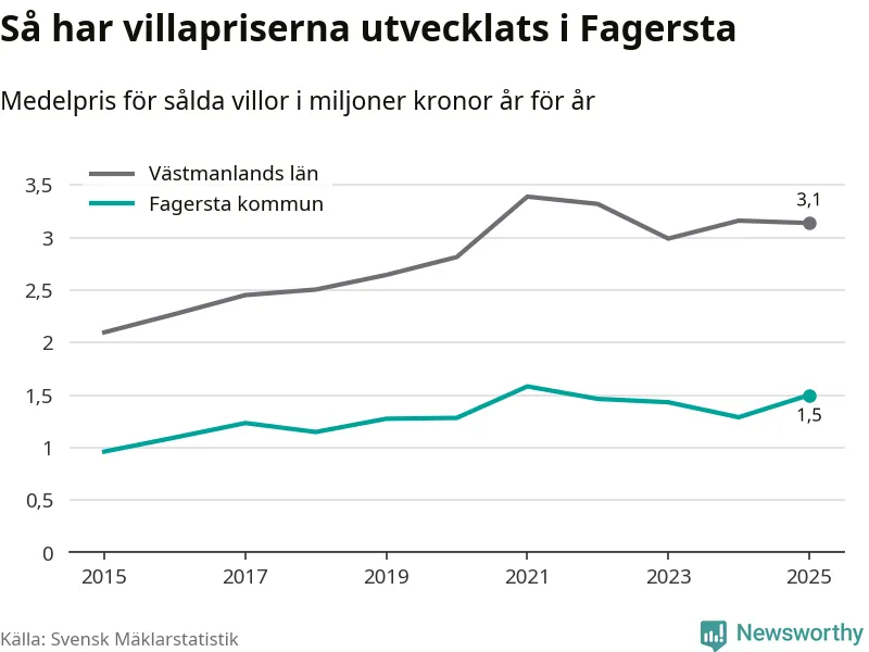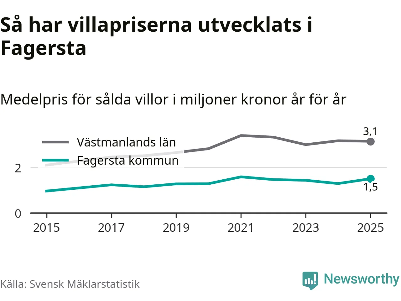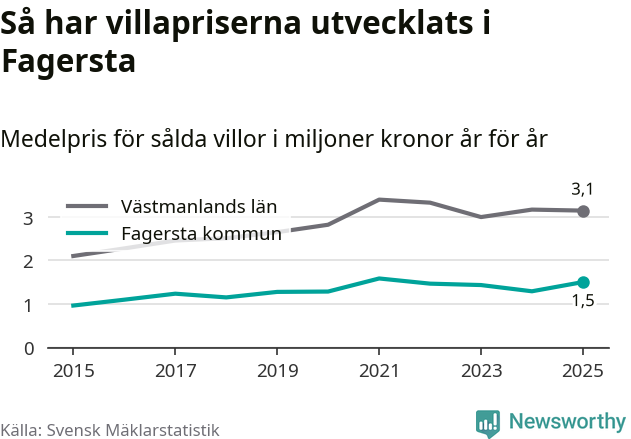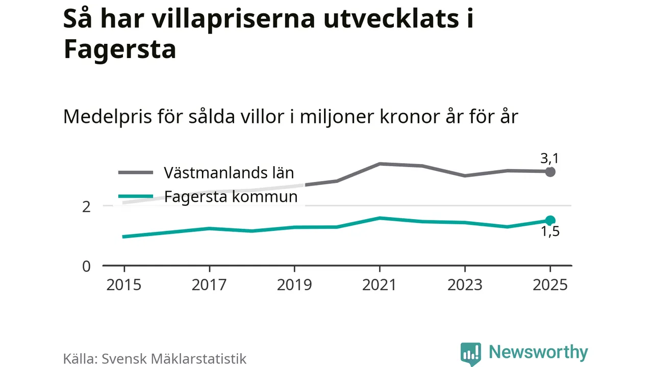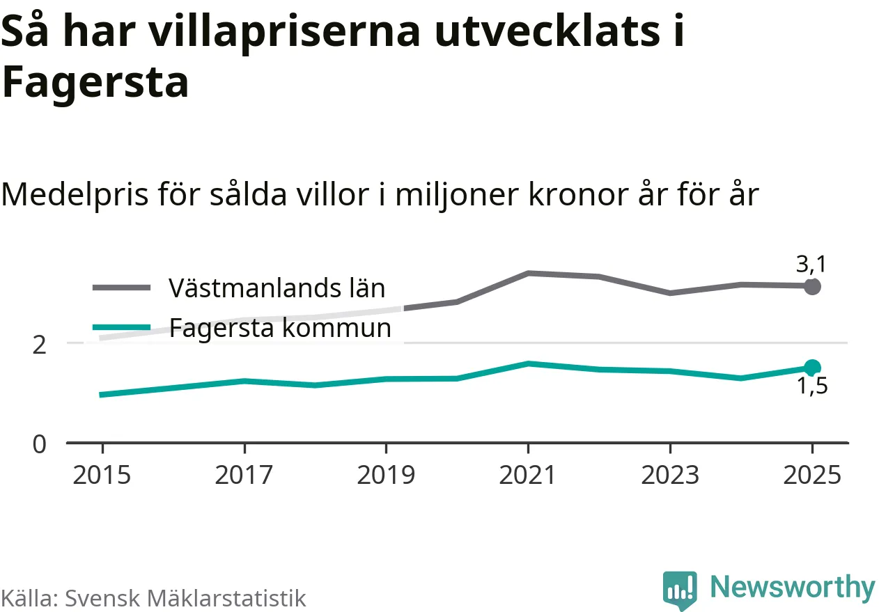 1,5 miljoner kronor är medelpriset för de villor som såldes i Fagersta kommun under året, eller 13 295 kronor per kvadratmeter. Det innebär en prisökning med 16 procent på ett år.