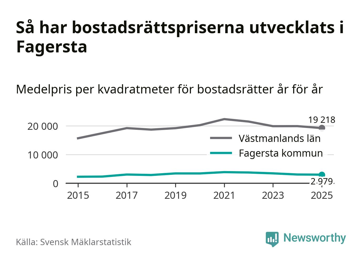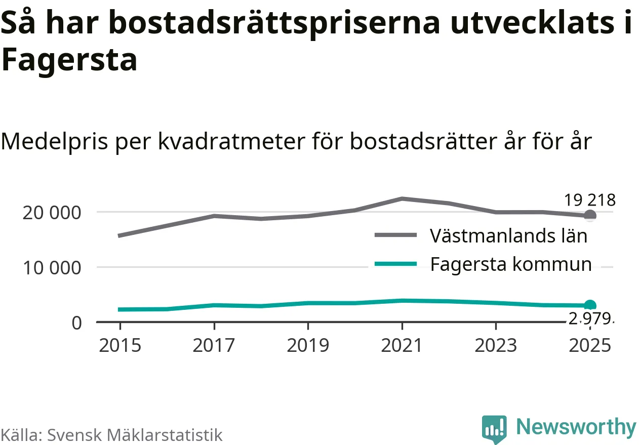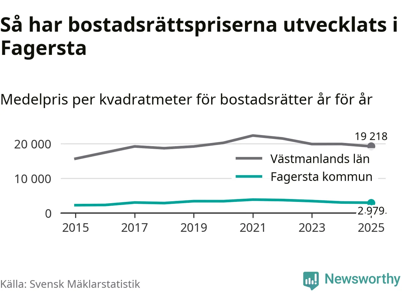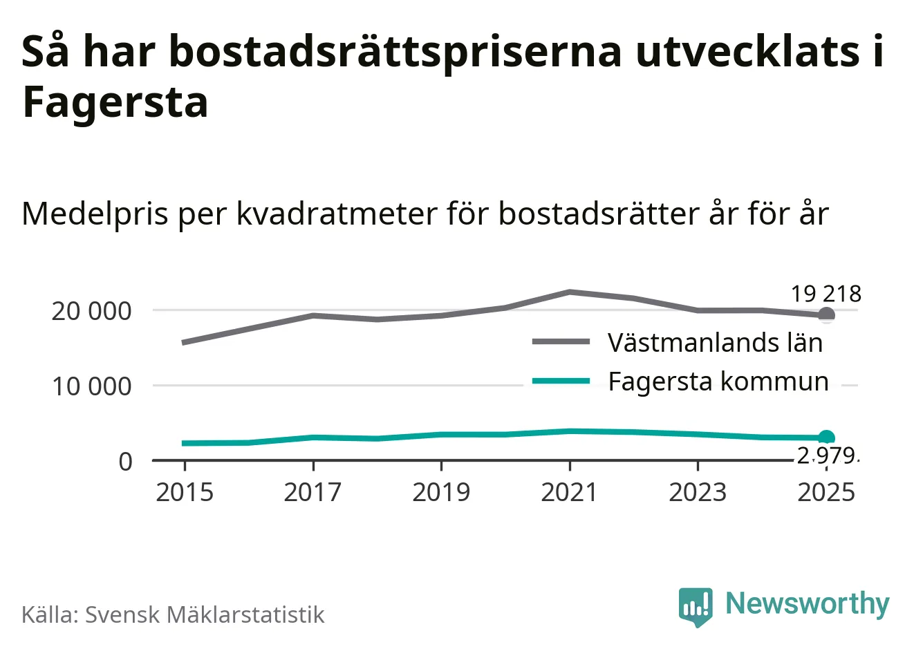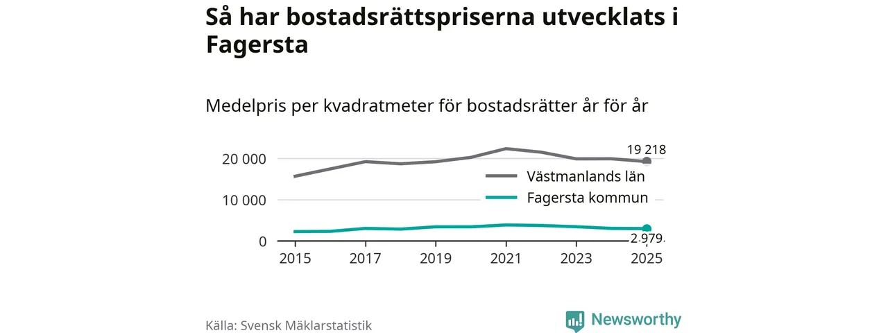 Det såldes totalt 138 bostadsrätter i Fagersta kommun under året. Genomsnittspriset per kvadratmeter landade på 2 979 kronor. Det är en minskning med två procent i kommunen på ett år.