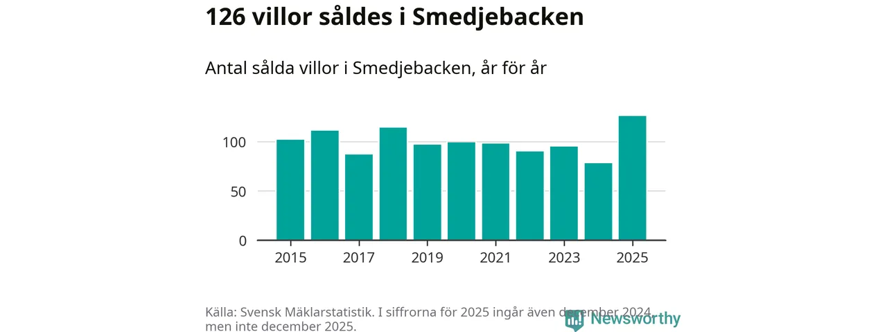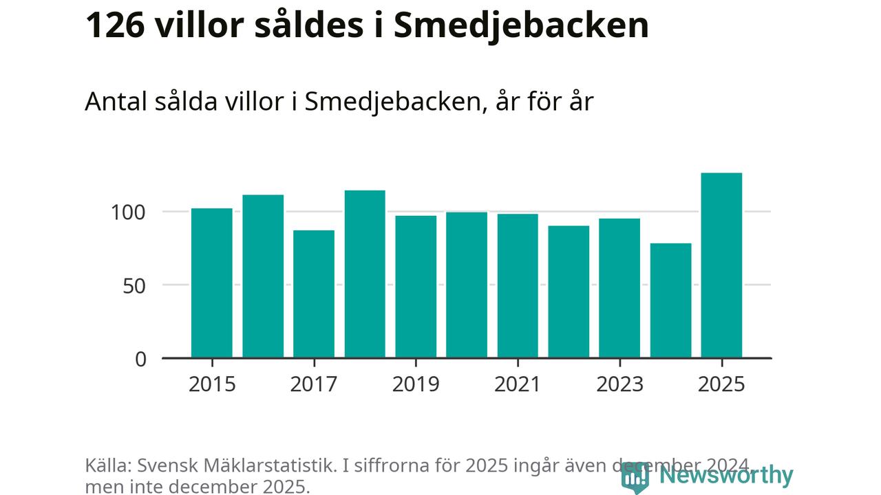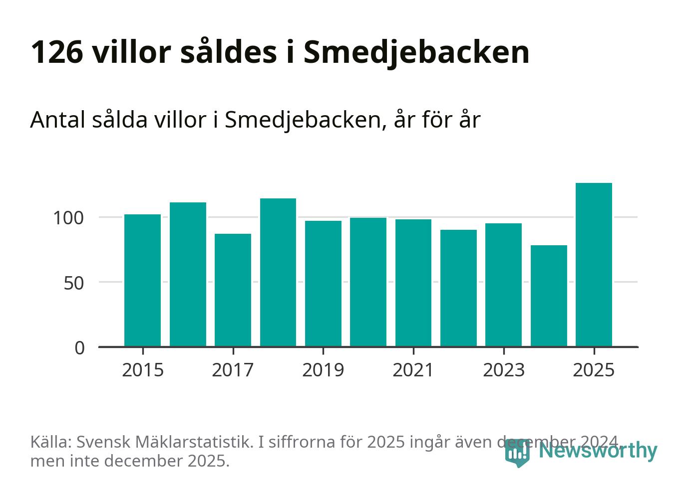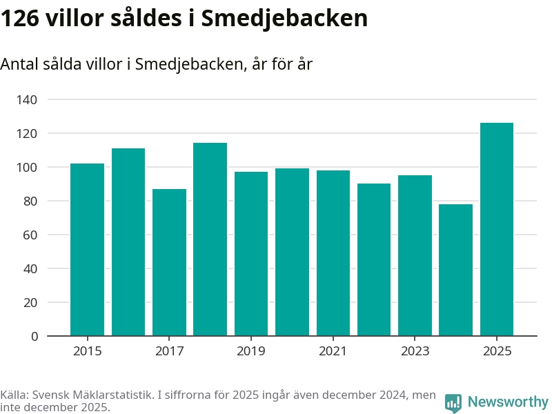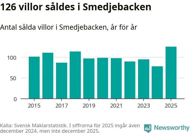 Antalet sålda villor ökade också. Totalt såldes 126 villor, att jämföra med 78 under 2024. Det är fler än något annat år sedan 2015.