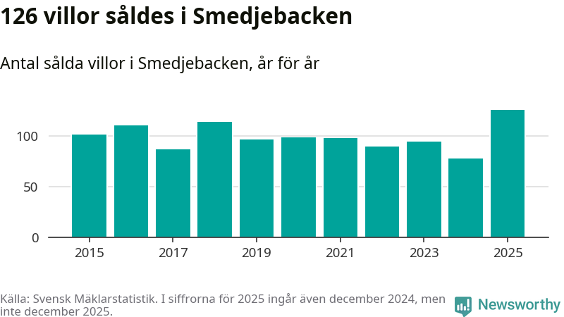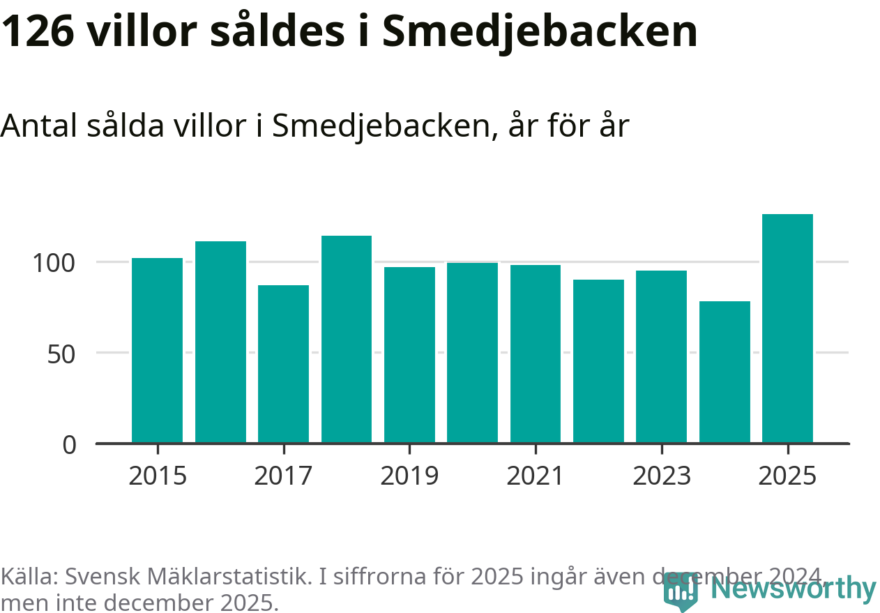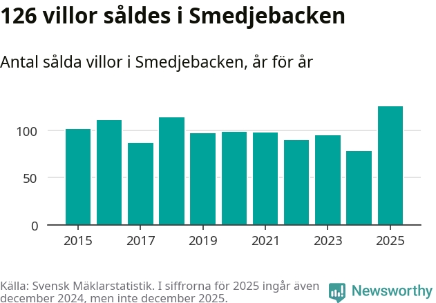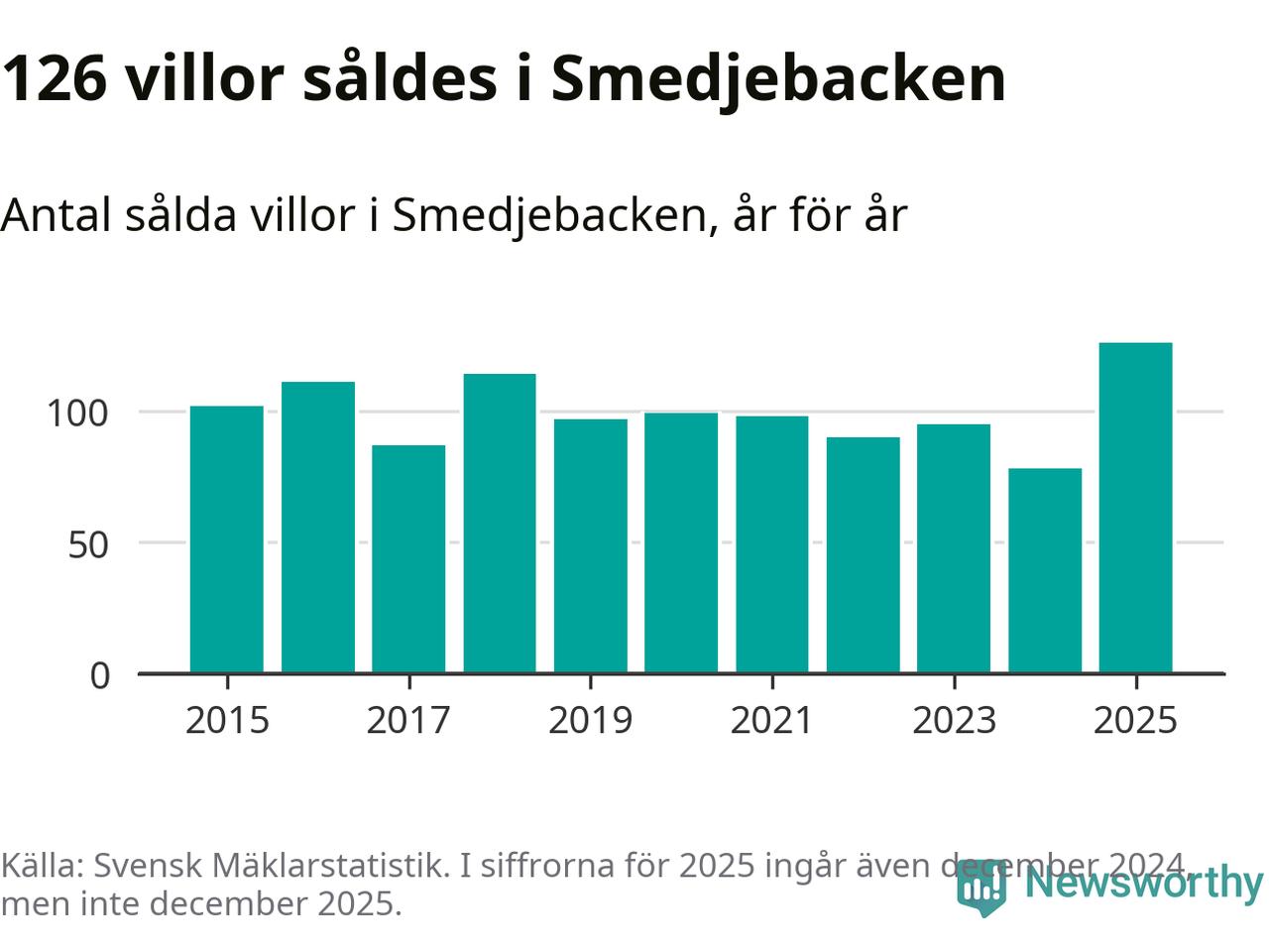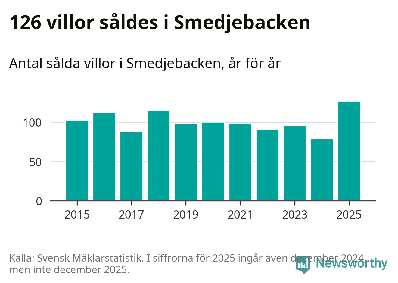 Antalet sålda villor ökade också. Totalt såldes 126 villor, att jämföra med 78 under 2024. Det är fler än något annat år sedan 2015.
