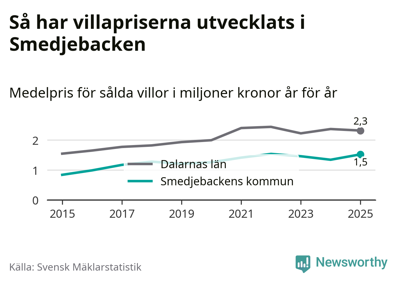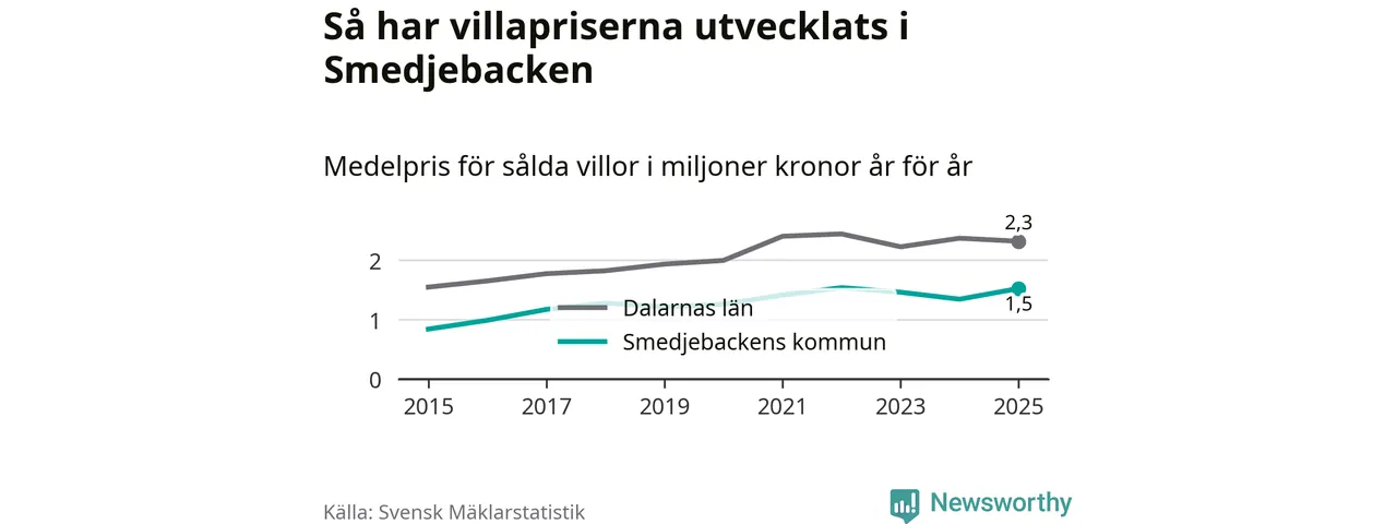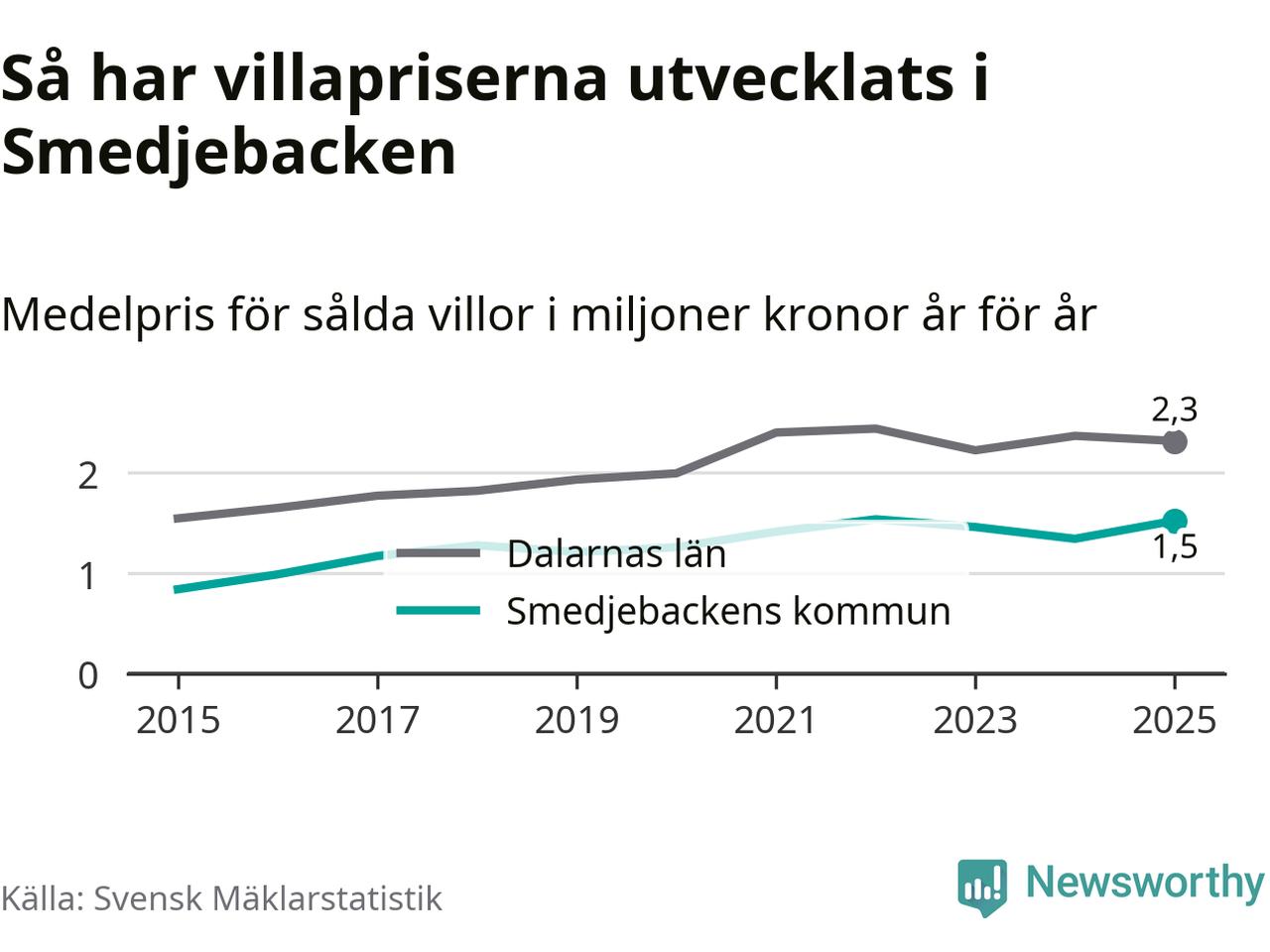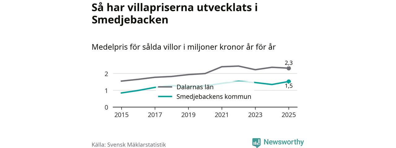 1,5 miljoner kronor är medelpriset för de villor som såldes i Smedjebackens kommun under året, eller 13 488 kronor per kvadratmeter. Det innebär en prisökning med 13 procent på ett år.