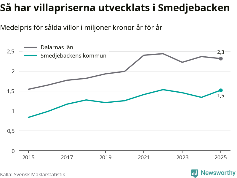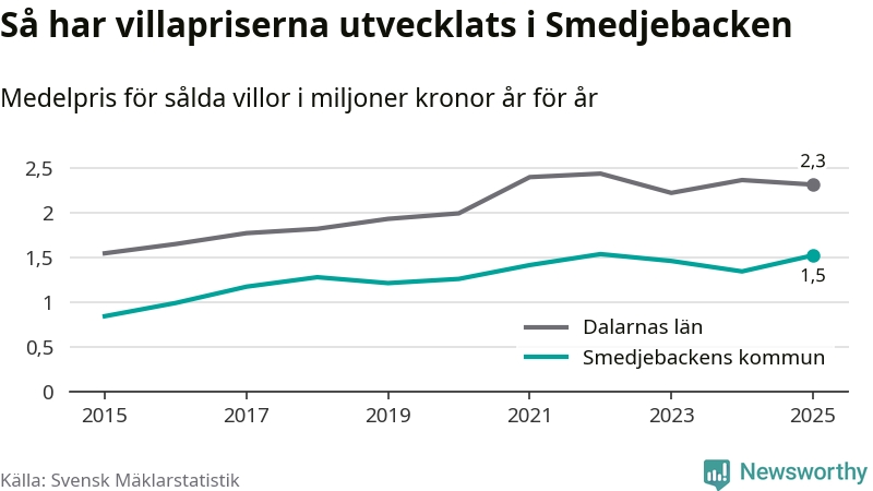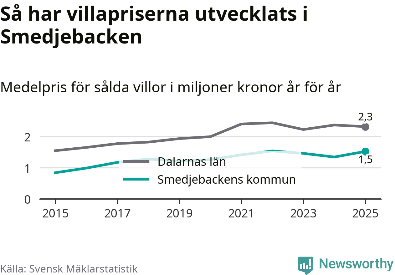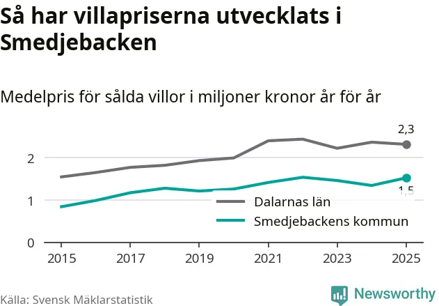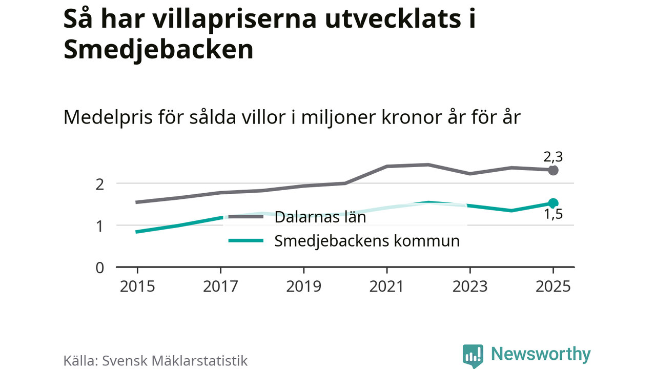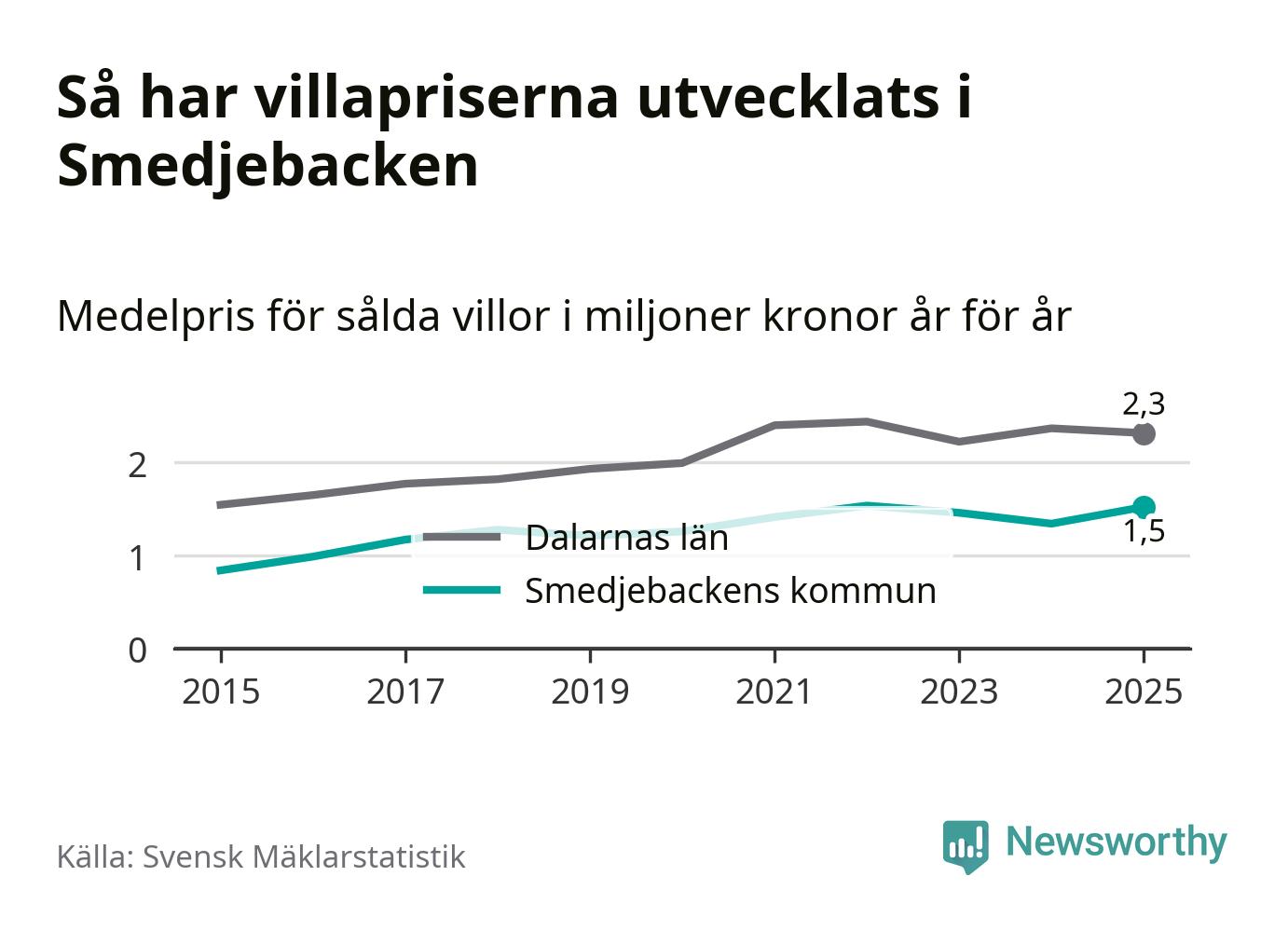 1,5 miljoner kronor är medelpriset för de villor som såldes i Smedjebackens kommun under året, eller 13 488 kronor per kvadratmeter. Det innebär en prisökning med 13 procent på ett år.
