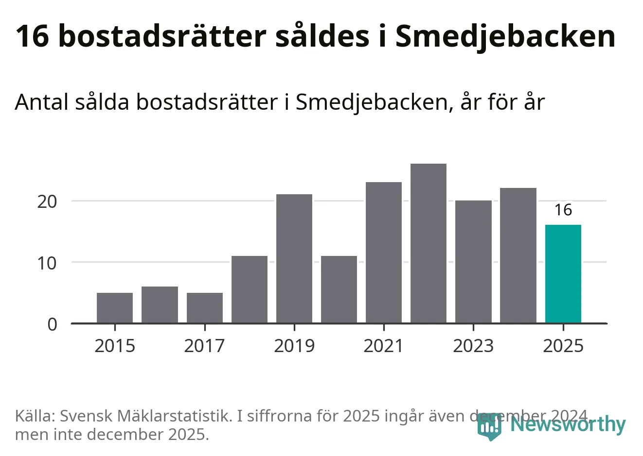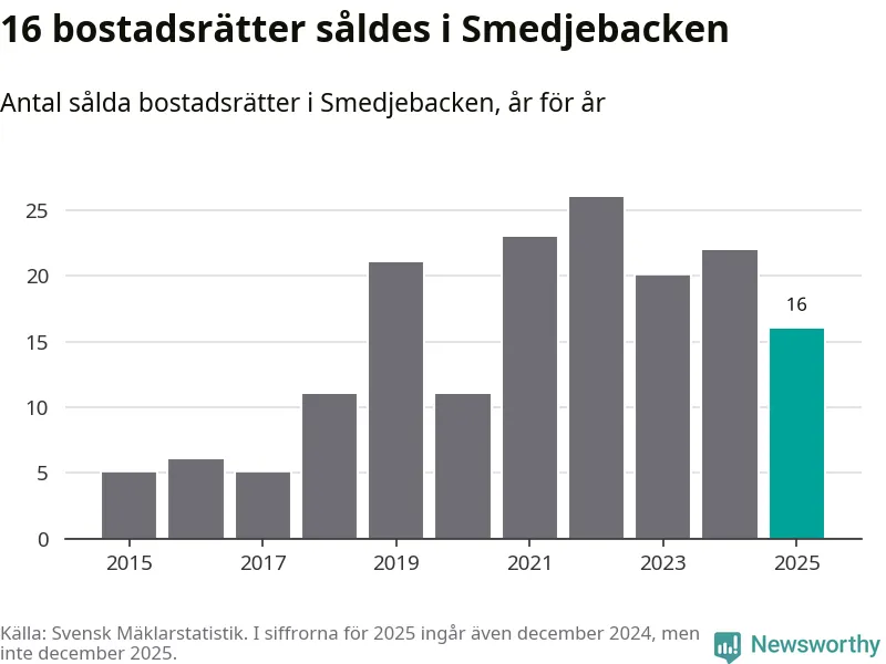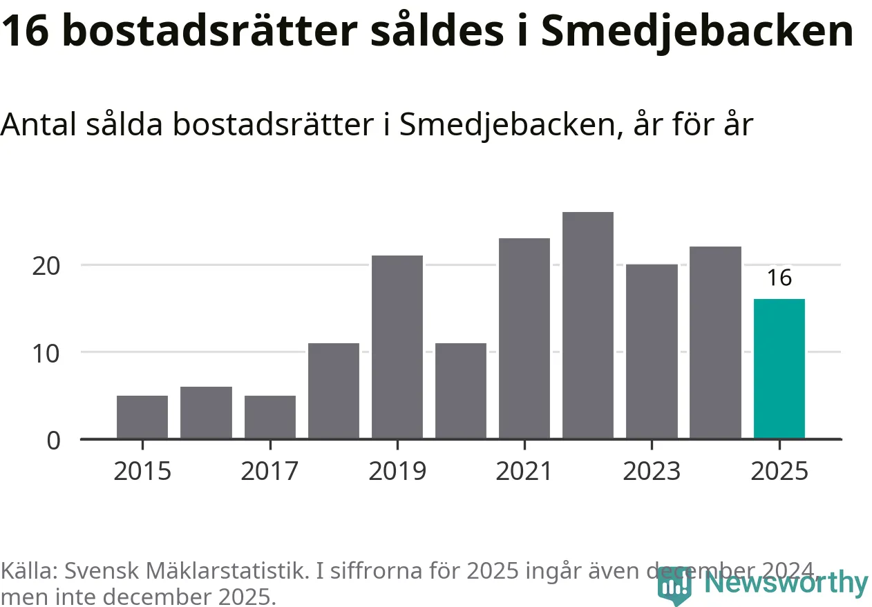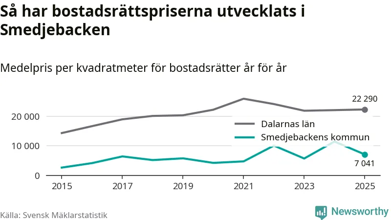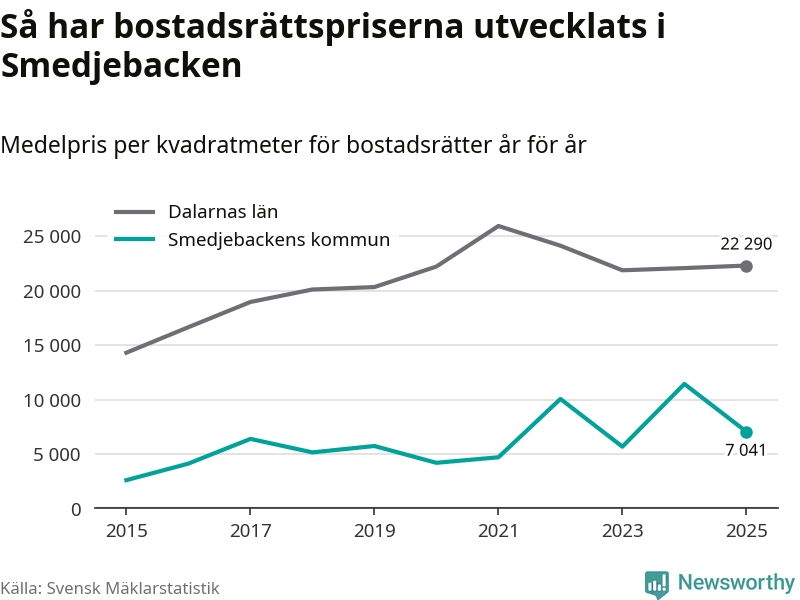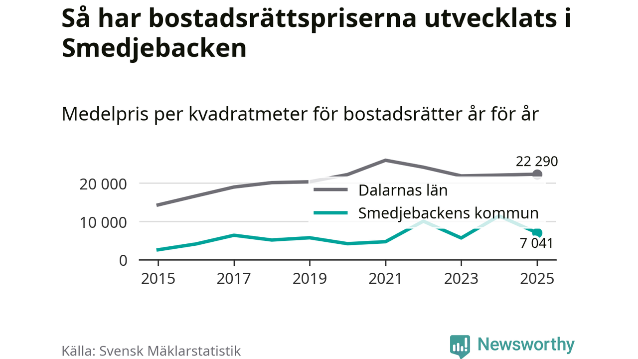 När det gäller bostadsrätter i Smedjebackens kommun såldes 16 under året. Snittet per kvadratmeter landade på omkring 7 000 kronor. Det är en minskning jämfört med förra året.