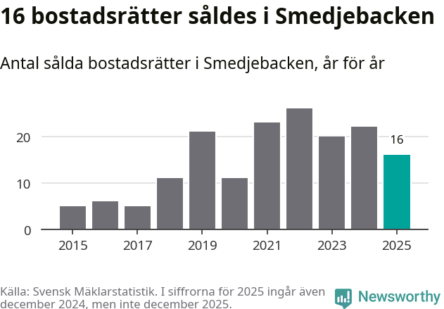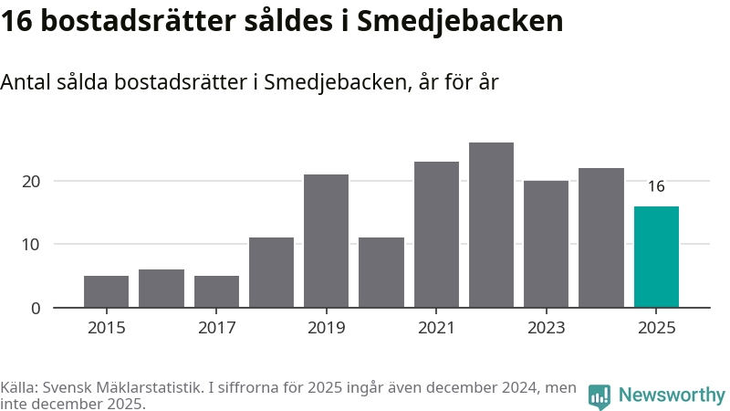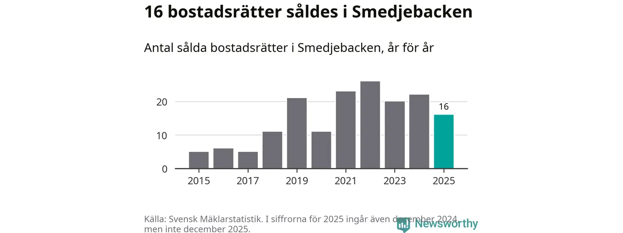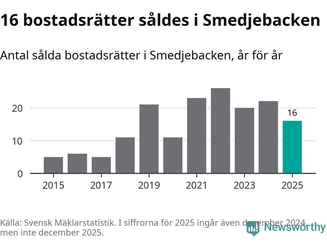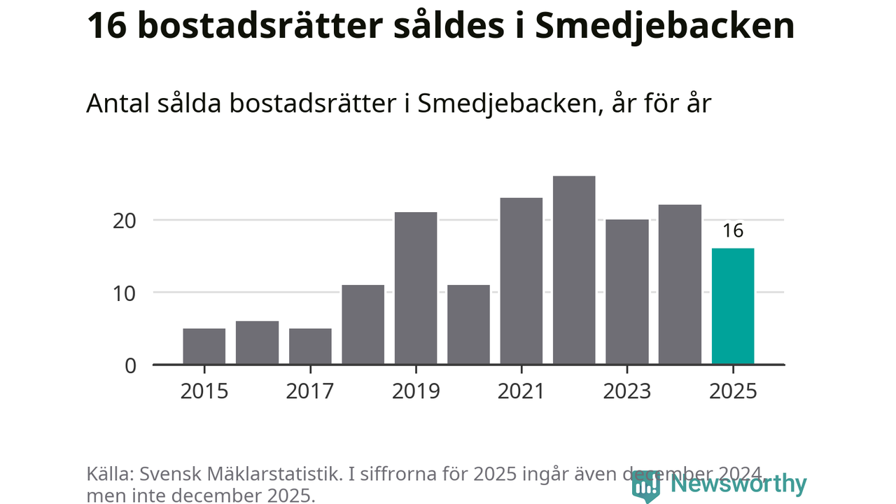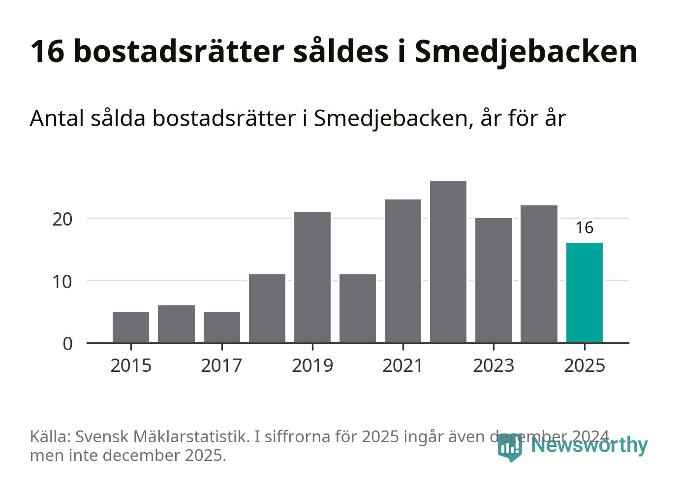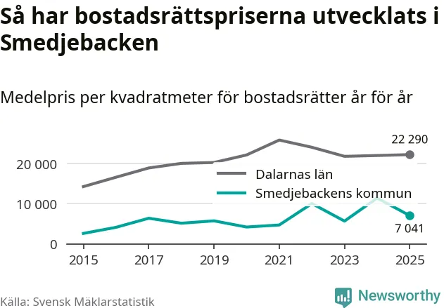 När det gäller bostadsrätter i Smedjebackens kommun såldes 16 under året. Snittet per kvadratmeter landade på omkring 7 000 kronor. Det är en minskning jämfört med förra året.